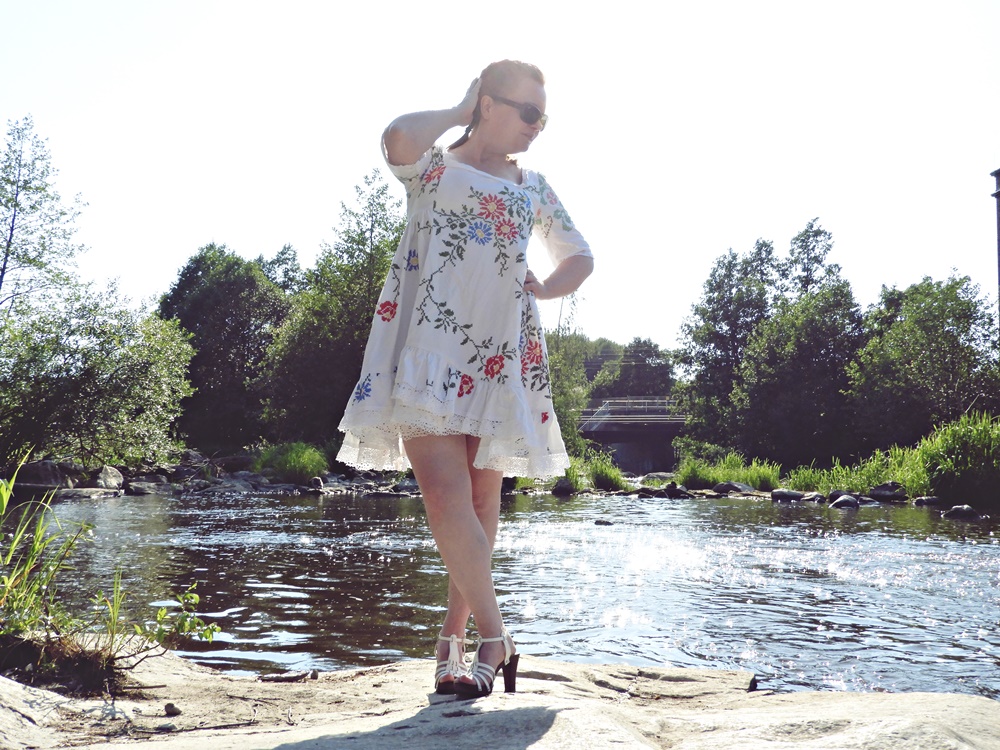 Pöytäliinoista mekko, niistä käsin kirjailuista pöytäliinoista. Ihana mekko, jossa käytin Burda 8/08 tunikan kaavaa. Muokkasin kaavaa aika paljon, jotta sain siitä sopivanlaisen itselleni. Isot pöytäliinat taas hankin viime kesänä Tammisaaren kirpparilta, maksoivat vaivaiset 1€. Toki olivat tahrojen peittämät, mutta ne lähtivät hienosti sappisaippualla.