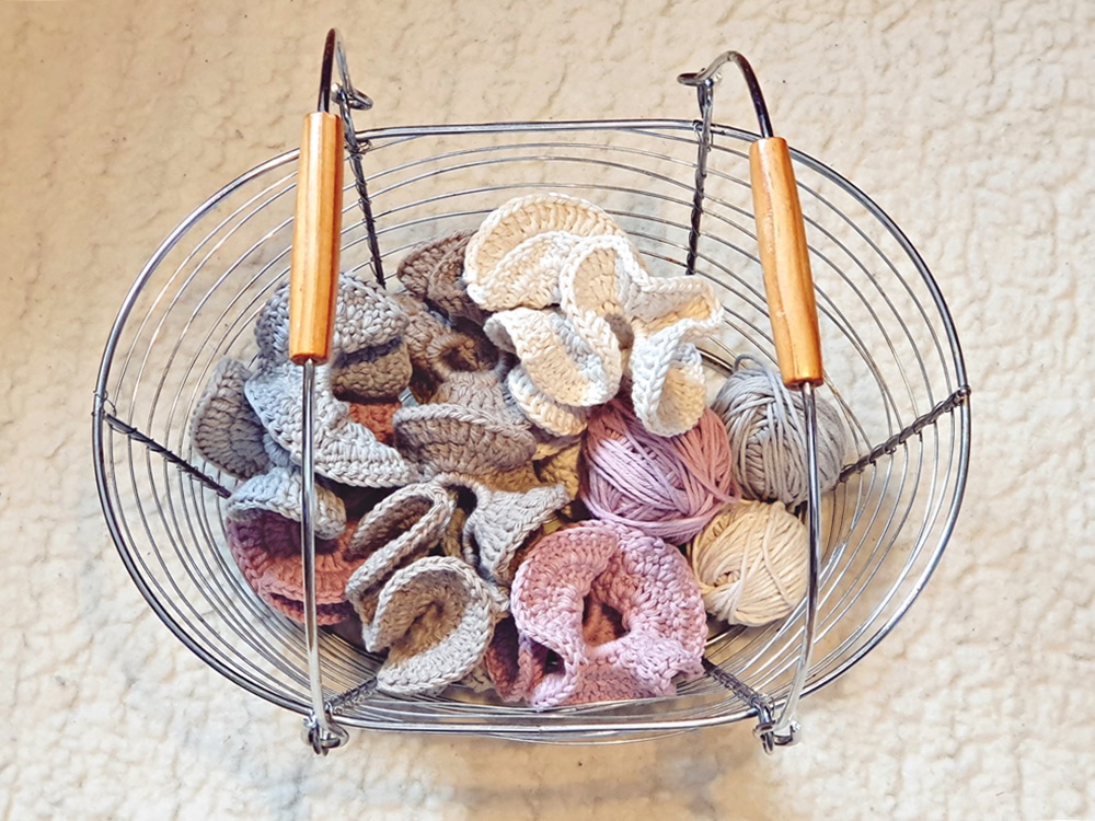 Kesällä sitten päätin kokeilla pystyykö niitä hyödyntämään hiusdonitsin pohjana ja kyllä vain pystyy, jee siis. Koska en kaikkia jaksanutkaan heti tehdä, niin eilen toipilaana kaivoin keskeneräisiä töitä esille ja aloin virkkailemaan ja ompelemaan kovalla tohinalla töitä valmiiksi. Olen aika tyytyväinen tähän nyt ja voin luvata, että hiusdonitsit riittää, en tee näitä kyllä enempää, ainakaan hetkeen.