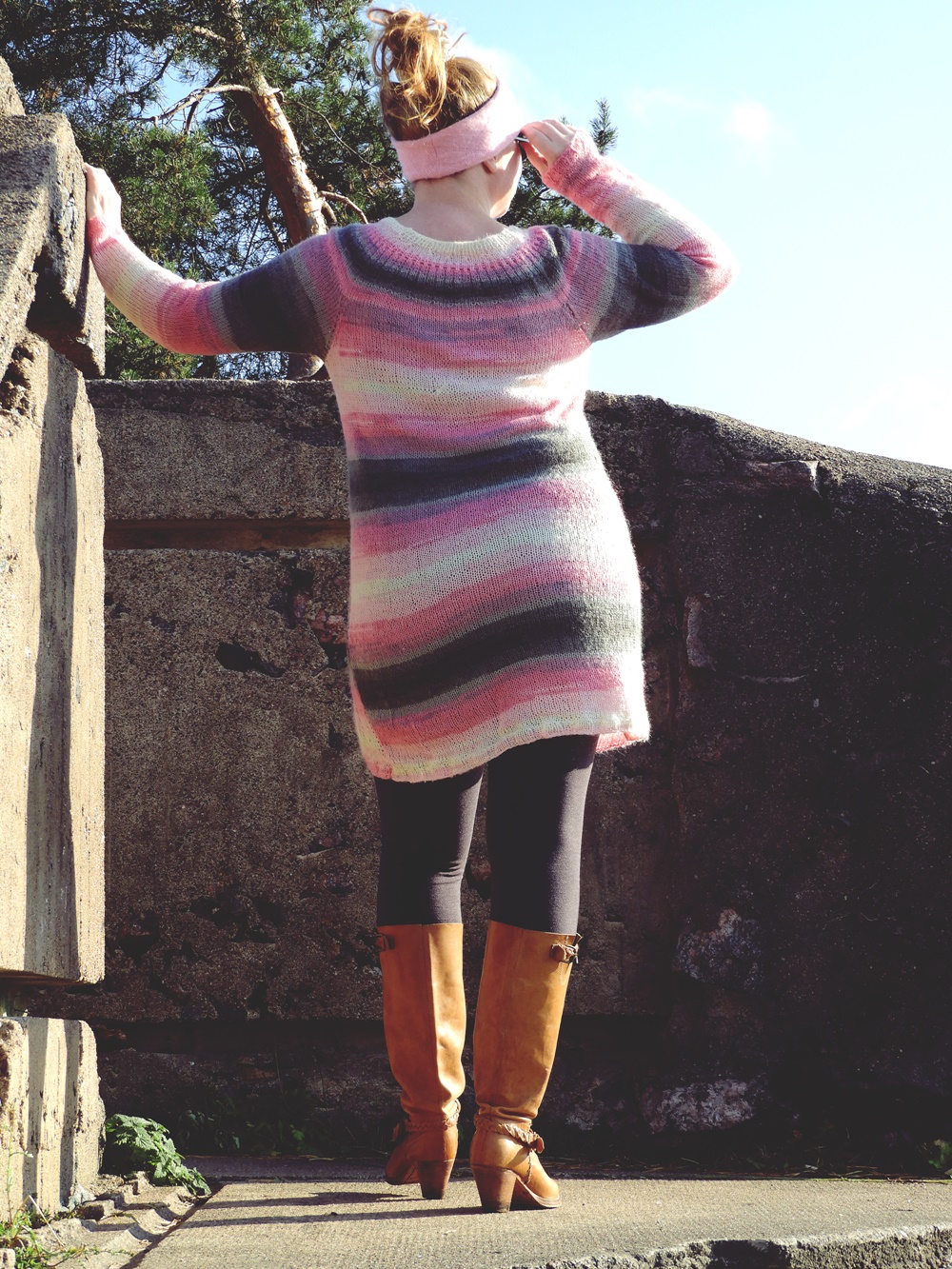 Tämä paita on kevyt kuin pinkin hattaran syleily. Niin pehmeä ja kevyt paita. Paidan rentous myös ihastuttaa, se sopii hyvin sunnuntaipäivän riennoille. Korvat saa suojaan pannalla, joka on tehty vanhan villapaidan jämistä. Paidasta tein ensin Söpölle villapaidan ja jämistä sitten pannan itselleni.