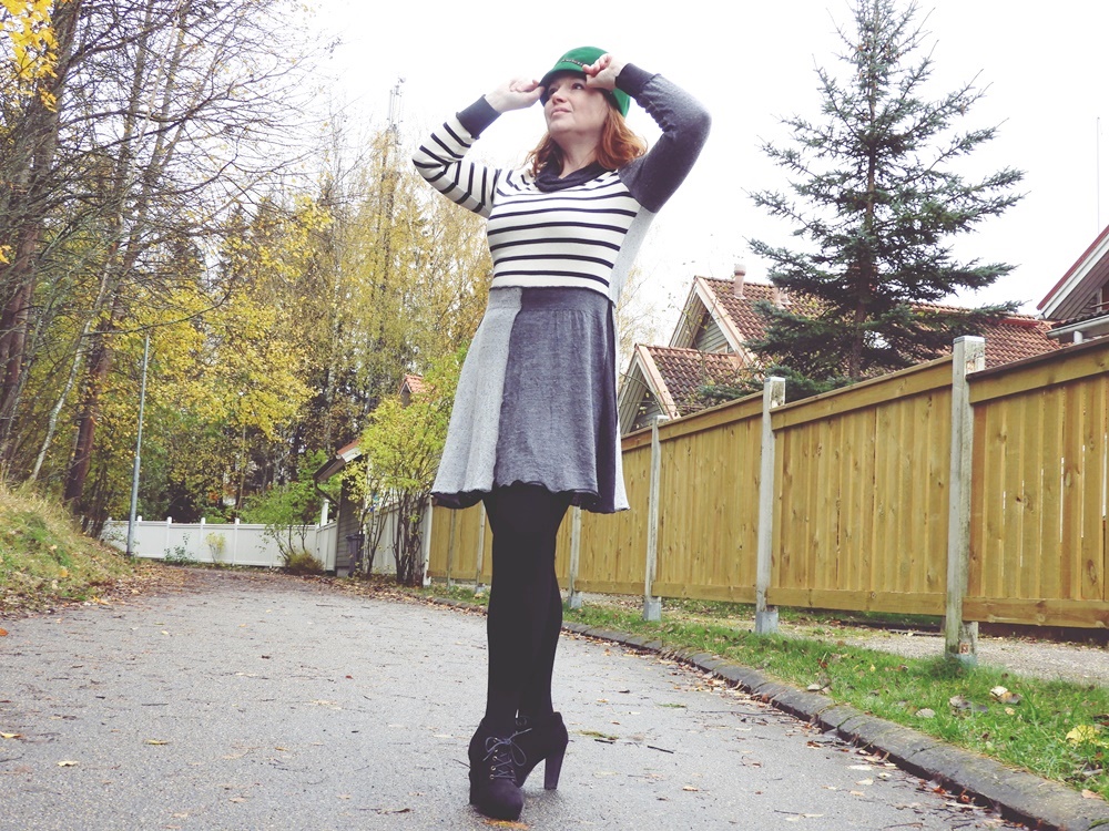 Ohuet neuleet ovat oiva materiaali tuunaukseen. Nämä neuleet olivat myös jostain osin hiukan reikäisiä, joten sakset esiin ja nips naps ja surrur. Niistä tuli yhdessä ihanan tyttömäinen mekko. Ei aina tarvitse olla osat samaa kuviota, hyvin voi yhdistää kaikenlaista toisiinsa.