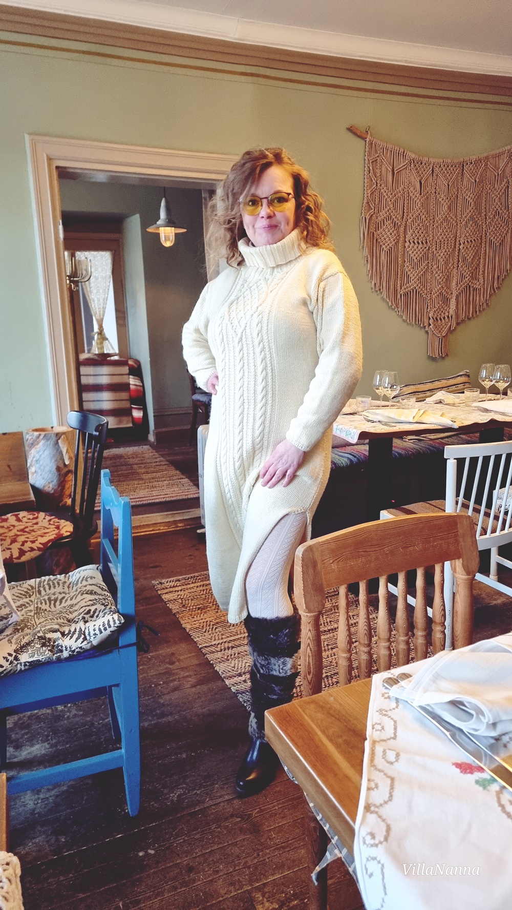 Olen siis neulonut valkoisen villamekkoni joskus 90-luvun puolessa välissä, 7-veljeslangasta ja Novitan ohjeella. En muista mistä. En koskaan käyttänyt mekkoa, kun se oli minulle silloin aivan liian suuri, vaikka neuloin kaikkein pieneimmän koon. Kun menimme naimisiin, niin olin pyöristynyt jo sen verran, että mekko ei ihan liian over size koolta näyttänyt päälläni, joten vetasin sen päälleni ja nyt se on minulle sopiva, kun olen noilta ajoilta lihonnut sen 30kg. Mekko oli kuitenkin nappivalinta ja mekkoa tulen käyttämään useamminkin tästä lähtien.
