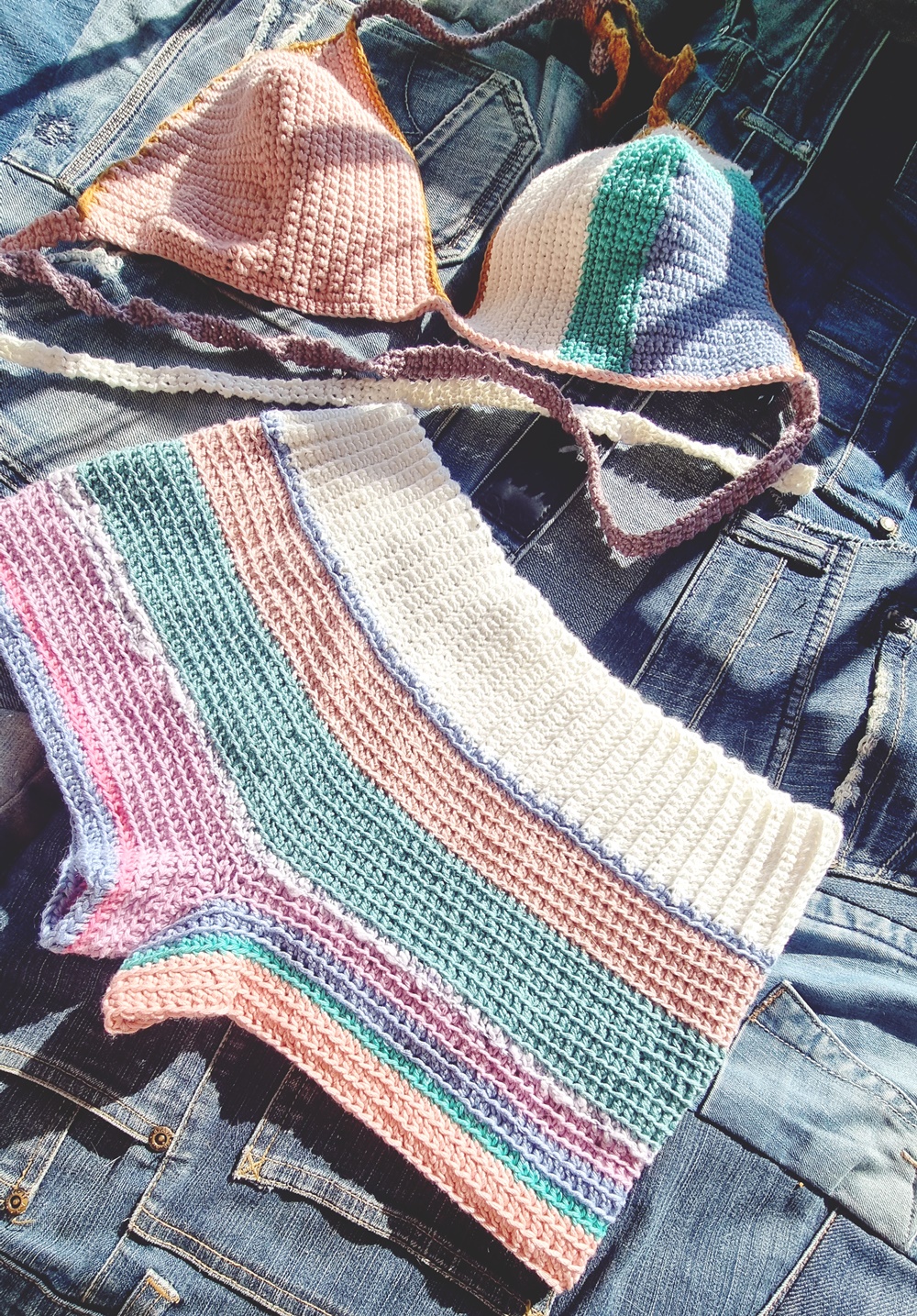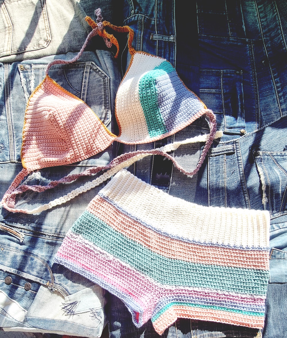 Virkattu shortsibikiniasu kuuluu jokaisen vaatekaappiin. Minusta nyt ainakin. Tämä bikinishortsiasu on valmistettu kierrätyslangoista, joita on jäänyt mekko projektista yli viime vuodelta. Vielä olisi näitä samaisia lankoja kassillinen jäljellä, joten jotain on niistä vielä tehtävä, jotteivat jää pölyttymään koreihin.