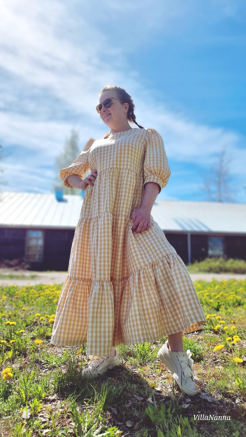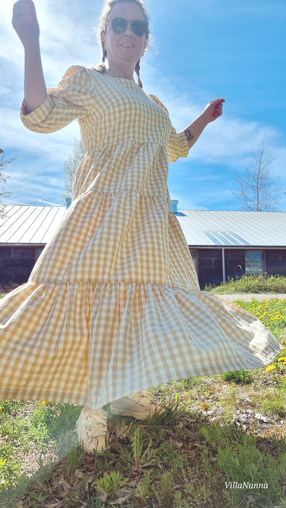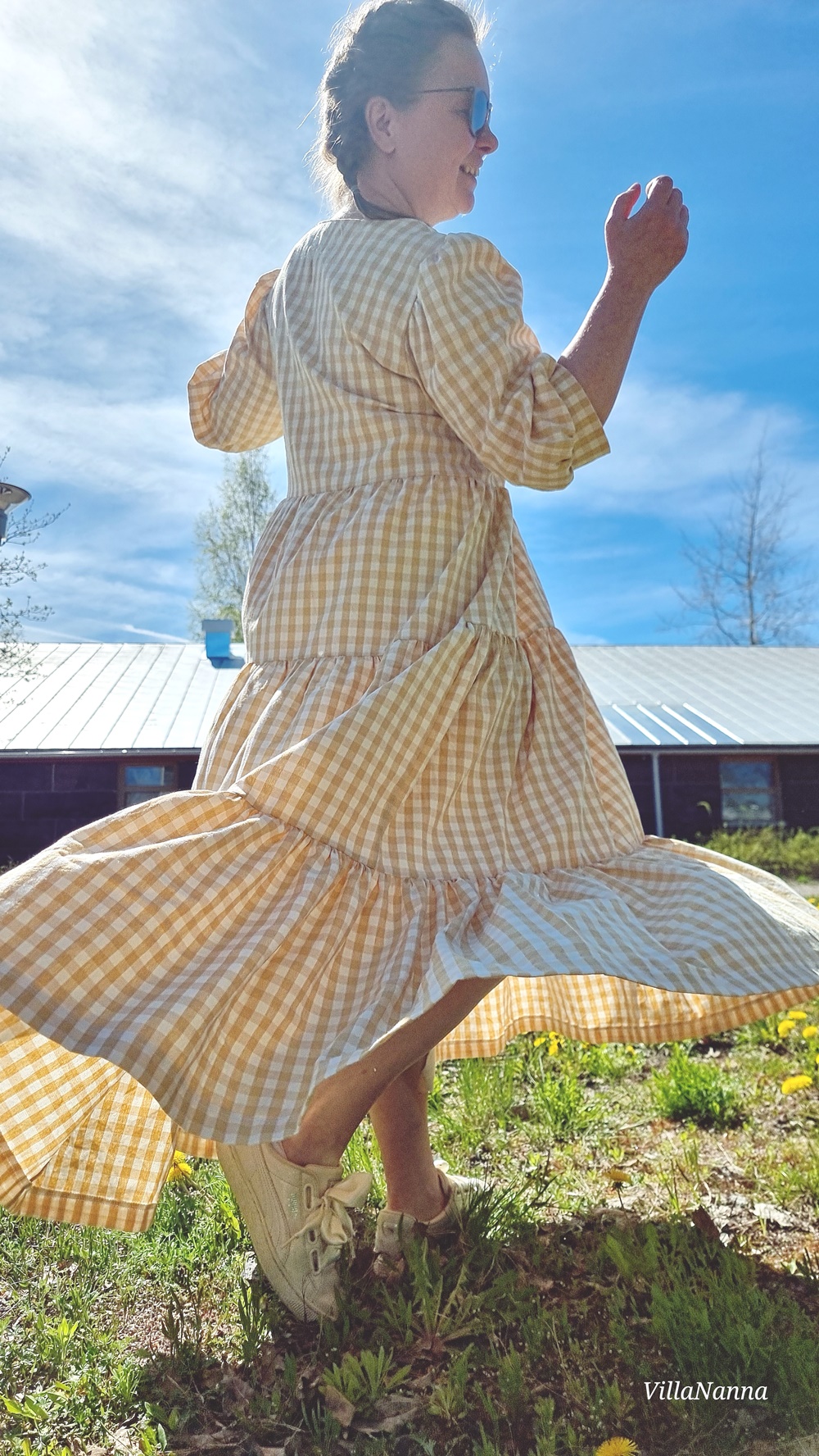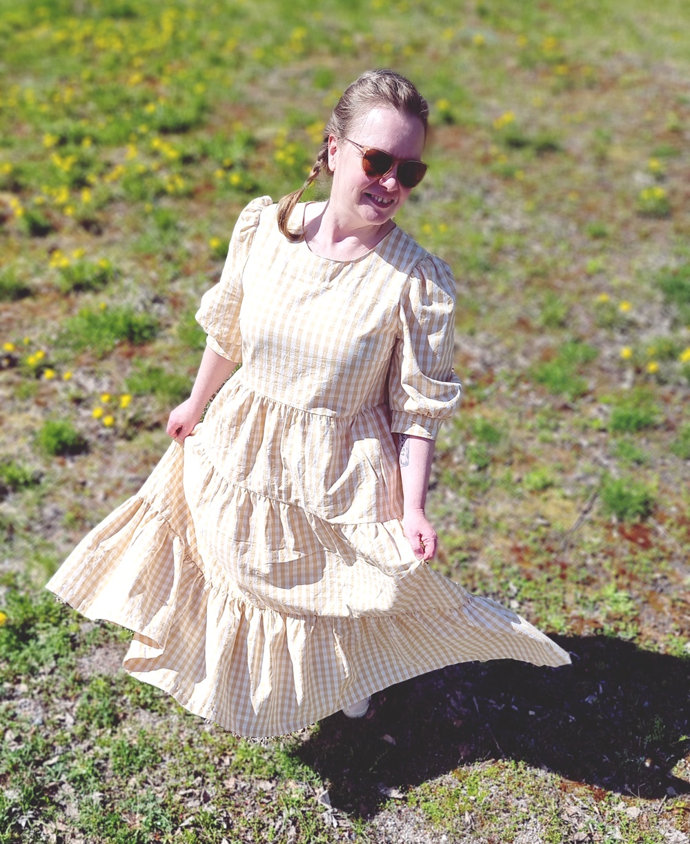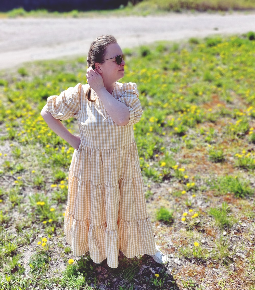 Materiaali onkin Kierrätyskeskuksen Näpräosaston materiaalitukusta ja tästä materiaalista on valmistettu kaksi mekkoa. Molemmat Mekkotehtaan kaavoilla tietenkin. Koska kangasta oli paljon, päätin tehdä tästä uusimmasta Saanasta maksimittaisen. Ja vaikka olen tällainen lyhyenläntä, niin mekko toimii silti minulla oikein hyvin. Mekossa on kaikki se mistä pidän, on ruutua, puhvihihaa ja rypytystä ja kerroksia. Helmassa paljon volyymia, joka hulmuaa kivasti tuulessa. Tunnen olevani kuin suoraan jostain satojen vuosien takaa.