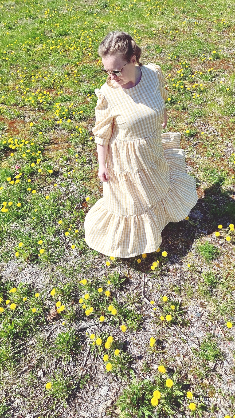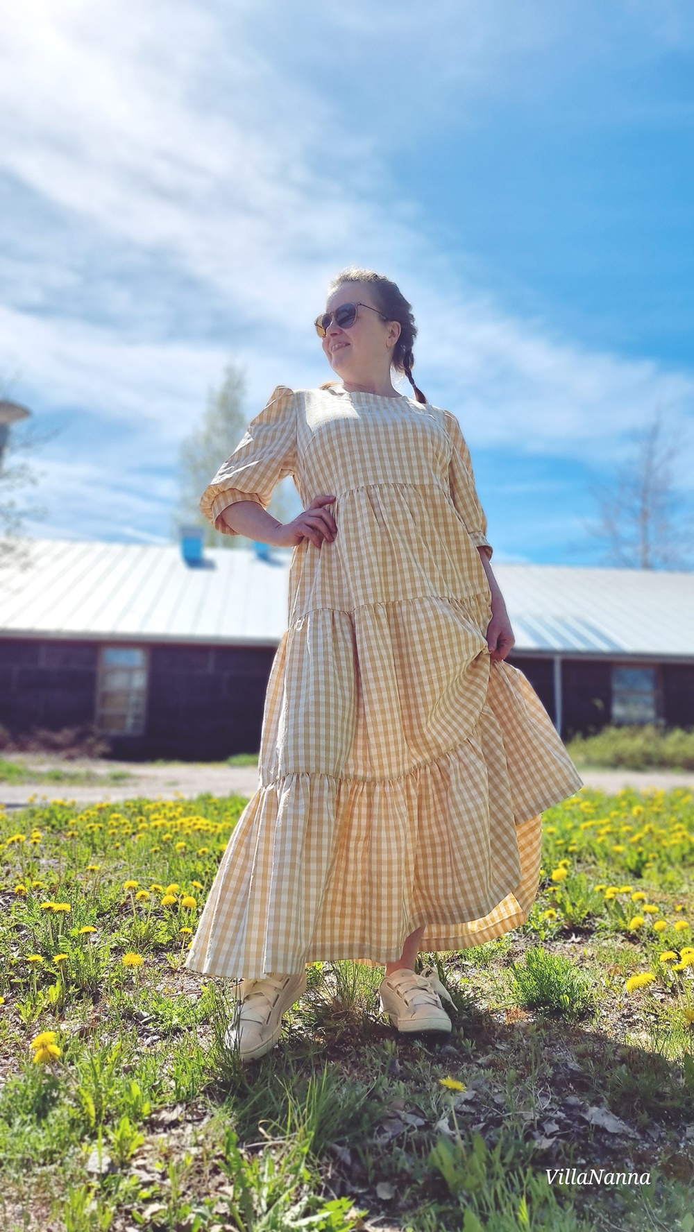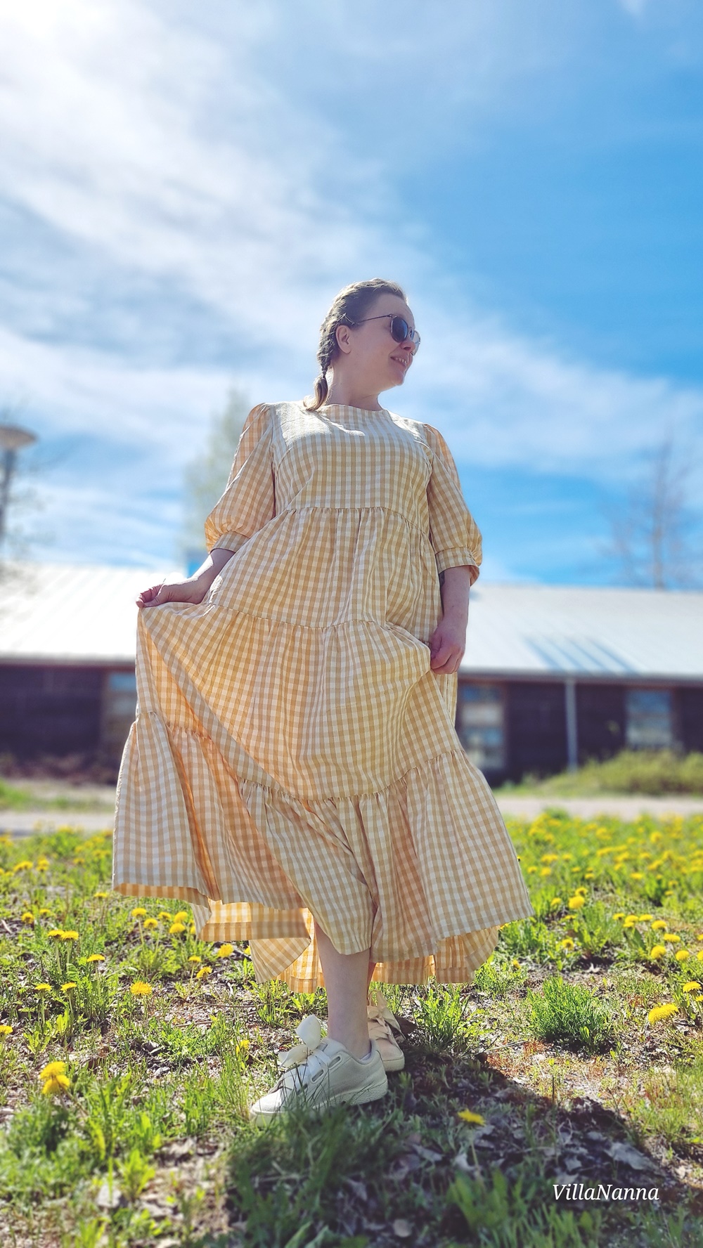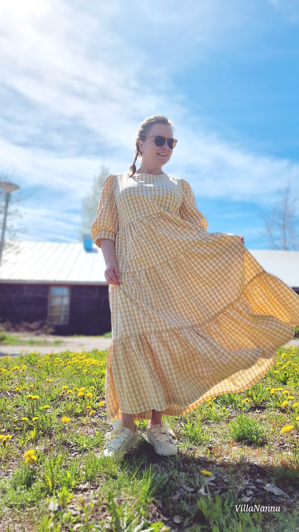 Materiaali onkin Kierrätyskeskuksen Näpräosaston materiaalitukusta ja tästä materiaalista on valmistettu kaksi mekkoa. Molemmat Mekkotehtaan kaavoilla tietenkin. Koska kangasta oli paljon, päätin tehdä tästä uusimmasta Saanasta maksimittaisen. Ja vaikka olen tällainen lyhyenläntä, niin mekko toimii silti minulla oikein hyvin. Mekossa on kaikki se mistä pidän, on ruutua, puhvihihaa ja rypytystä ja kerroksia. Helmassa paljon volyymia, joka hulmuaa kivasti tuulessa. Tunnen olevani kuin suoraan jostain satojen vuosien takaa.