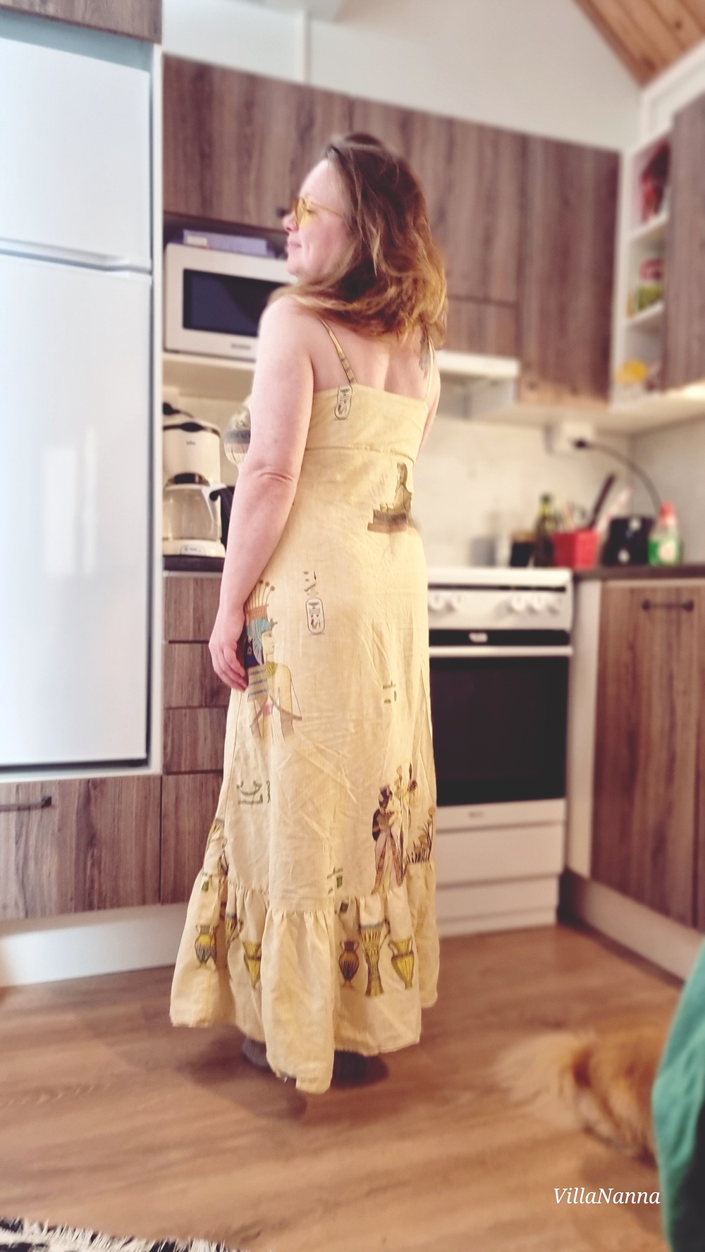 Tälle reissulle tein lakanasta yöpuvun ihan tarkoituksella. Lakana on todella vanha, olen ostanut sen joskus 90 -luvulla ja nyt siitä tuli yöpuku, lakana saa näin hyvin jatkoaikaa. Loput lakanan palat jätin töihin nuorille käytettäväksi. Materiaali sopii hyvin yöpuvuksi, sillä se on ihanan pehmeää, helppo nukkua eikä rahnuta ihoa rikki mistään.