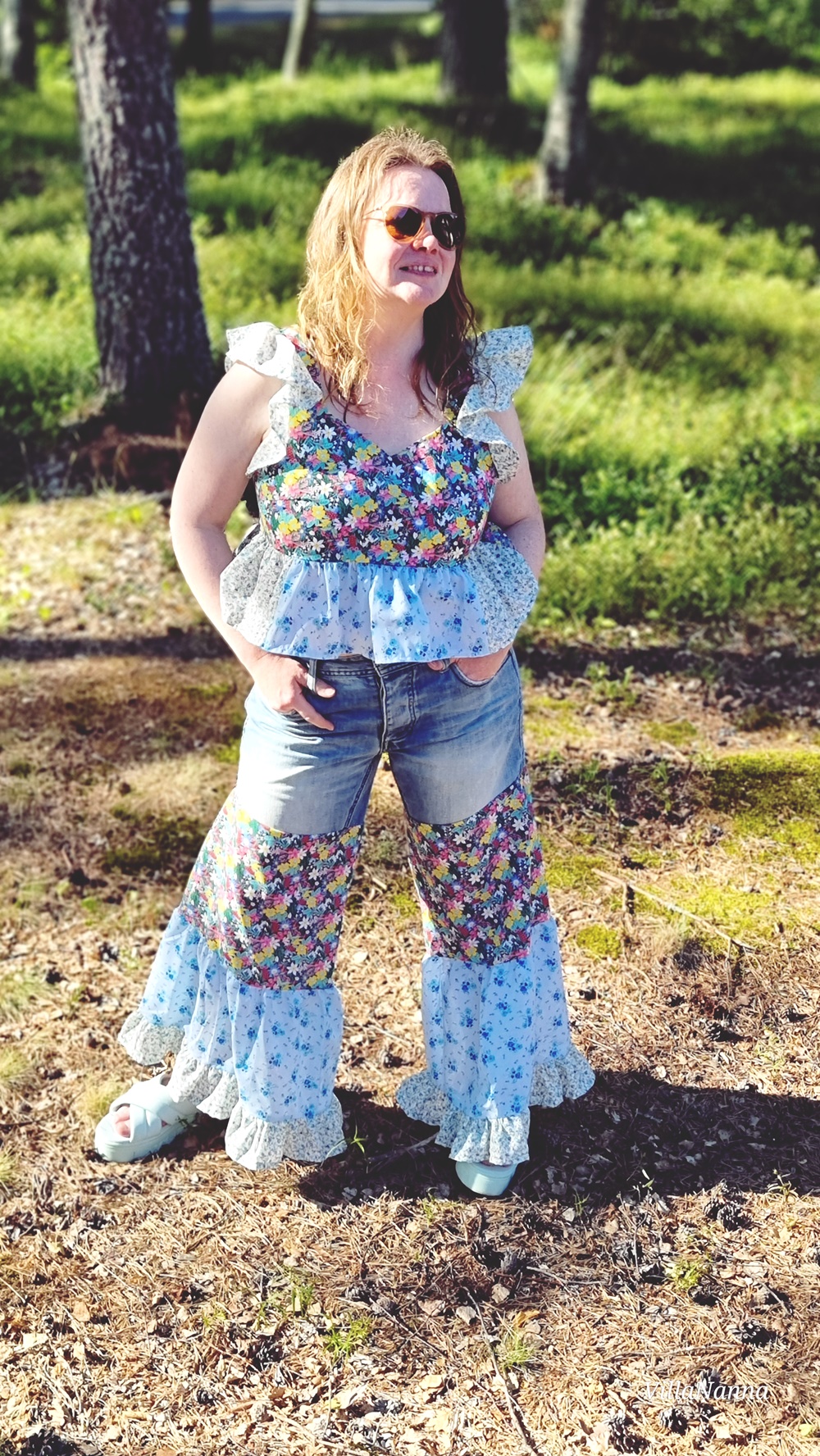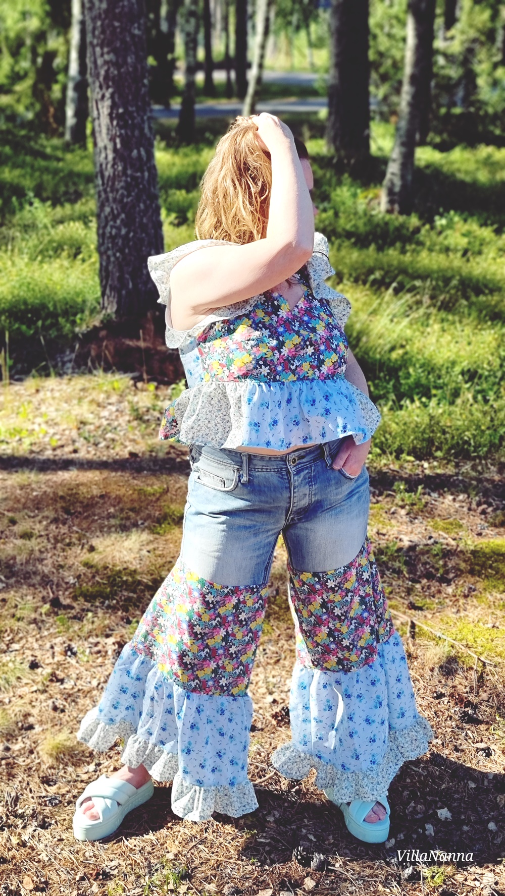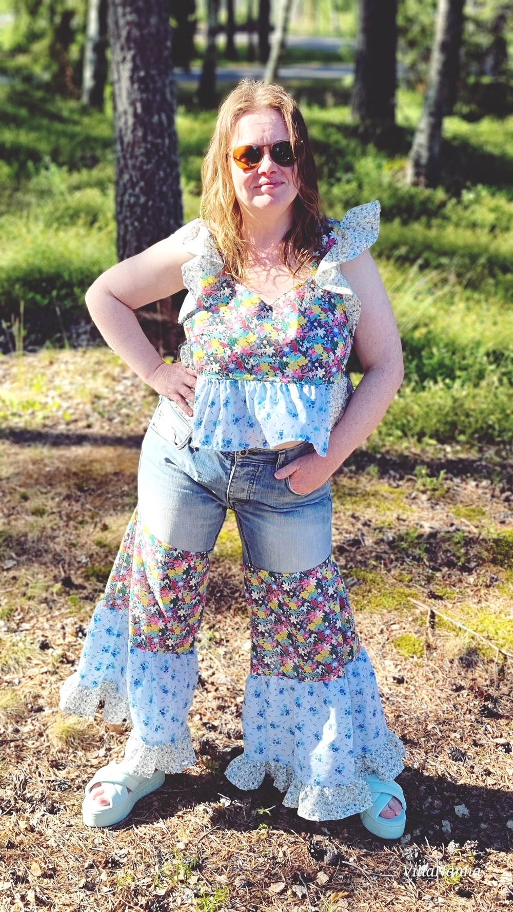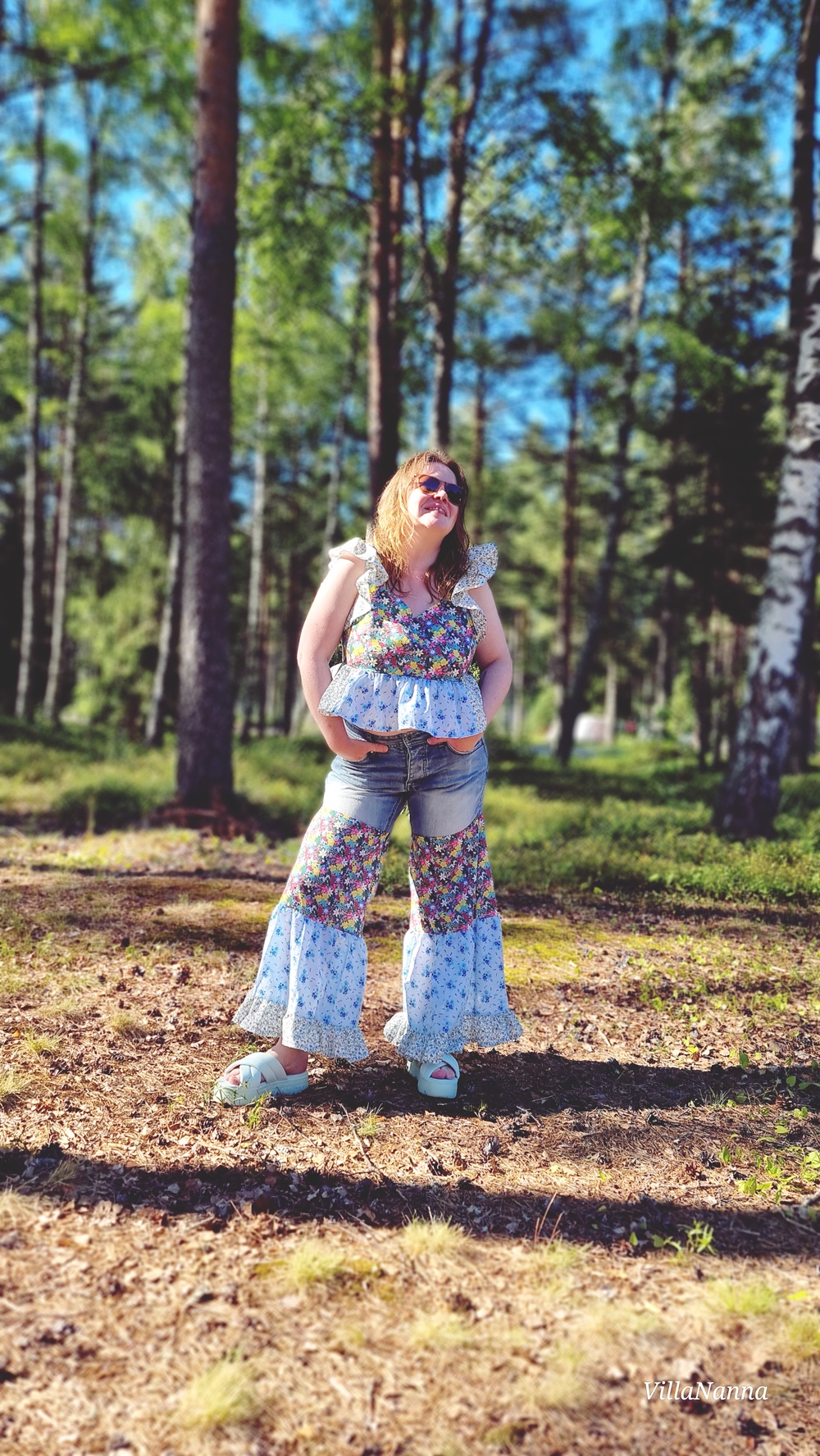 Hyvä idea, varmasti kevyet ja ilmavat näin kesällä ja sopii festareille 😊 Farkuista tulee mieleen omat teini vuodet, löysin tuolloin kirppikseltä samantyyliset, pääosin farkut, mutta lahkeisiin oli ommeltu kangastilkuista leveät lahkeet. Niillä housuilla ja lyhyeksi leikatuilla räikeän pinkeillä hiuksilla säväytin aloittaessa ysi luokan uudessa koulussa 😅