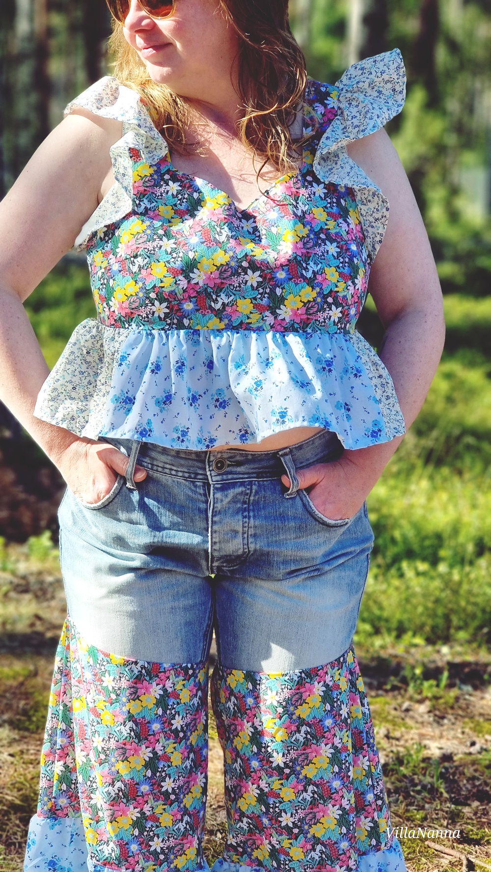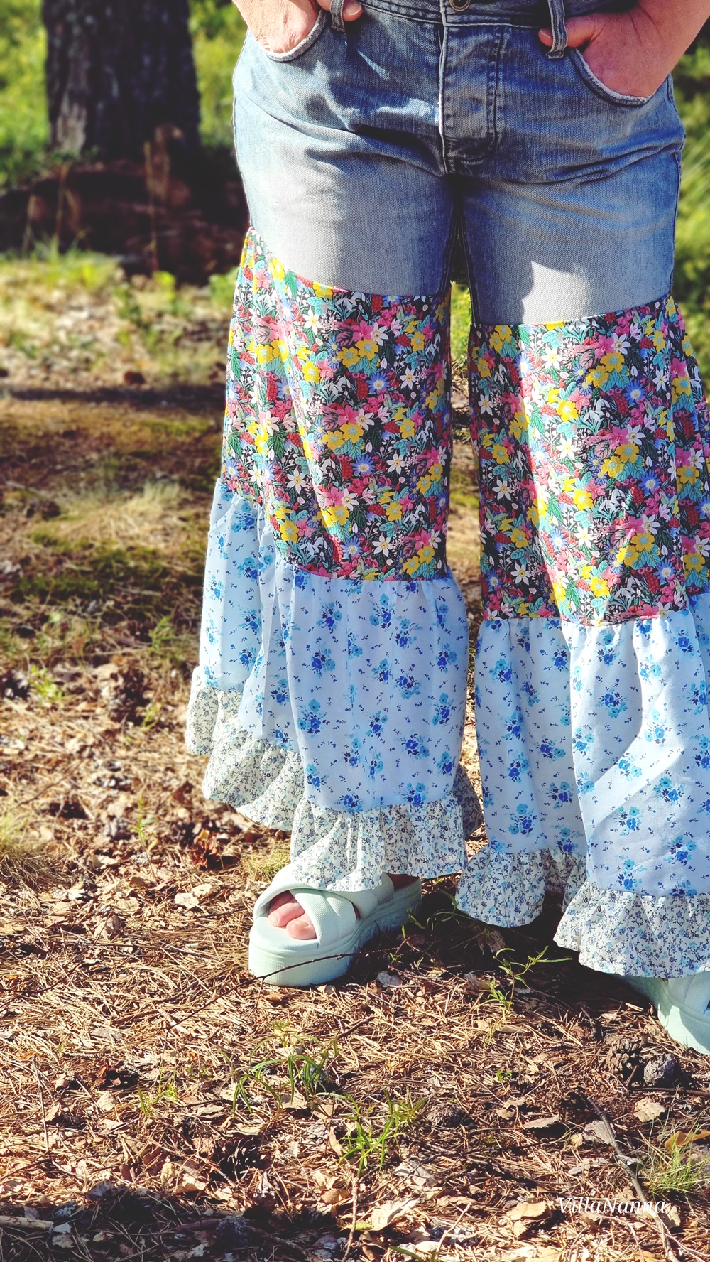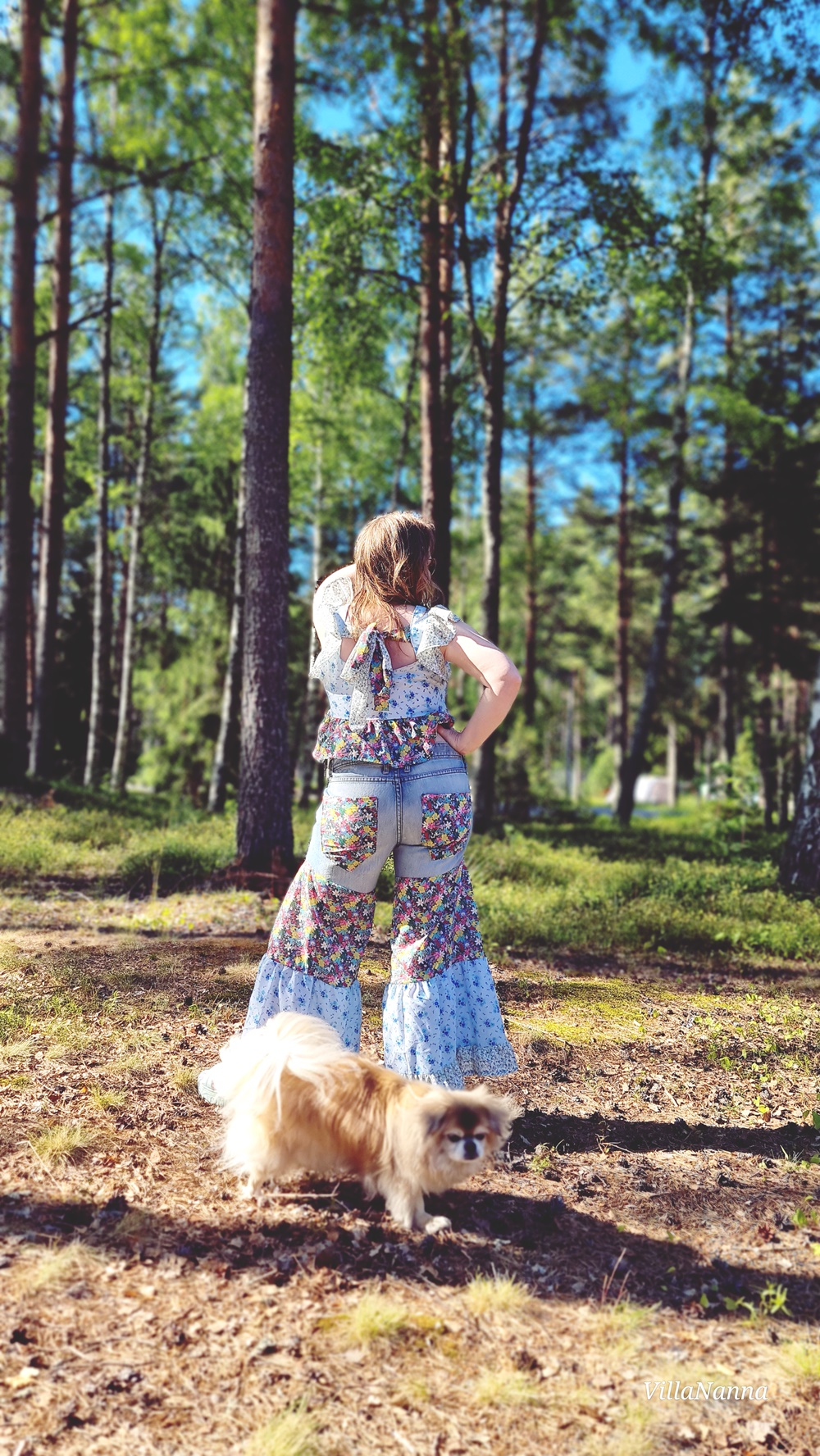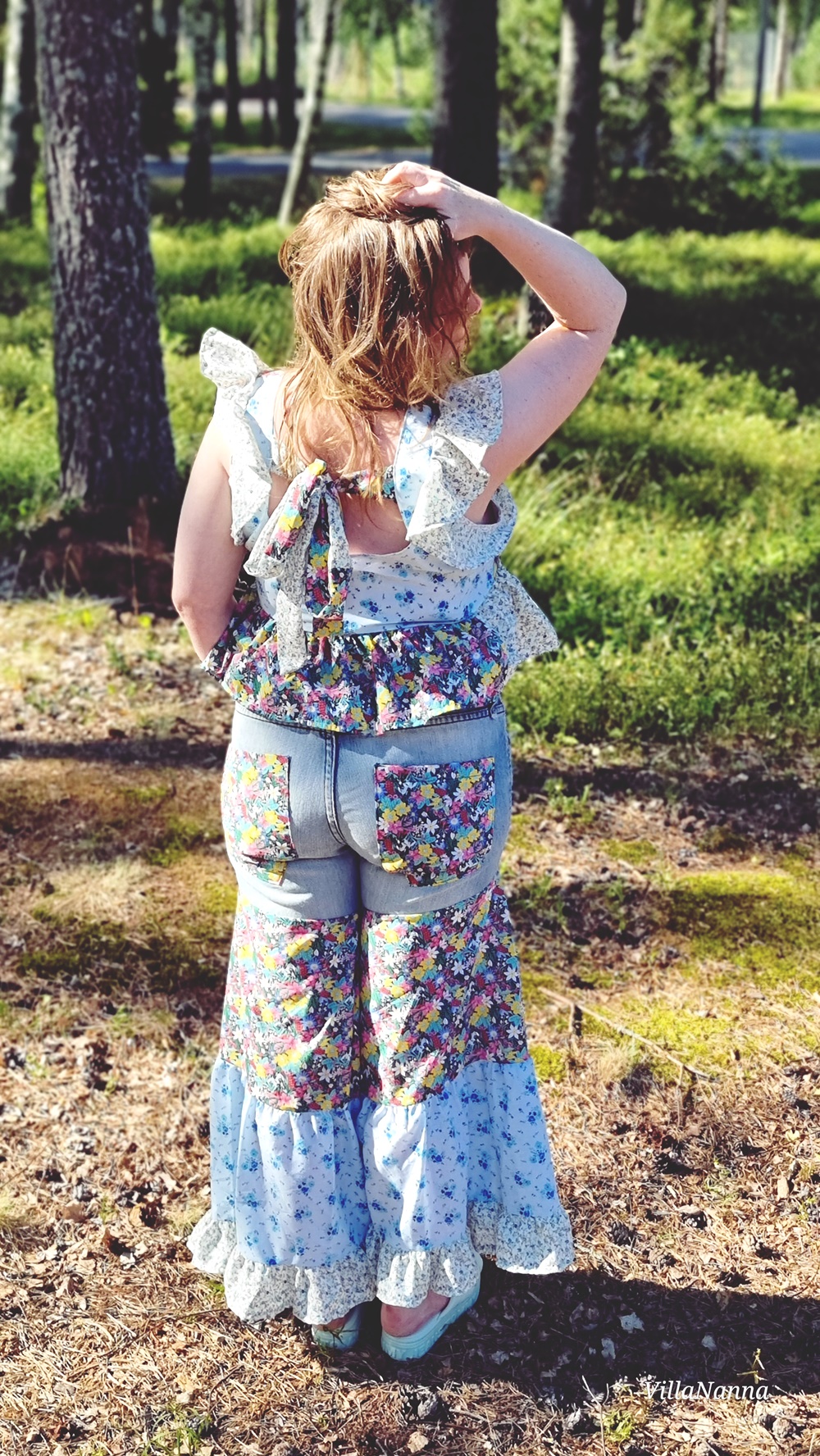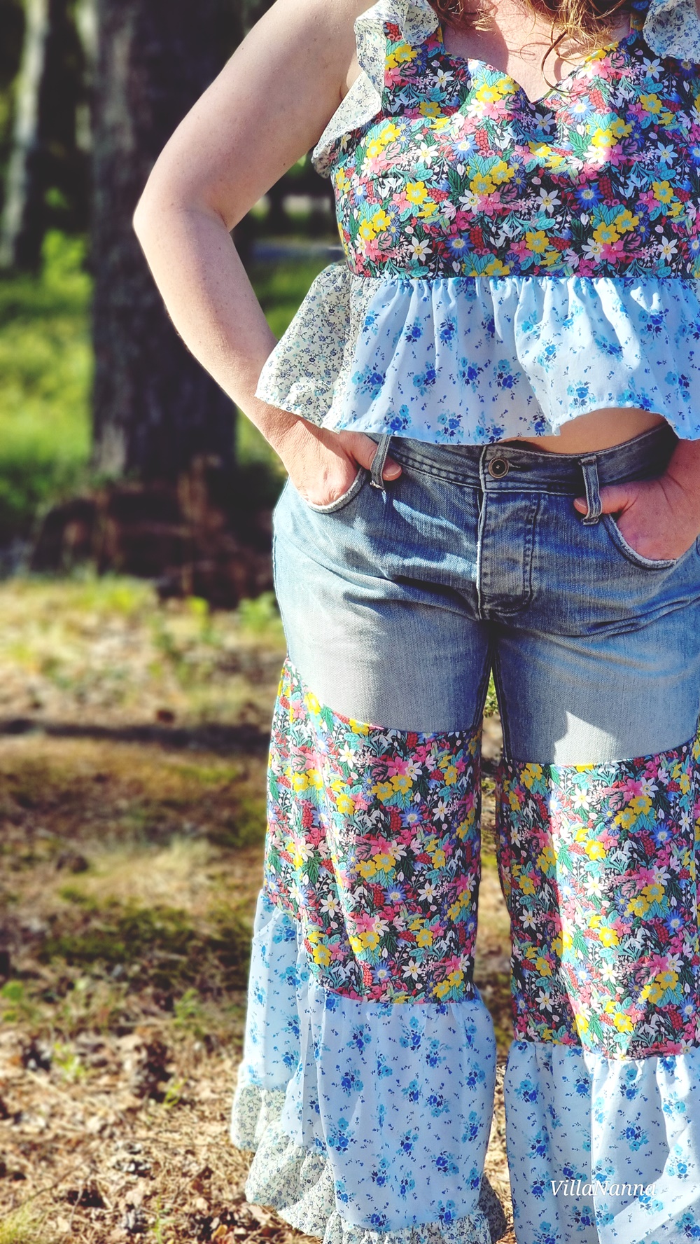 Hyvä idea, varmasti kevyet ja ilmavat näin kesällä ja sopii festareille 😊 Farkuista tulee mieleen omat teini vuodet, löysin tuolloin kirppikseltä samantyyliset, pääosin farkut, mutta lahkeisiin oli ommeltu kangastilkuista leveät lahkeet. Niillä housuilla ja lyhyeksi leikatuilla räikeän pinkeillä hiuksilla säväytin aloittaessa ysi luokan uudessa koulussa 😅