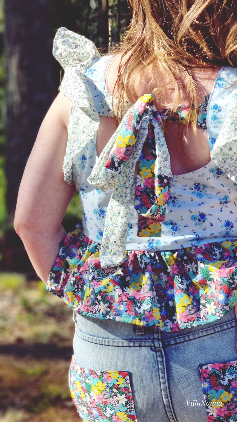Aika hyvin sain ommeltua tilkuista uudet lahkeet housuihin, tilkkuja jäi kuitenkin reilusti, joten päätin sitten tehdä Louna topin Mekkotehtaan Helmat 2 -kirjasta. Tämän kaavan mukaan olen tehnyt topin jalkeen myös mekon, jonka olen teille jo esitellyt. Asusta tuli todella boheemi ja toimii kesällä todella hyvin. Vielä tuohon pitää virkata muutama koru, niin on täydellinen. En näihin kuviin vielä sitä ehtinyt tehdä.