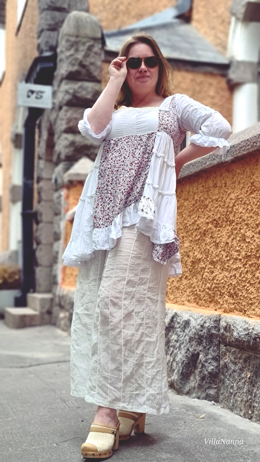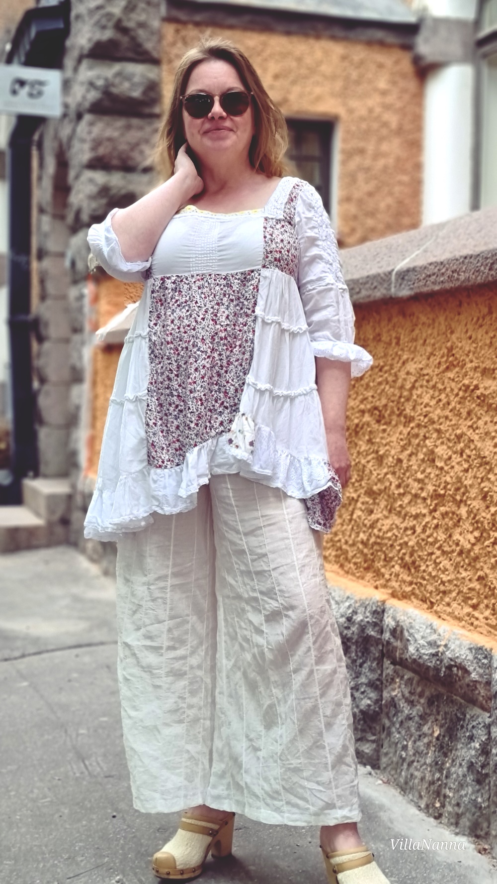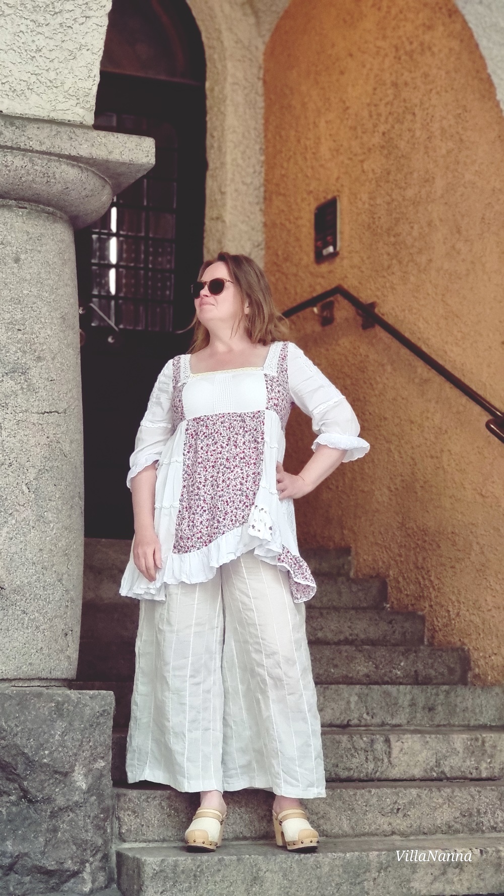 Yhdistin housut iänikuiseen tunikaan, näitähän on kaappi täynnä ja tuntuu, että teen näitä koko ajan lisää vain. Mielestäni tämä asu sopii yhteen mainiosti. Minähän pidän vähän tämän tyyppisistä vaatteista melekin eniten. En niinkään vartalonmallisista. Yleensä puhutaan, että pitää pukea leveän alaosan kanssa jotain istuvampaa yläosaksi tai toisin päin. Nyt halusin ehdottomasti pukea mahdollisimman rennosti ja liehuvasti ja parasta oli se, että kaivoin kaapista vanhan tunikan, joka sopi kuin sopikin näiden pöksyjen kanssa.