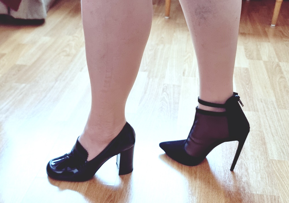 Mutta mitkä kengät valitsin? No, tolpat. Helpompi olla ja liikkua, koska olivat matalammat sekä leveät ja näin turvallisemmat kuin olisi olleet piikit. Piikit sitten toisella kertaa, toisenlaisiin juhliin. Ehkä seuraaviin häihin?