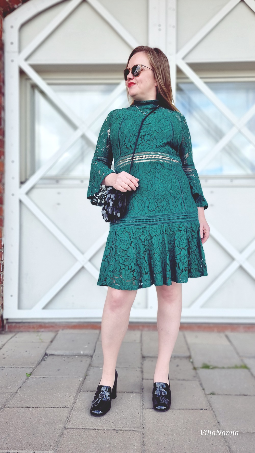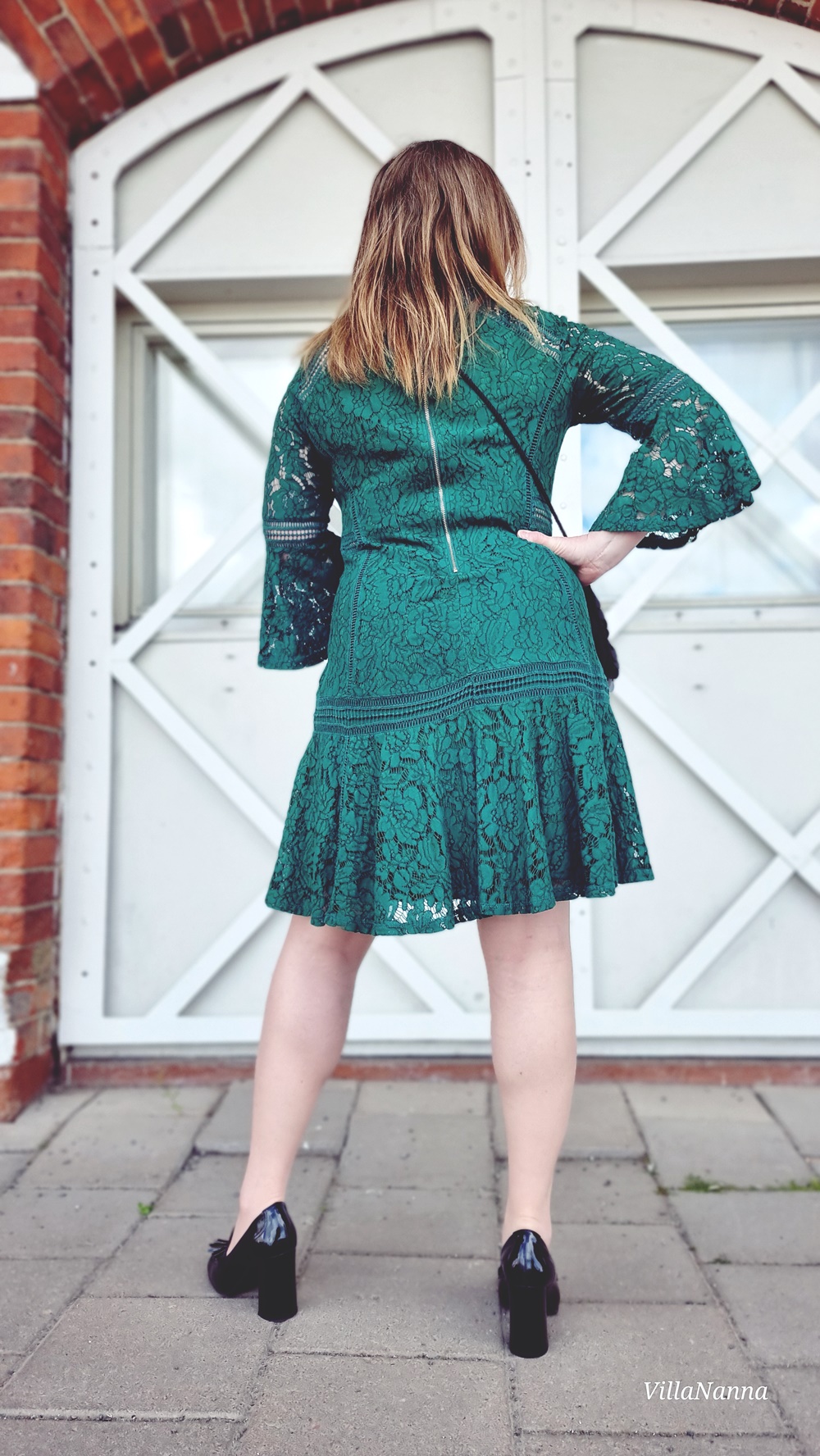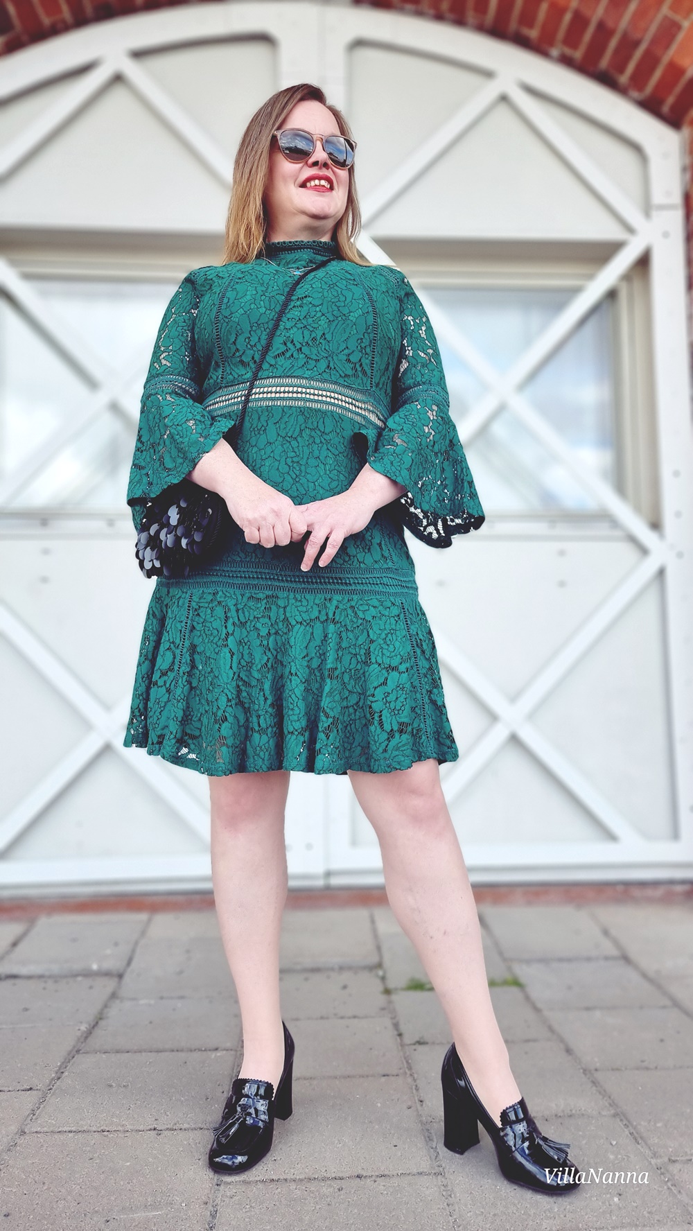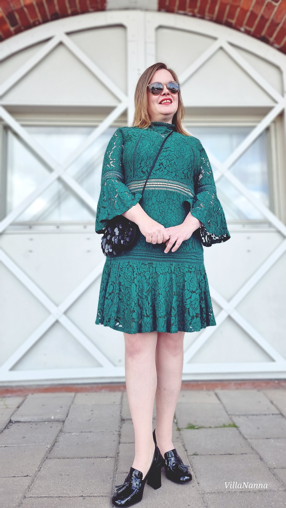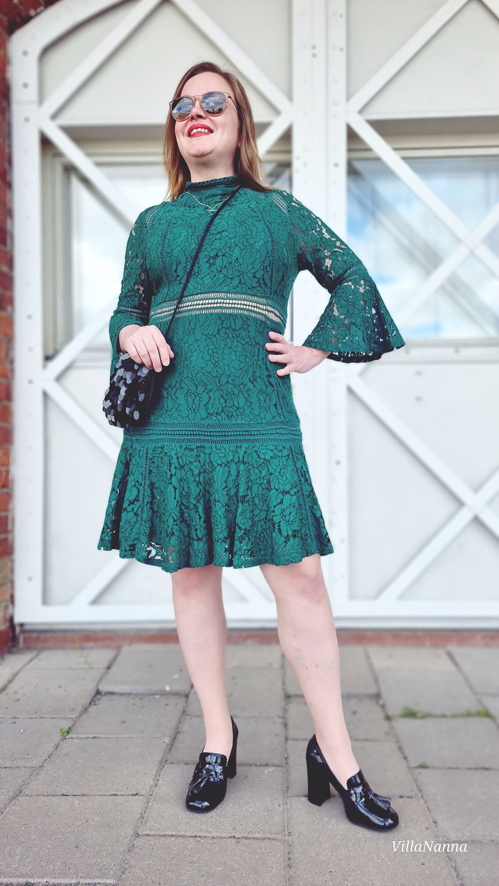 Vaude, mikä look! 💚 Kauniilta näytät ja tuo mekko on myös upea hihoineen, sekä muine yksityiskohtineen. Tyylikäs kokonaisuus kenkiä myöten, toki nuo piikkikorollisetkin olisivat sopineet mekon kanssa. 😊👌🏻