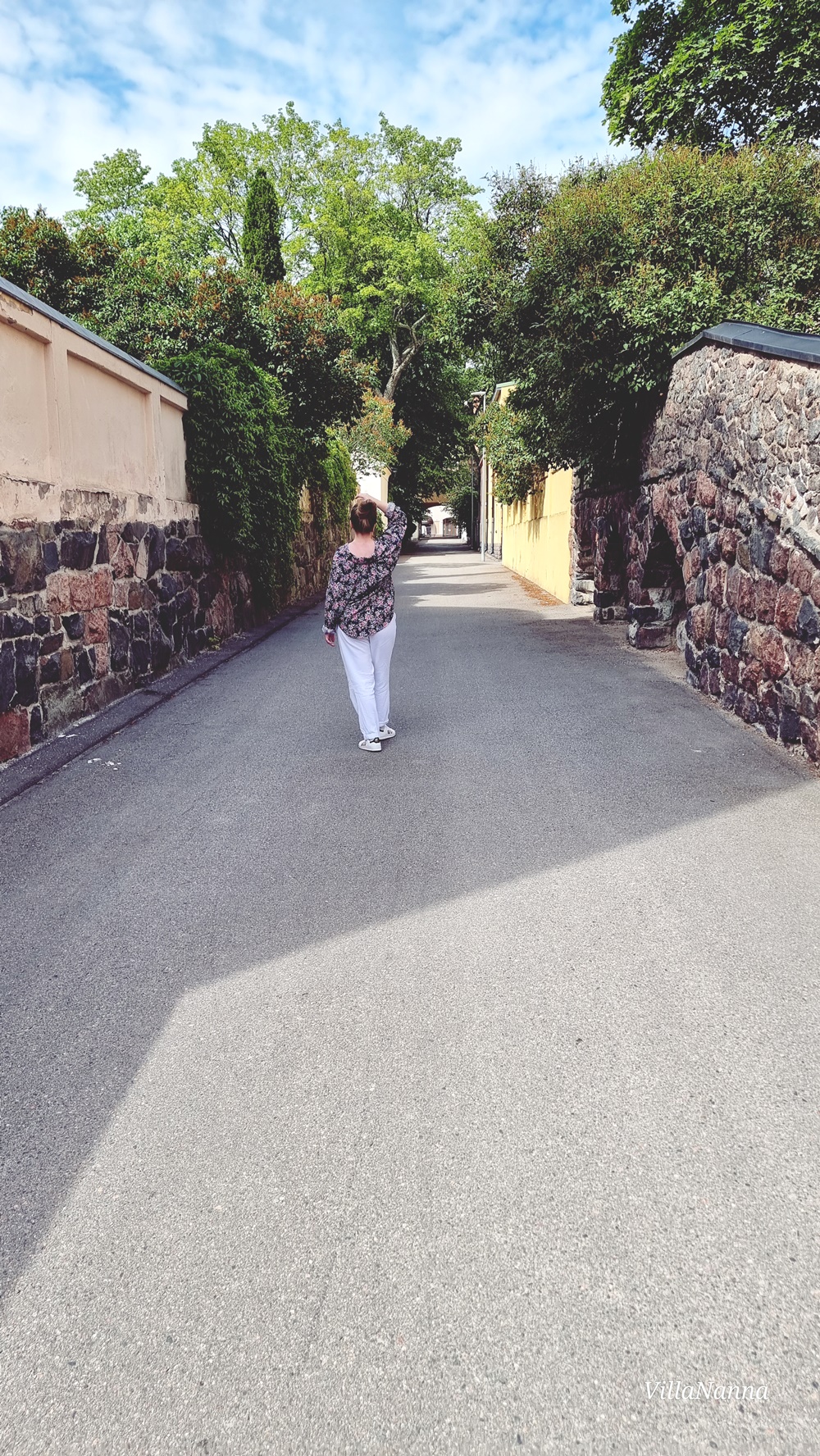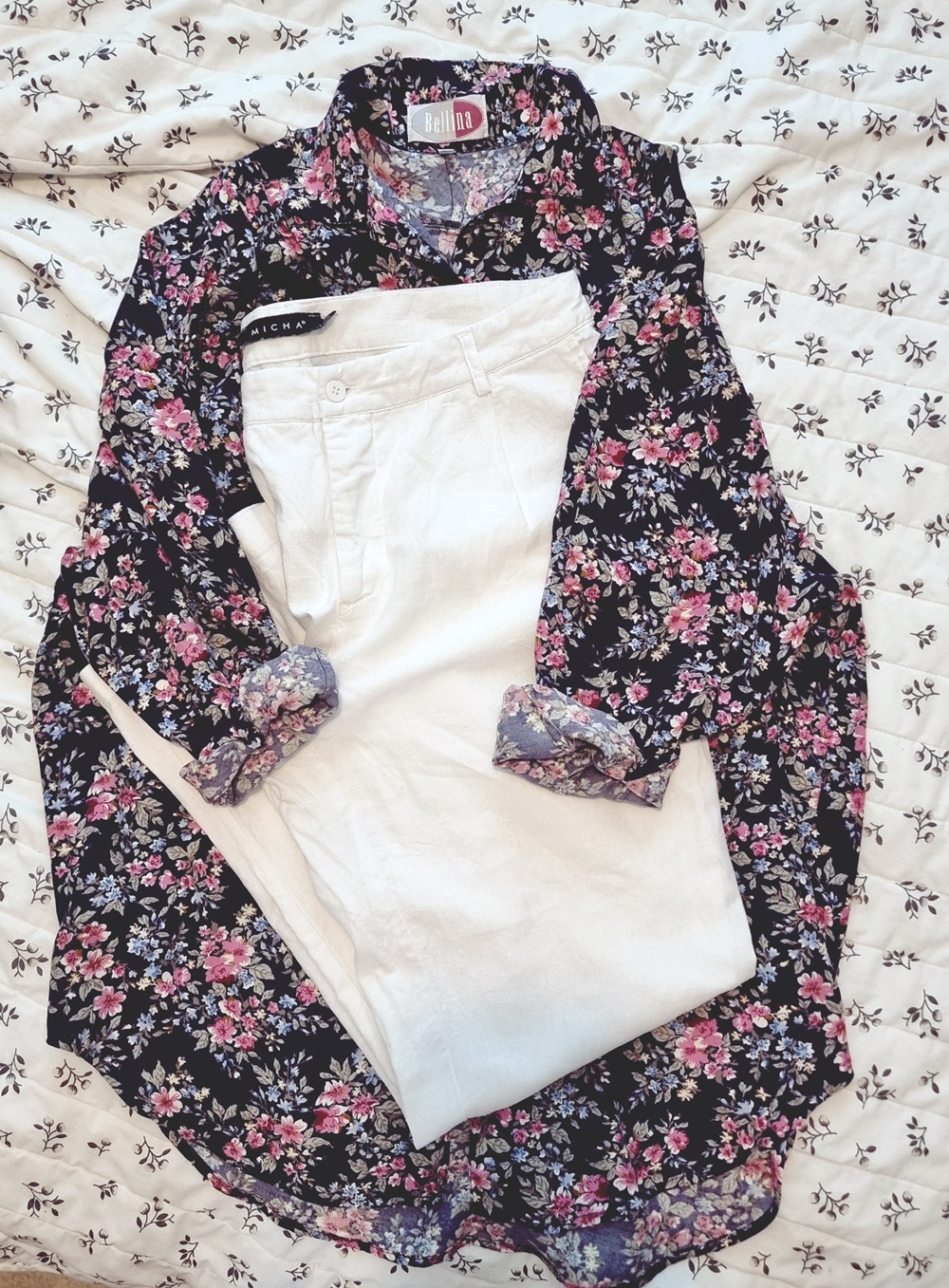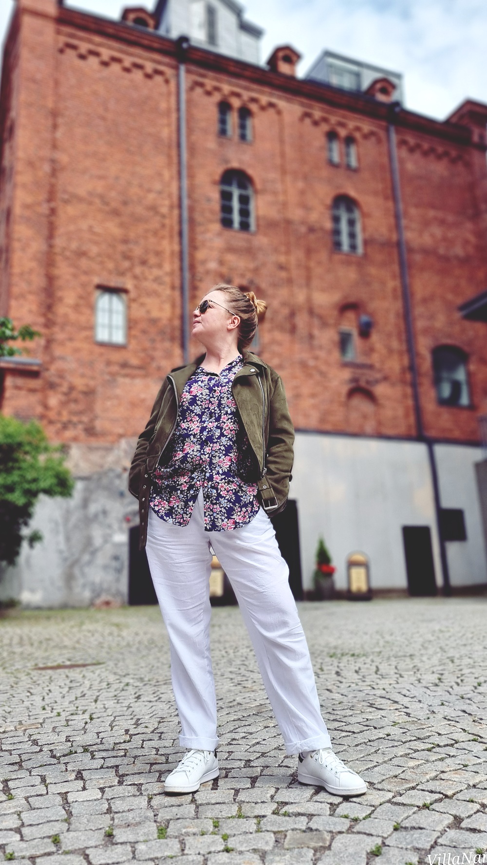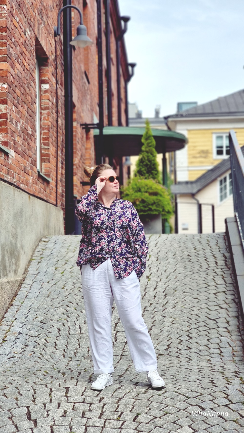 Minä pukeudun useasti samalla tavoin mitä pukeuduin nuorena, minulla on hyvin vähän moderneja vaatteita, kuten tiedätte, että myös lempikaavani, joita käytän on pääasiassa 80 -luvulta. Kuvissa näette nyt valkoiset porkkanahousut sekä lötköpötkö leveän kauluspaidan. Näin tosiaan pukeuduin 90-luvun alussa, tosin yleensä paidan kanssa yhdistin leveälahkiset housut. Eli edelleen voin käyttää samanlaisia vaatteita kuin silloin aikanaan. Enhän minä kuitenkaan niihin ihan samoihin enää pukeudu, en mahdu niihin. Olen saanut kuitenkin elopainoa +30kg siitä ajasta lisää. Mutta paljon on sellaisia vaatteita, joissa kuljin siihen aikaan löytyy nyt kaapistani. Mutta ei nämä vaatteet minusta vanhaa tee. Ikä näkyy vain asenteessa elämään.