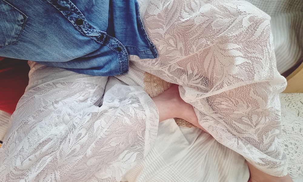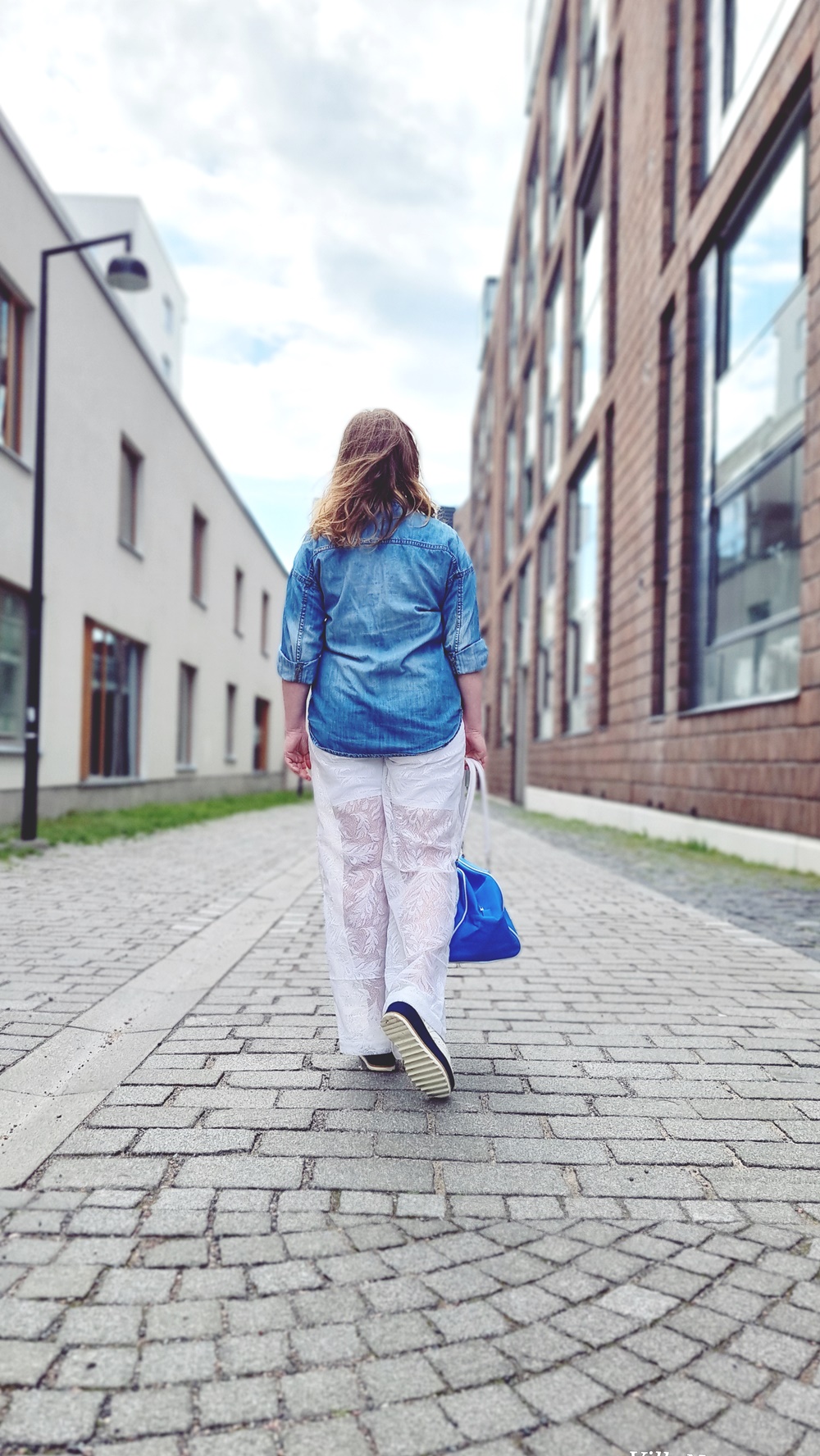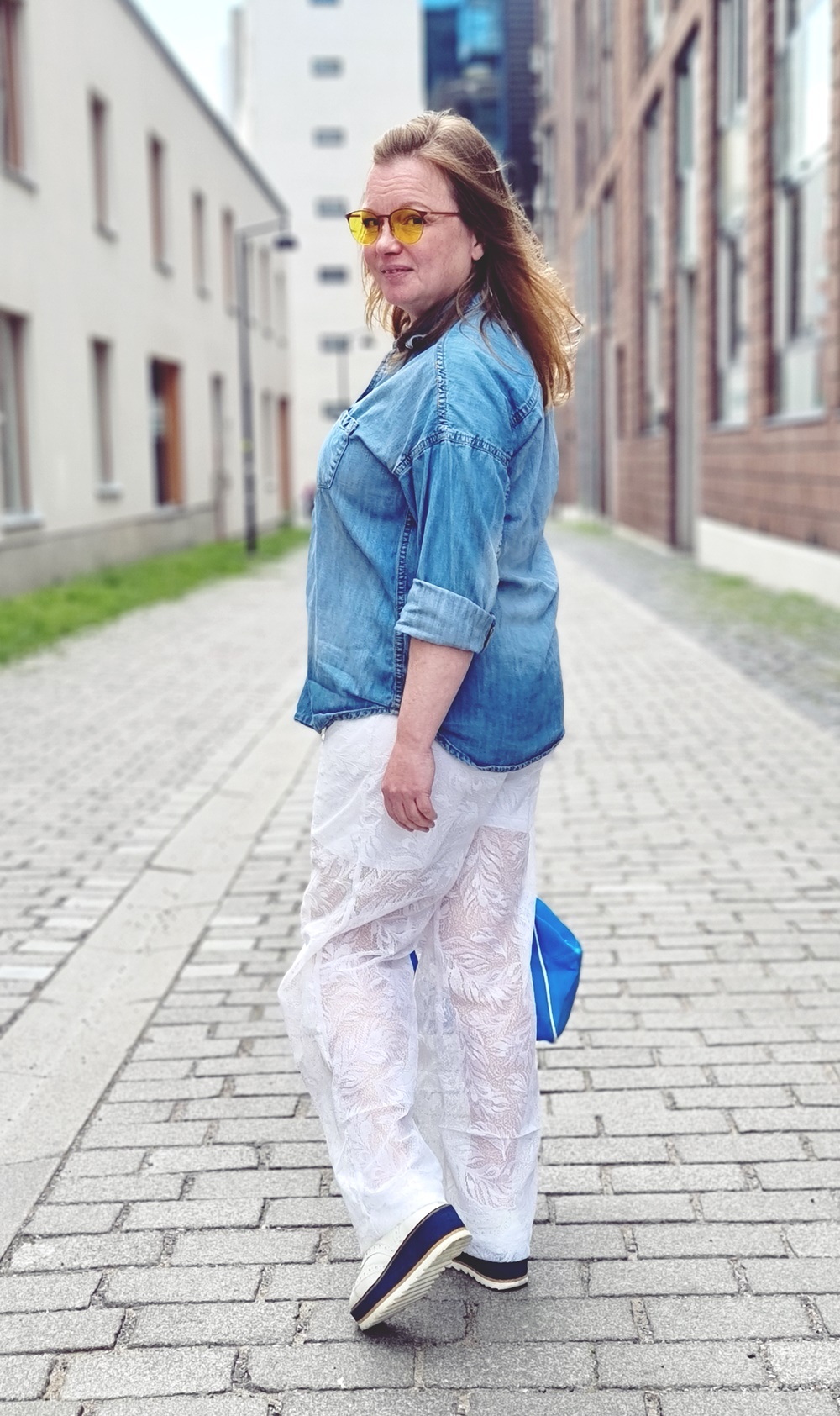 Olen jotenkin todella mieltynyt näihin verhoista tehtyihin pitsihousuihin. Enkä oikein tiedä, että miksi olen. tämän ikäisenä on vähän haasteellista yhdistellä näitä mitenkään. Alunperin halusin laittaa vain nämä housut ja jonkin pitkän t-paidan. Mutta lopulta laitoin alle pyöräilyshortsit ja farkkupaidan. Pitää testailla erilaisten yläosien kanssa, jos löytyisi se itselle sopiva tapa yhdistää näitä.