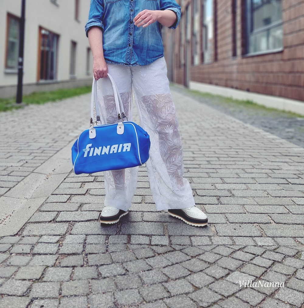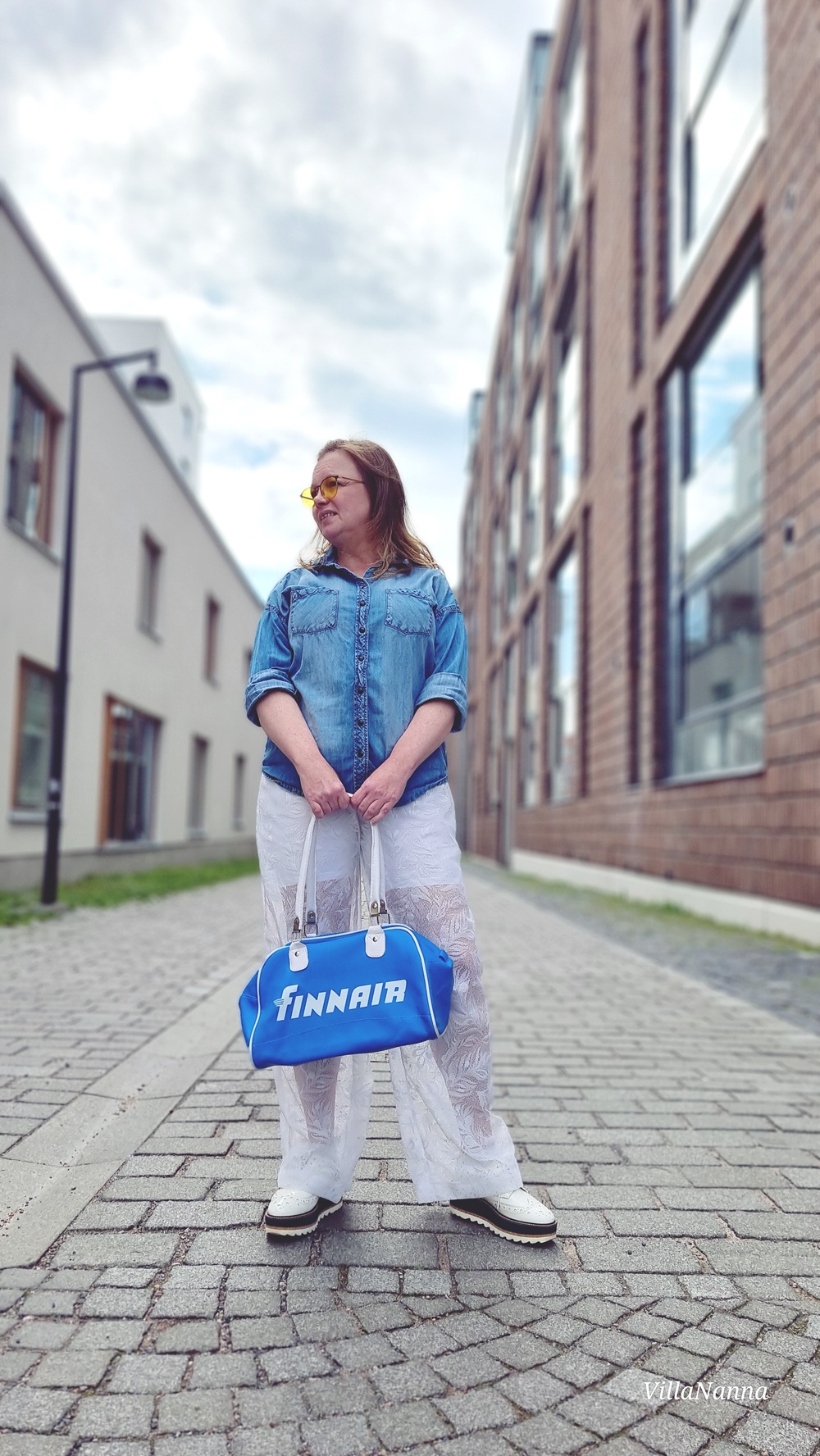 Finnairin laukun olen vuosia sitten löytänyt Kierrätyskeskuksesta. Käytin laukkua tuohon aikaan paljon. Jos seurasit vanhaa blogiani, niin siellä oli paljon kuvia tästä laukusta. Kengät on myös Kierrätyskeskuslöytö. Aikanaan Kierrätyskeskus oli minun ykköspaikka hankinnoille. nyykyään käyn siellä todella harvoin. Kengät on hankittu siis vuonna -21. Farkkupaita on ollut kaapissani ainakin 20 vuotta.