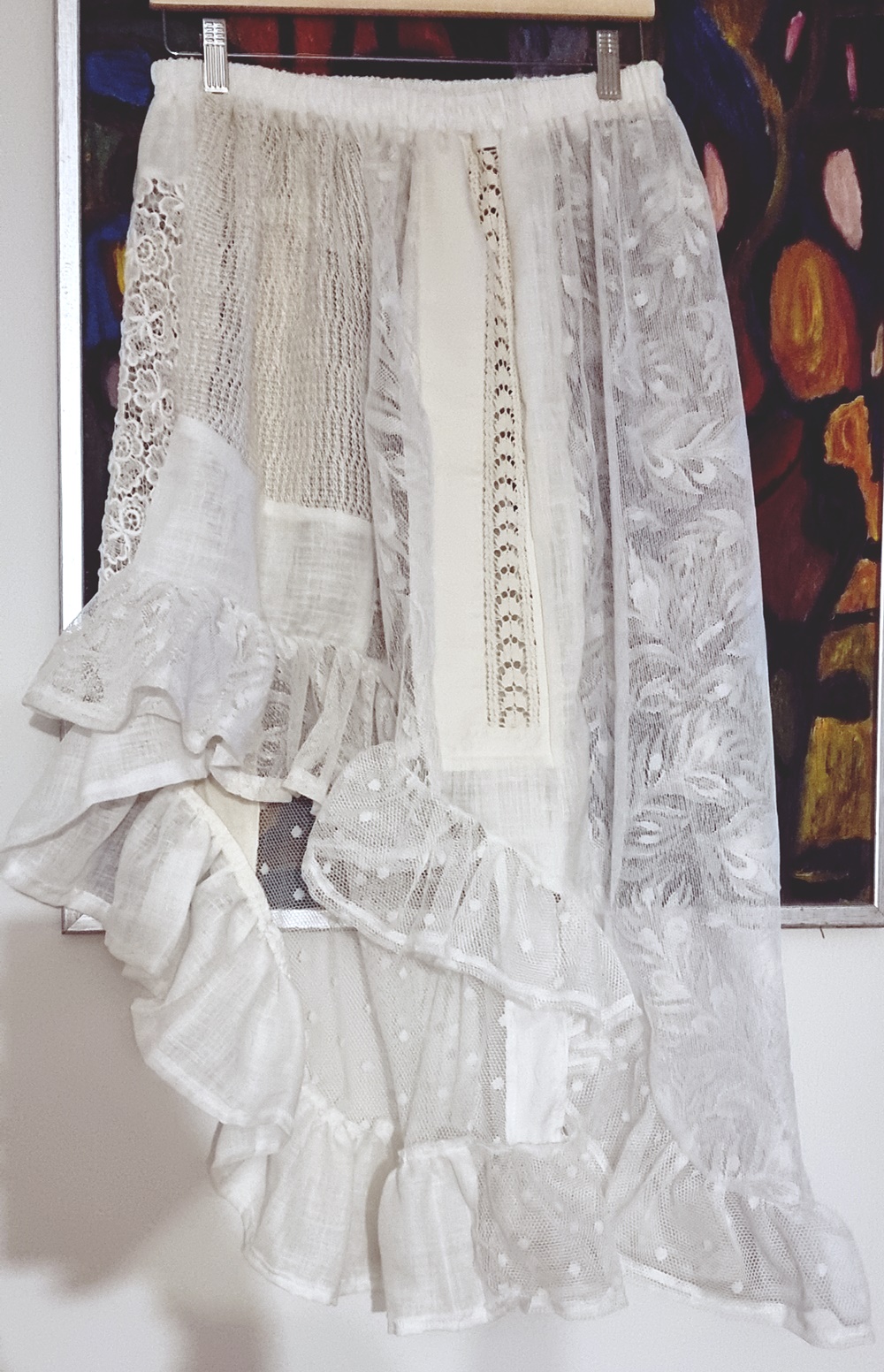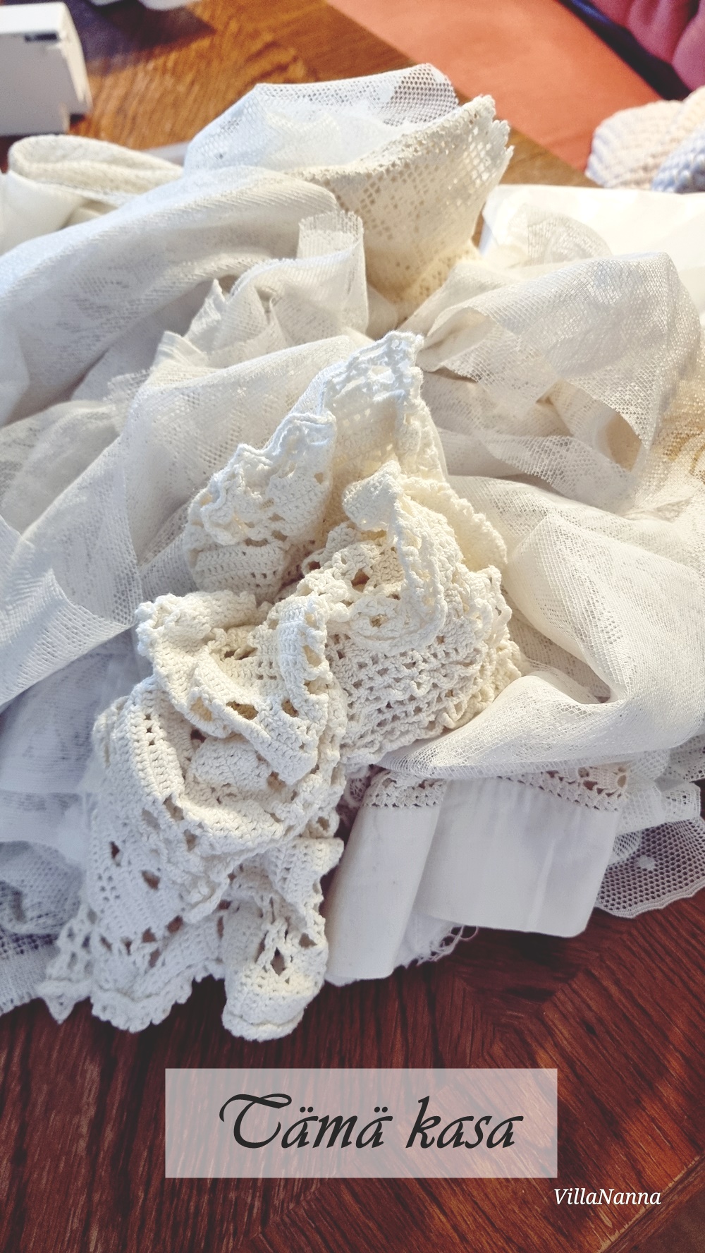 Jämistä ompelin uuden pitsihameen. Näin sain jämäläjää pöydällä taas vähän pienemmäksi. Valitsin tähän jälleen vähän isompia paloja, jotka yhdistin palasten muotojen mukaan. En siis ole leikannut tästä mitään, vaan ommellut ihan vain paloja tähän muotoon. Sen vuoksi helma ei ole mistään ihan tasainen vaan hyvin epäsymmetrinen sieltä täältä.