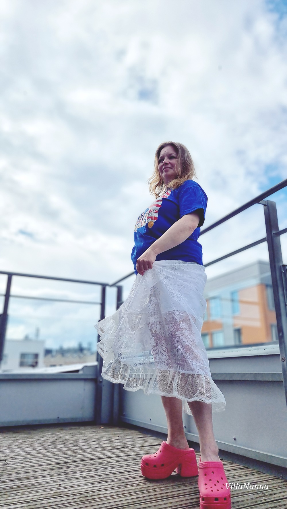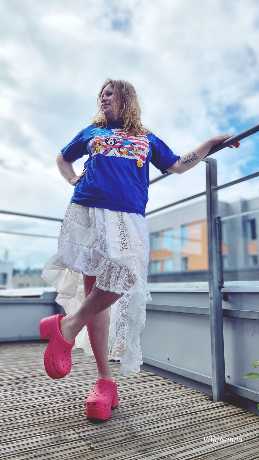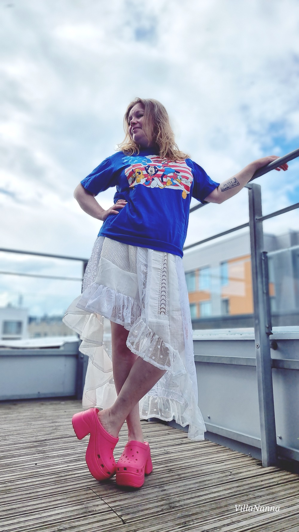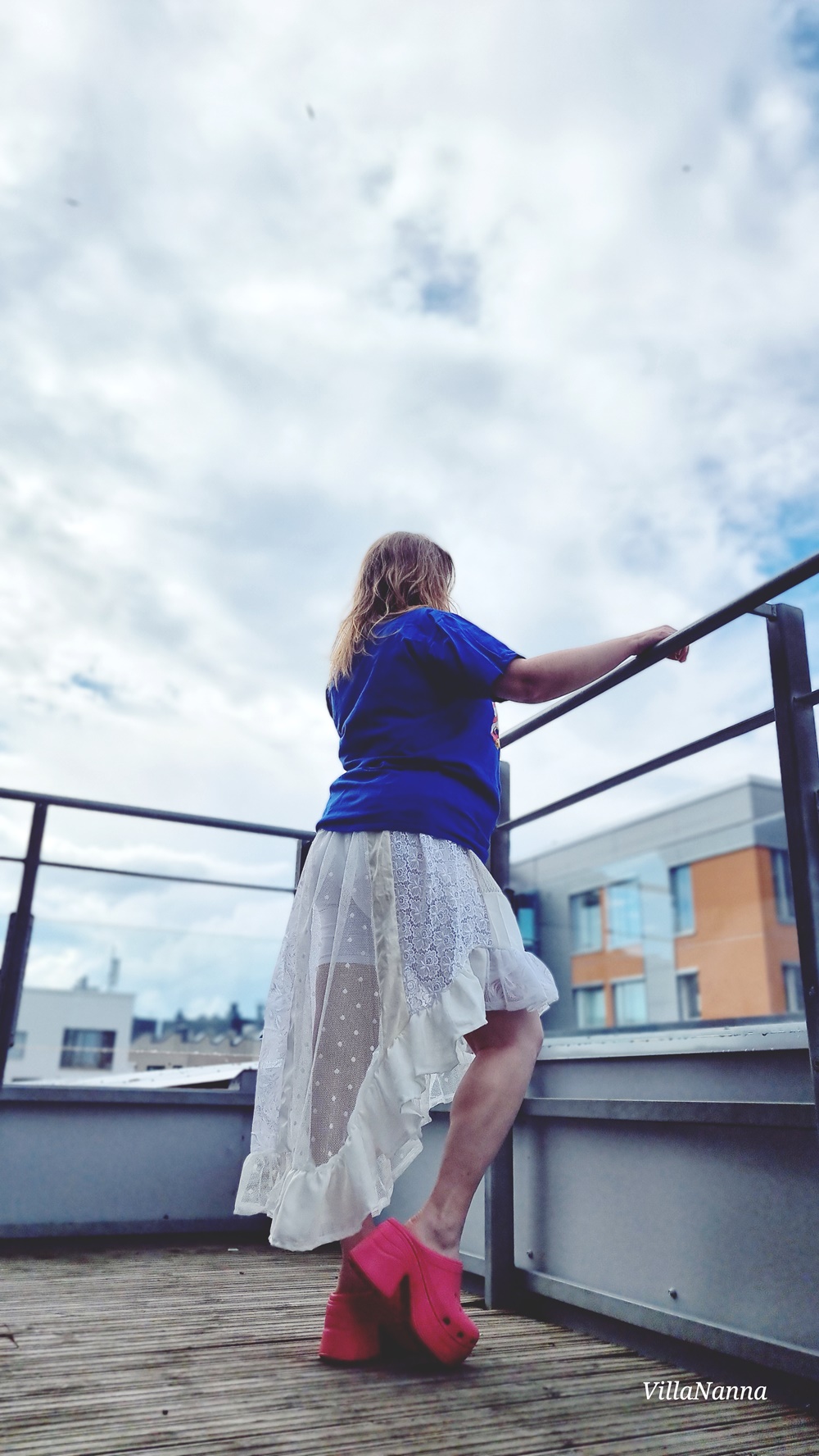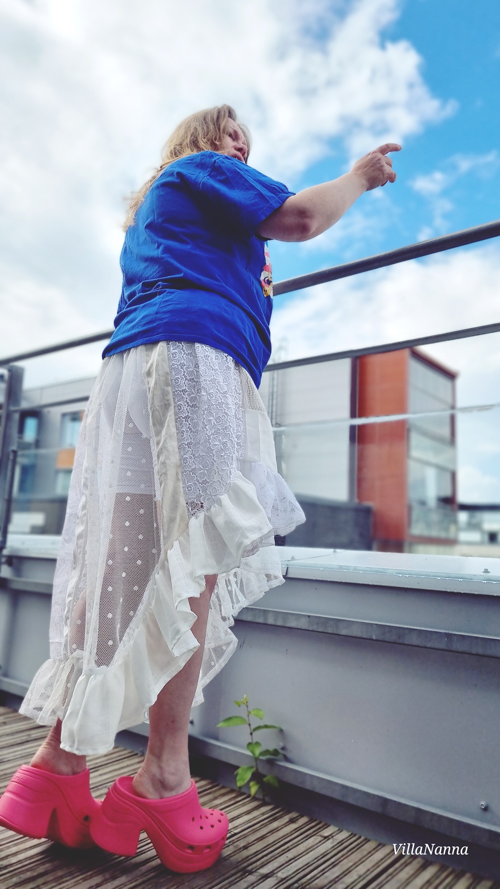 Miten sä pukisit vaatteen? Tuohon kysymykseen saa nyt vastata ihan estottomasti niin kuin ikinä haluaa. Tietenkin jos haluaa pitää hametta tuolla tavoin, voi alle laittaa myös erillisen alushameen. Itse kun tykkään alusmekoista -ja hameista, niin kyseinen pukeutuminen toimii minulla erittäin hyvin. Täytyy sanoa, että nämä tällaiset on hauskoja projekteja ja tulee tilkut hyvin hyödynnettyä.