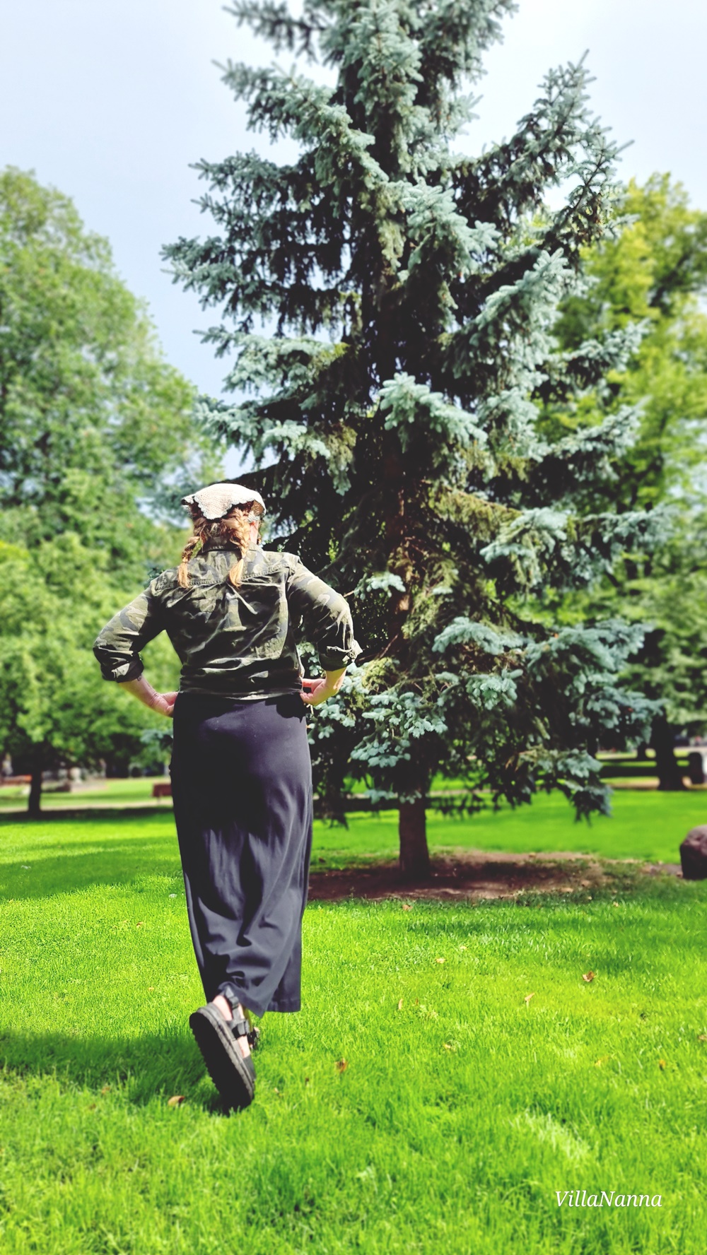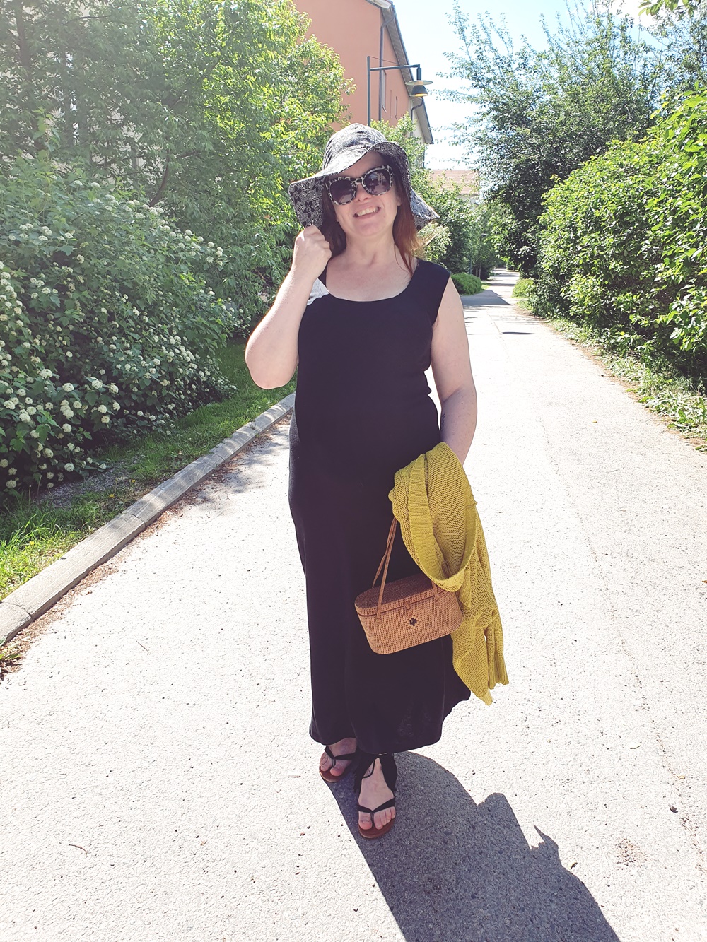 Mekon voi laittaa myös ihan näin ja kainaloon neuletakki, jonka olen ostanut Fidasta. Päähän itse tehty hellehattu suojaamaan päätä ja erikoisempi laukku heilumaan käteen. Laukku on hankittu Kierrätyskeskuksesta, kuten myös sandaalit.