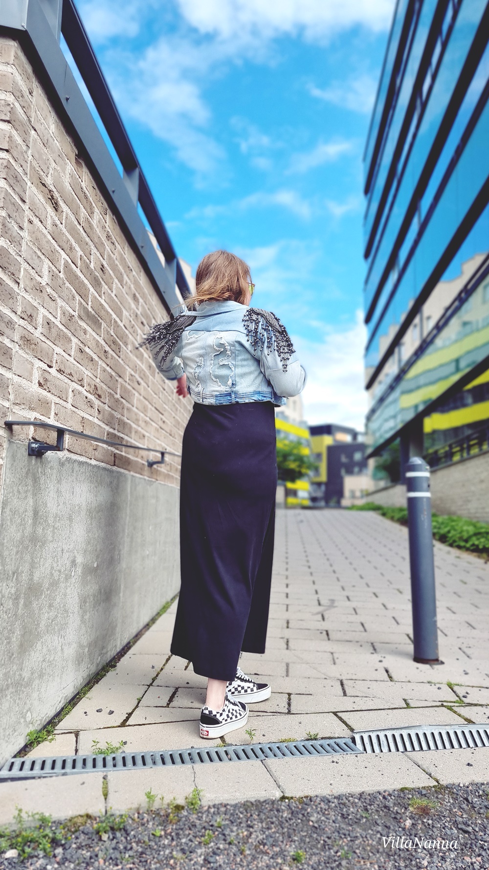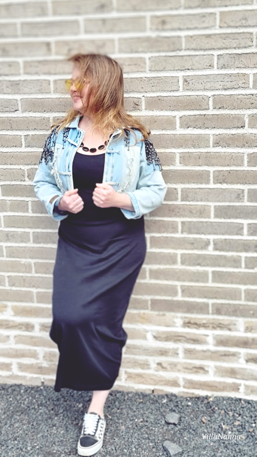 Yhdistin mekkoon Farkkutakin, jonka olen tehnyt vanhoista farkuista, jotka eivät enää mahtuneet päälleni ja jalkaan laitoin Vansin lenkkarit. Kaulassa minulla on helmet, jotka on löytyneet aikanaan Kontista.