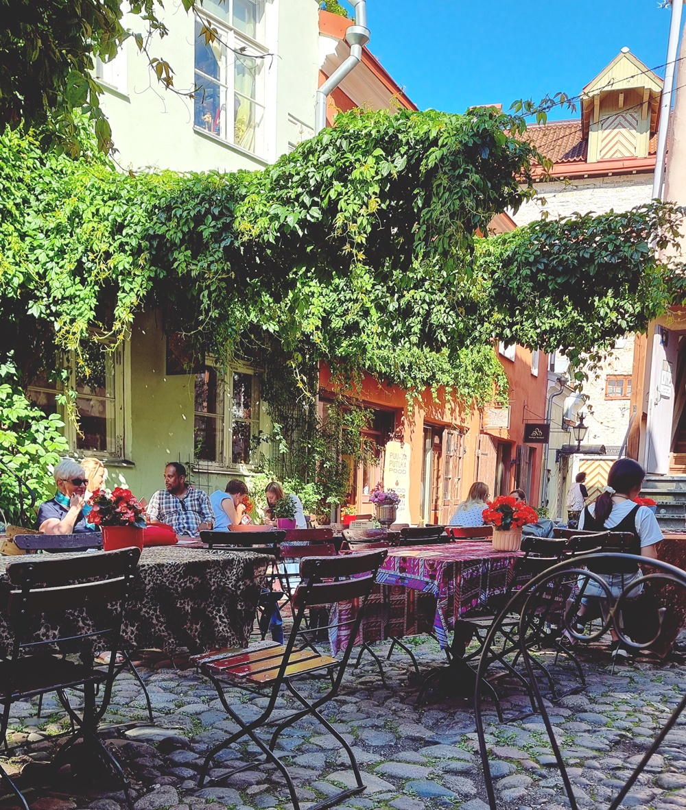 Koska minun varpaat eivät suostuneet yhteistyöhön me valuimme takaisin kohti vanhaa kaupunkia ja eksyimme ihanaan ranskalaiseen Pierre chocolaterien pihalle nauttimaan viinistä ja suklaakakusta. Minun teki nimittäin kovin mieli tuollaista rentoa istumista. Täällä sitten istuimmekin vähän pidempään. Mies otti taas torkut, että jaksaa paremmin. Joi jauhettaan lisää, että olo paranisi. Sovimme, että vielä kierretään Rotermanni, koska se on meidän lempparialuetta, niin siellä on käytävä. Alue oli taas muuttunut kovin. Mies halusi poiketa Springfieldiin. Osti sieltä sitten pari paitaa itselleen.