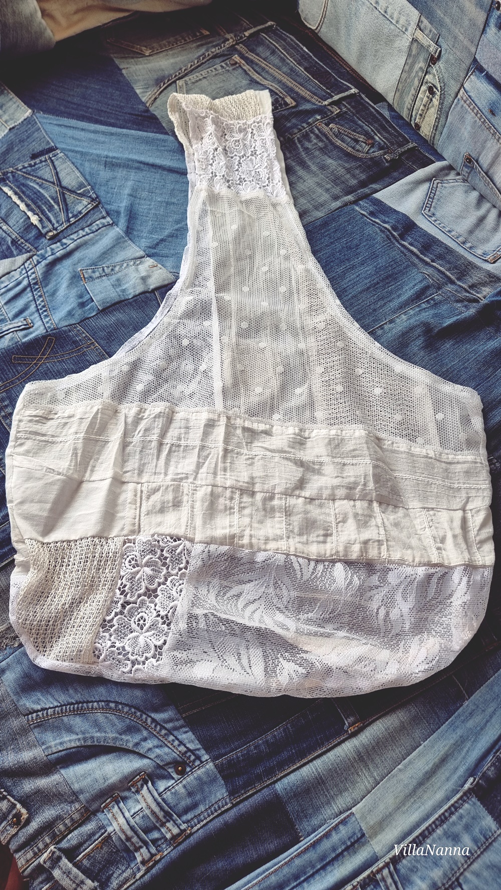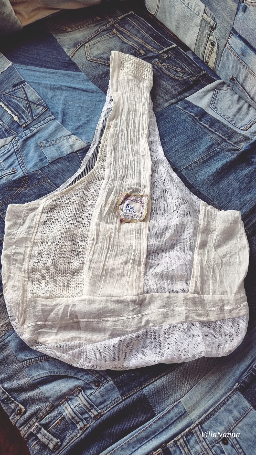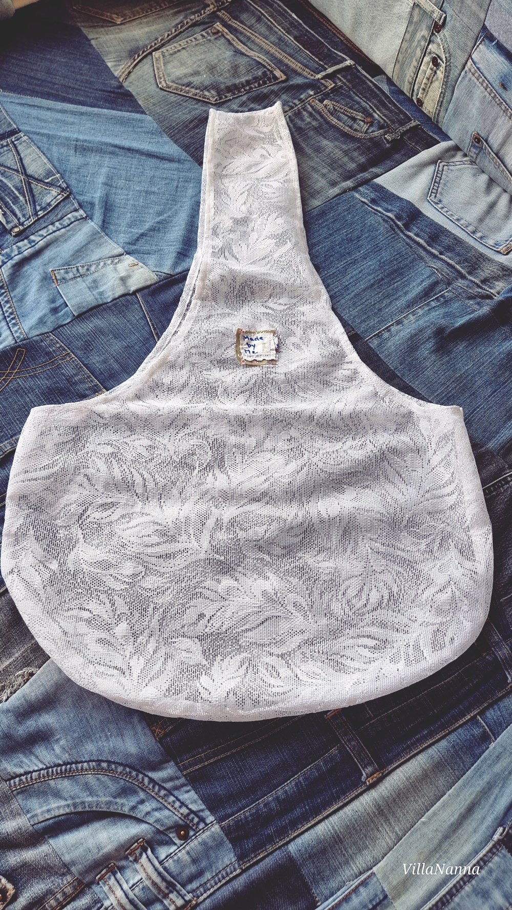 Ensimmäisenä tein isoimmasta palasesta pitsiverhoa tämän kassin. Kassi on myös aika pieni mutta yllättävän tilava. Ompelin siihen myös ompelumerkin, joita olen tehnyt ompelujätteestä, jota tulee kun ompelee esimerkiksi saumurilla. Pitsiverhon jämä jäi yli pitsihousuista, jotka tänä kesänä olen ommellut itselleni.