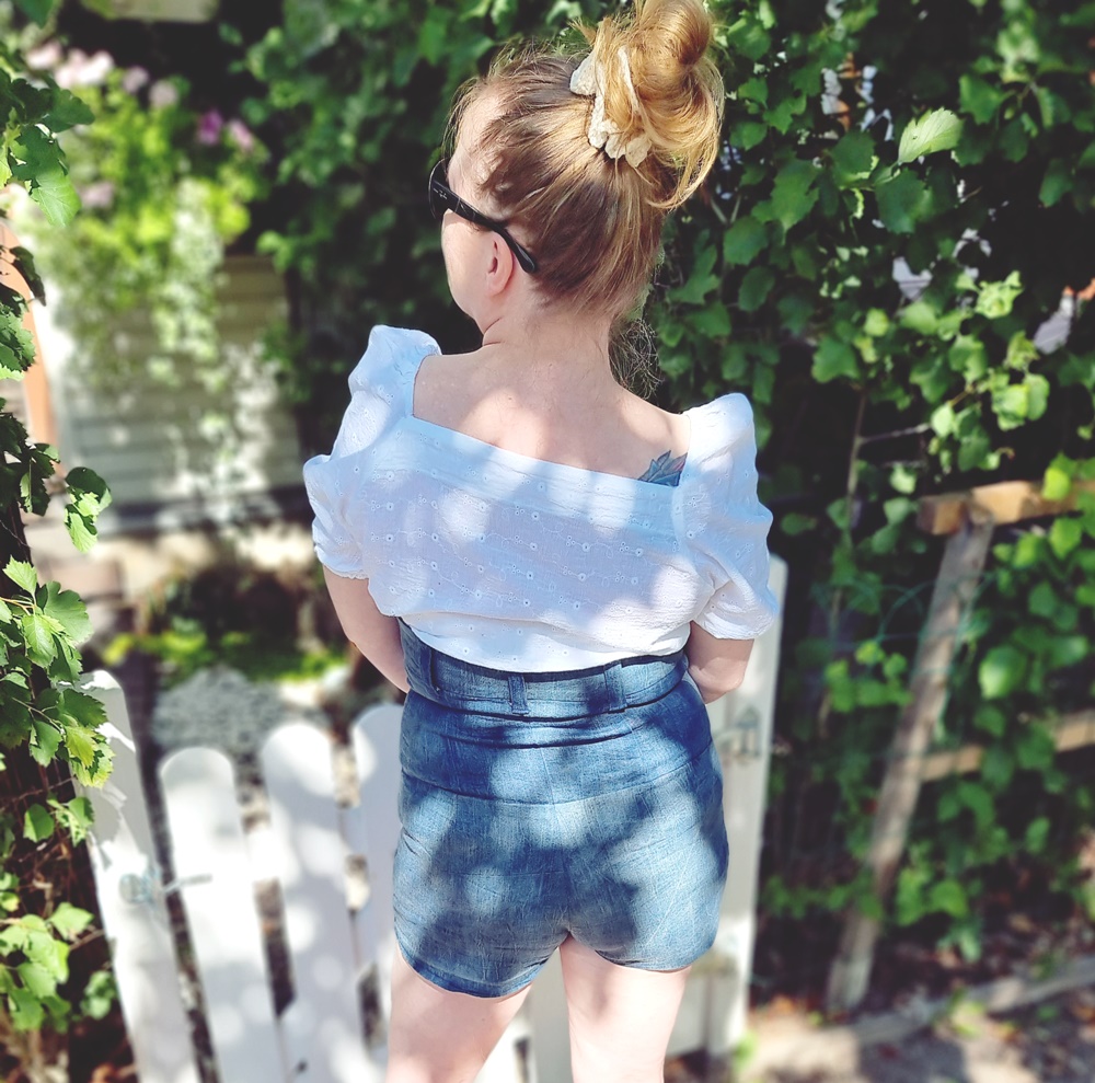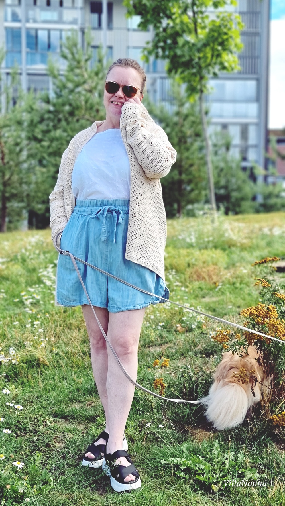 Näin kesällä on ihana pukeutua shortseihin vaikka nämä shortsit toimii myös syksyllä paksujen sukkahousujen kanssa, niin tietenkin ensimmäisenä kesä saa pukemaan shortsit jalkaan. Nämä shortsit ovat minun tekemät ja näissä on korkea vyötärö. Sellaiset mistä tykkään todella paljon.