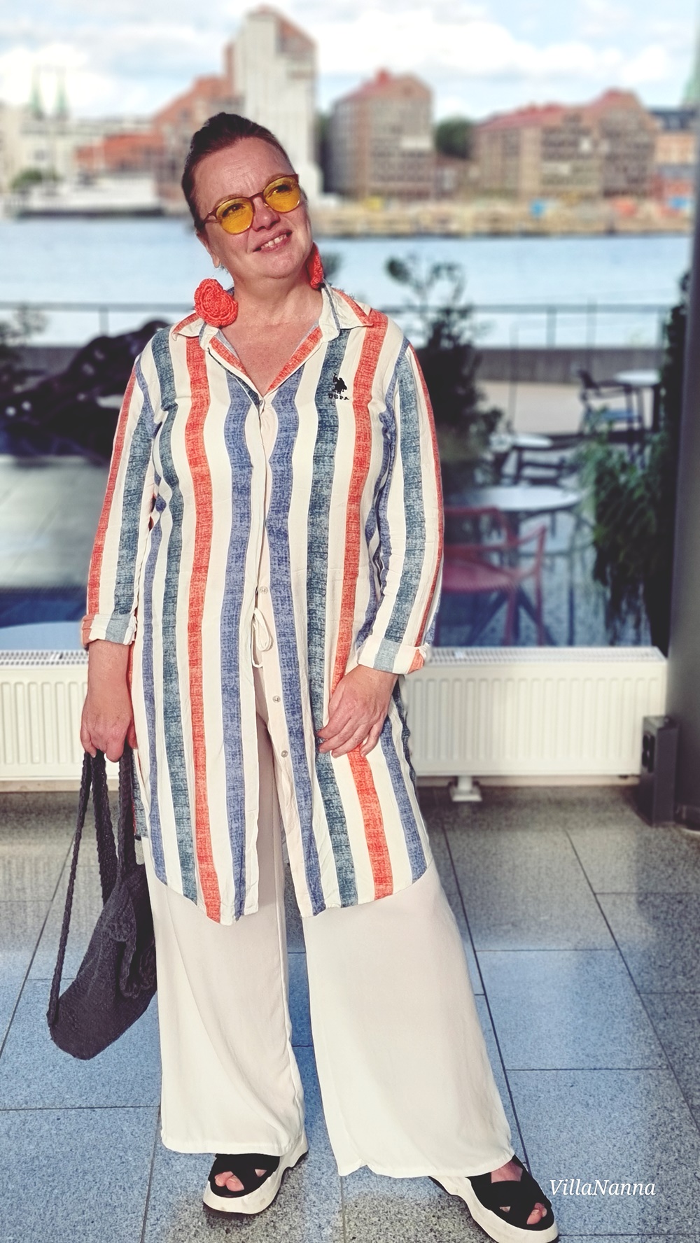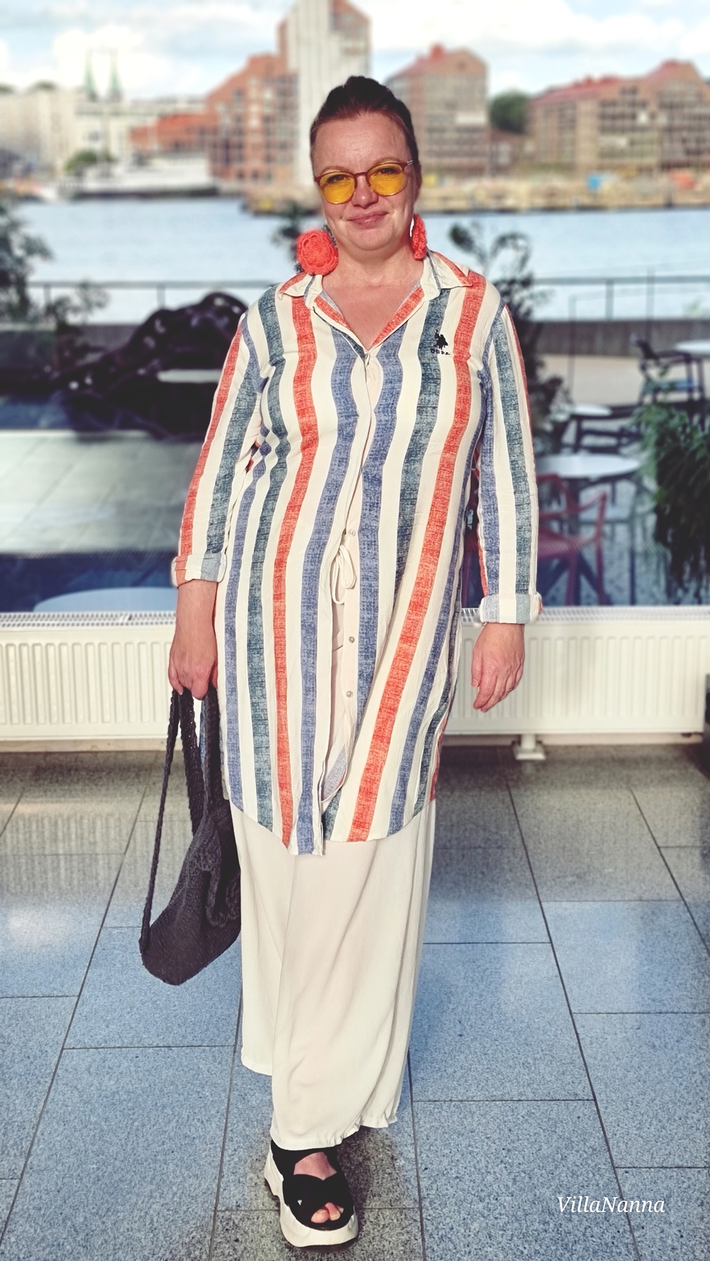 Päivänasun nimi on paitamekko kesäillassa. Paitamekko, joka on aina helppo pukea päälle, joko sellaisenaan tai sitten vaikka erilaisten housujen kanssa. Itse pidän erilaisista paitamekoista todella paljon, sillä niitä voi käyttää monin eri tavoin. Vaikka takkina halutessaan.