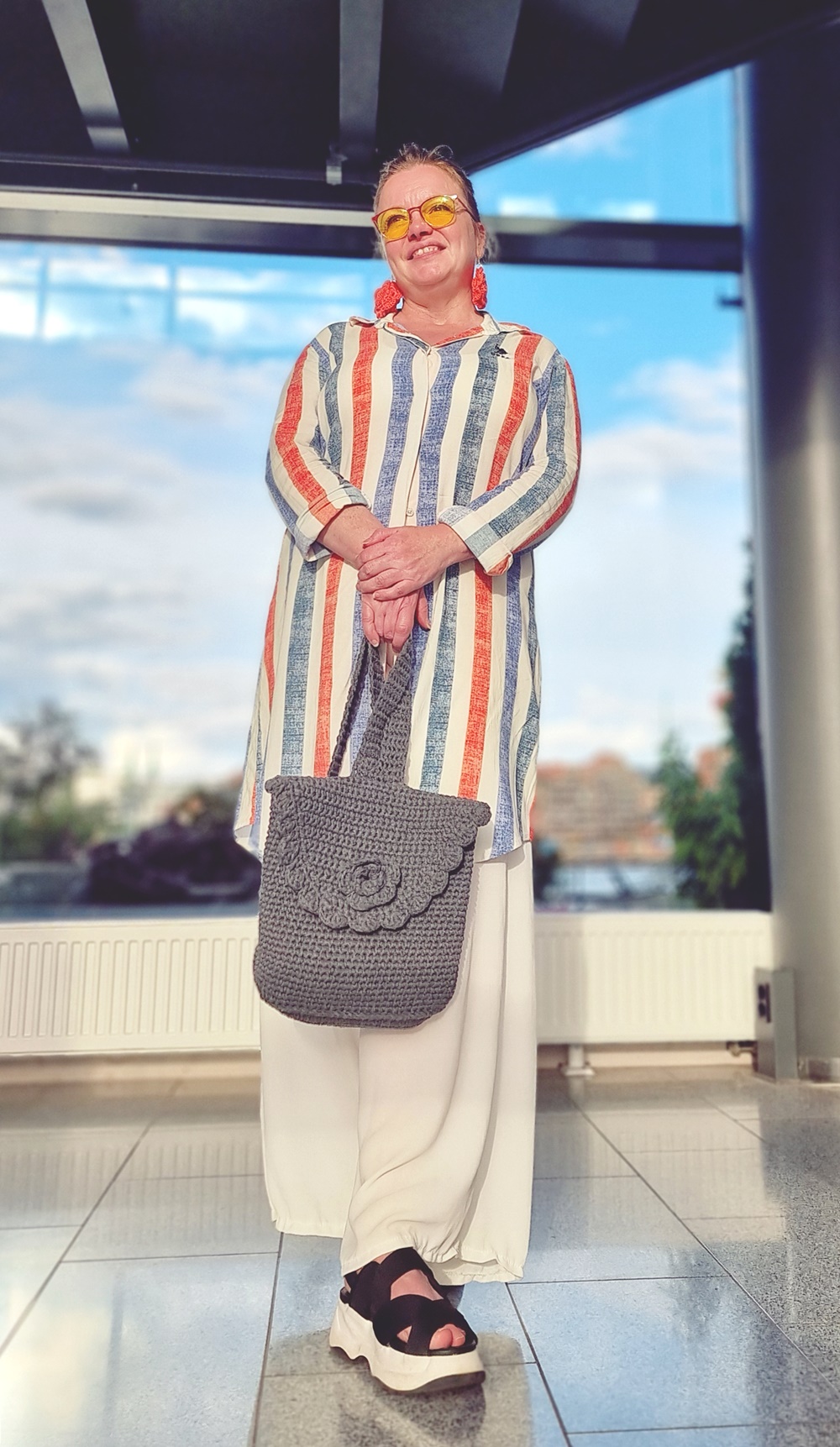 Onpa ihana tuo virkattu reppu! Paitamekon raitakuosi muistuttaa jostain, mutta en saa päähäni mistä. Jotenkin tutun oloiset raidat. 🤗