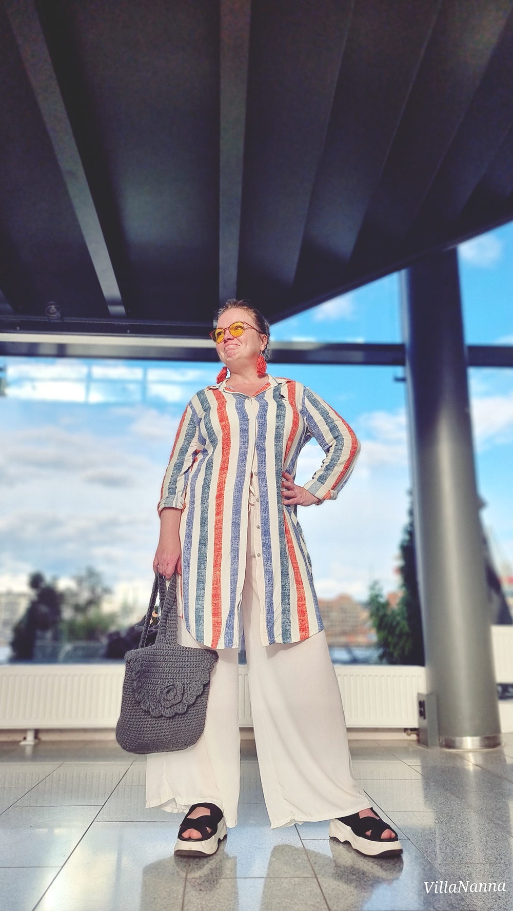 Virkkasin asuun sopivat korvikset myös. Löysin melkein saman sävyistä lankaa kuin on paitamekon raidoissa. Ei nyt ihan samaa, mutta melkein. Jalkaan tutut sandaalit, jotka olen ostanut laivalta kun matkustimme Ahvenanmaalle ja selkään virkattu reppu. Näillä varusteilla oli kiva singahtaa lähiravintolaan jälkiruokaa nauttimaan.