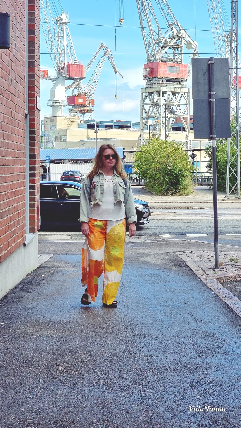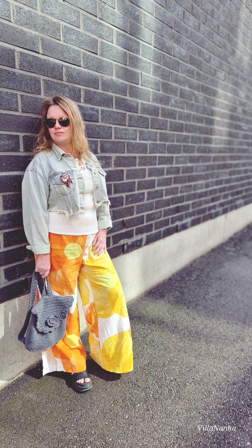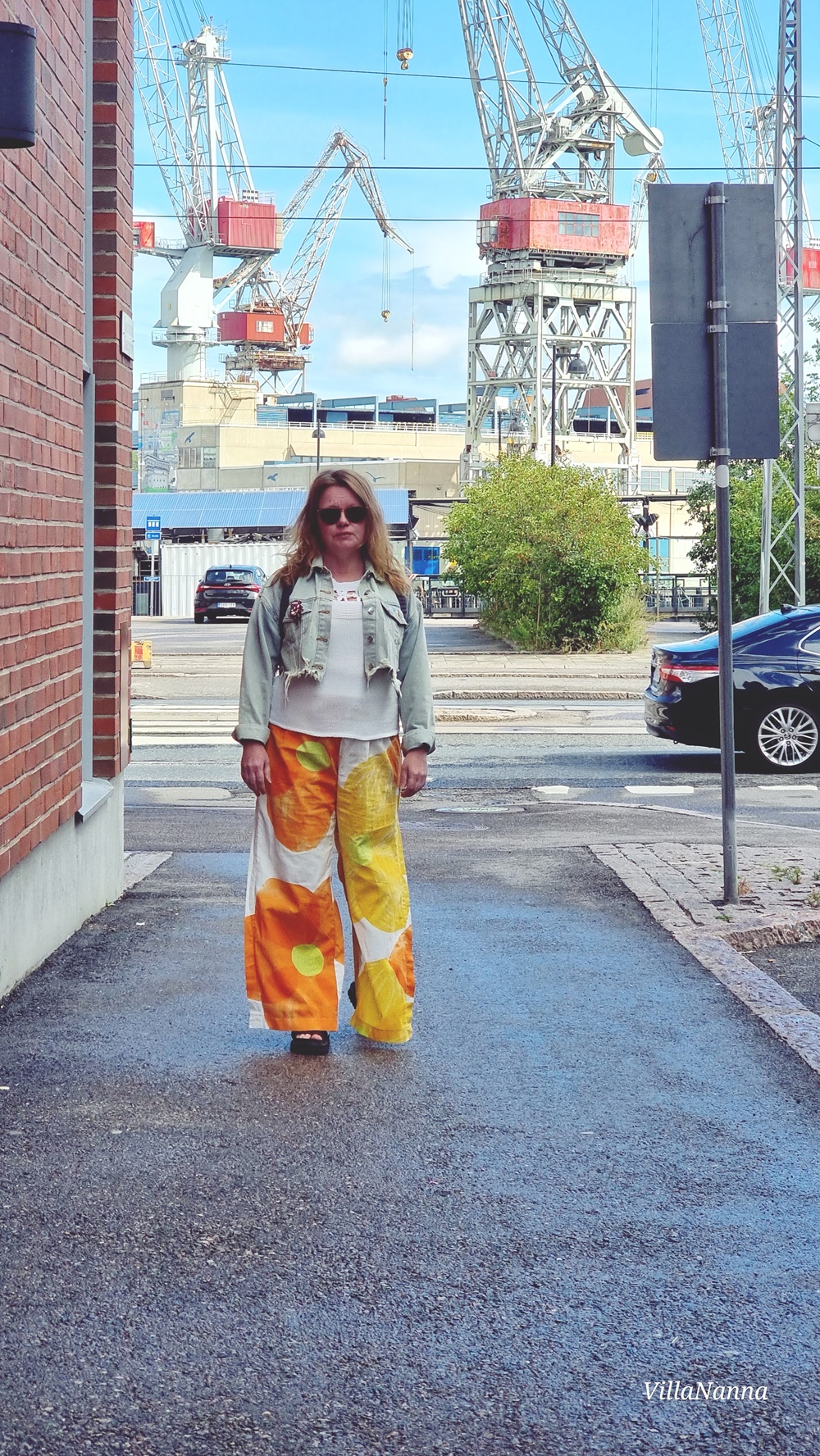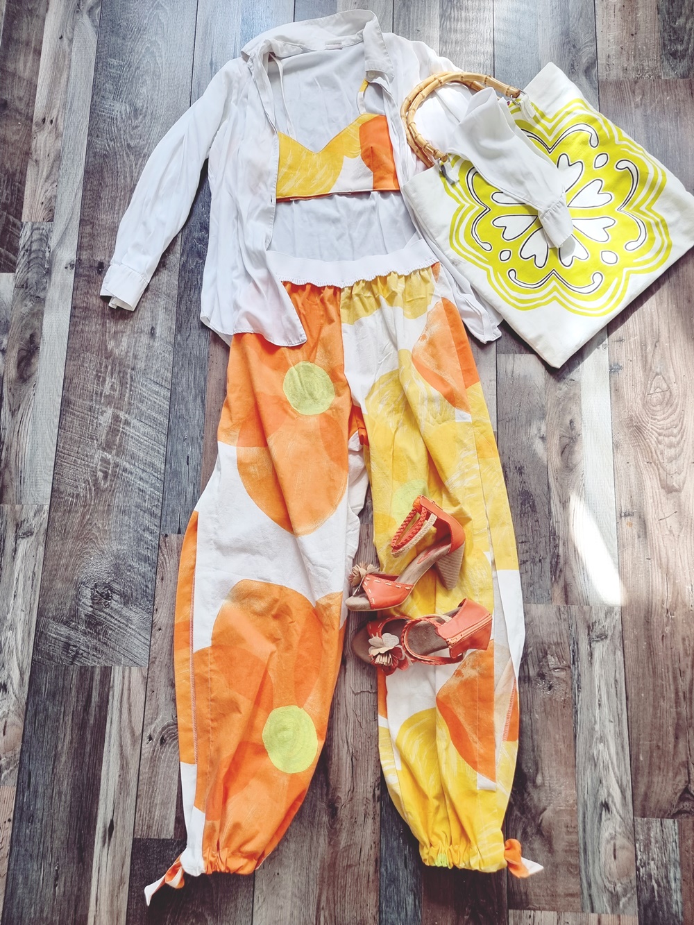 Verhokangas on ihanan raikas ja aurinkoinen. Nämä housut jalassa saa tosiaan energiaa. Housujen lisäksi olen ommellut sopivan bikiniyläosan, muistaakseni Burdan bikinikaavalla. Housujen lahkeissa on korkeat halkiot ja halutessaan voi lahkeensuut kiristää narulla pussiksi. Olen käyttänyt housuja siis myös niin. Alunperin oli tarkoitus kuvata tämä asu meidän road trip reissulla vuonna 2022, mutta kuvattavaa oli niin valtavasti, ettei lopulta kaikkea saanut tehtyä. Sen jälkeen housut ovat olleet paljon jalassa, mutta kuvat ovat olleet vähissä.