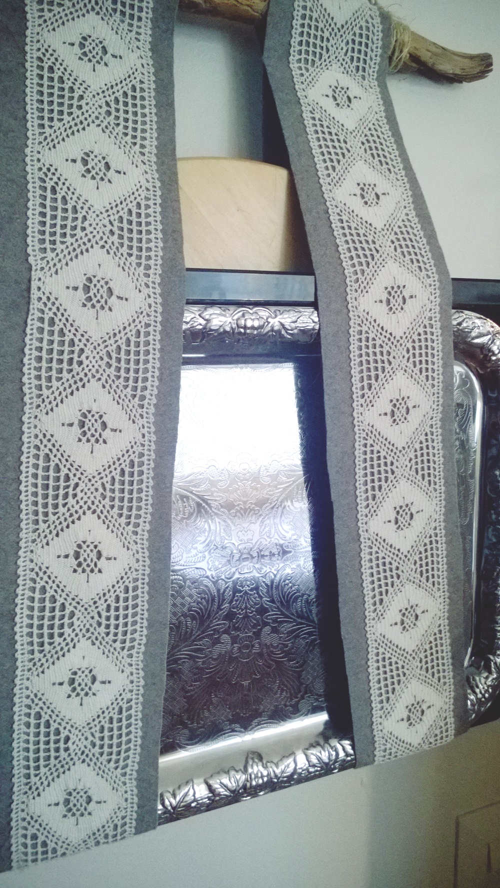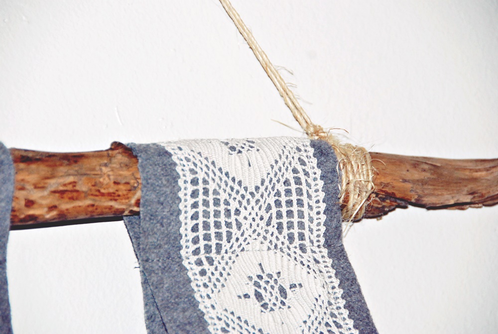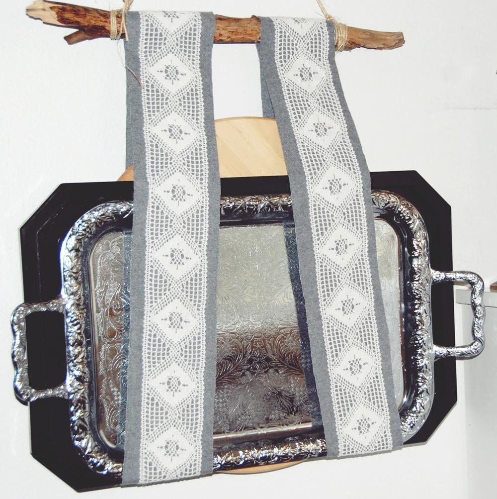 Tarjotinpidike huovasta ja pitsinauhoista on helppo ja nopea toteuttaa. Tarvitset lisäksi vielä kepin, joko ihan ostetun tai luonnosta napatun. Tällainen tarjotinpidike on suloinen vaikka onkin vanhaa aikaa kuvastava asia. Meillä tarpeellinen, sillä tarjottimia löytyy monen monta.