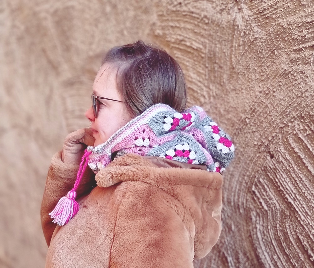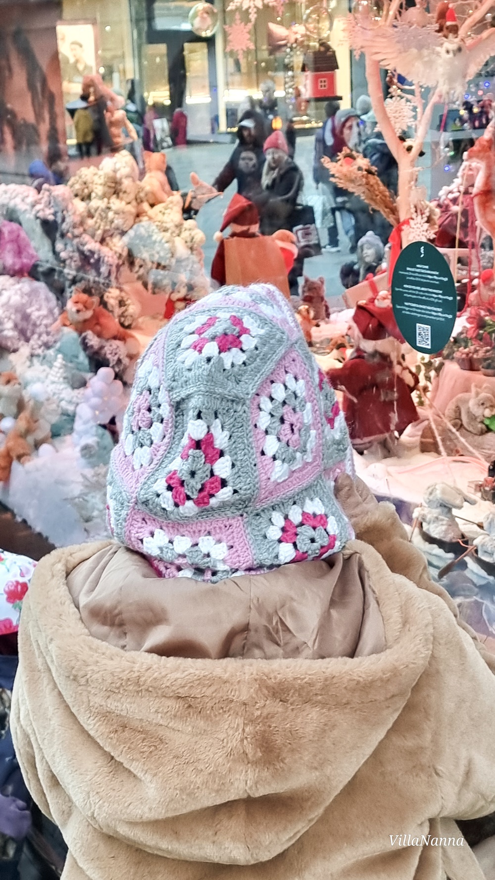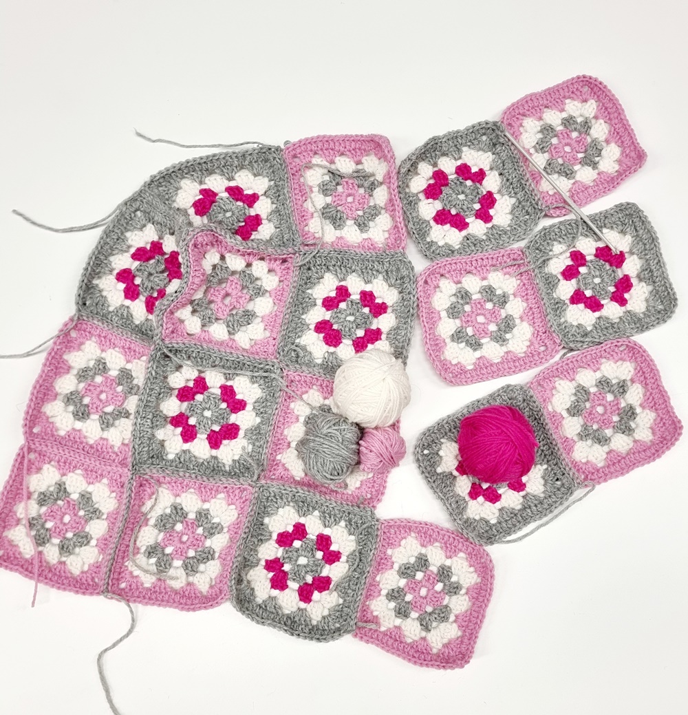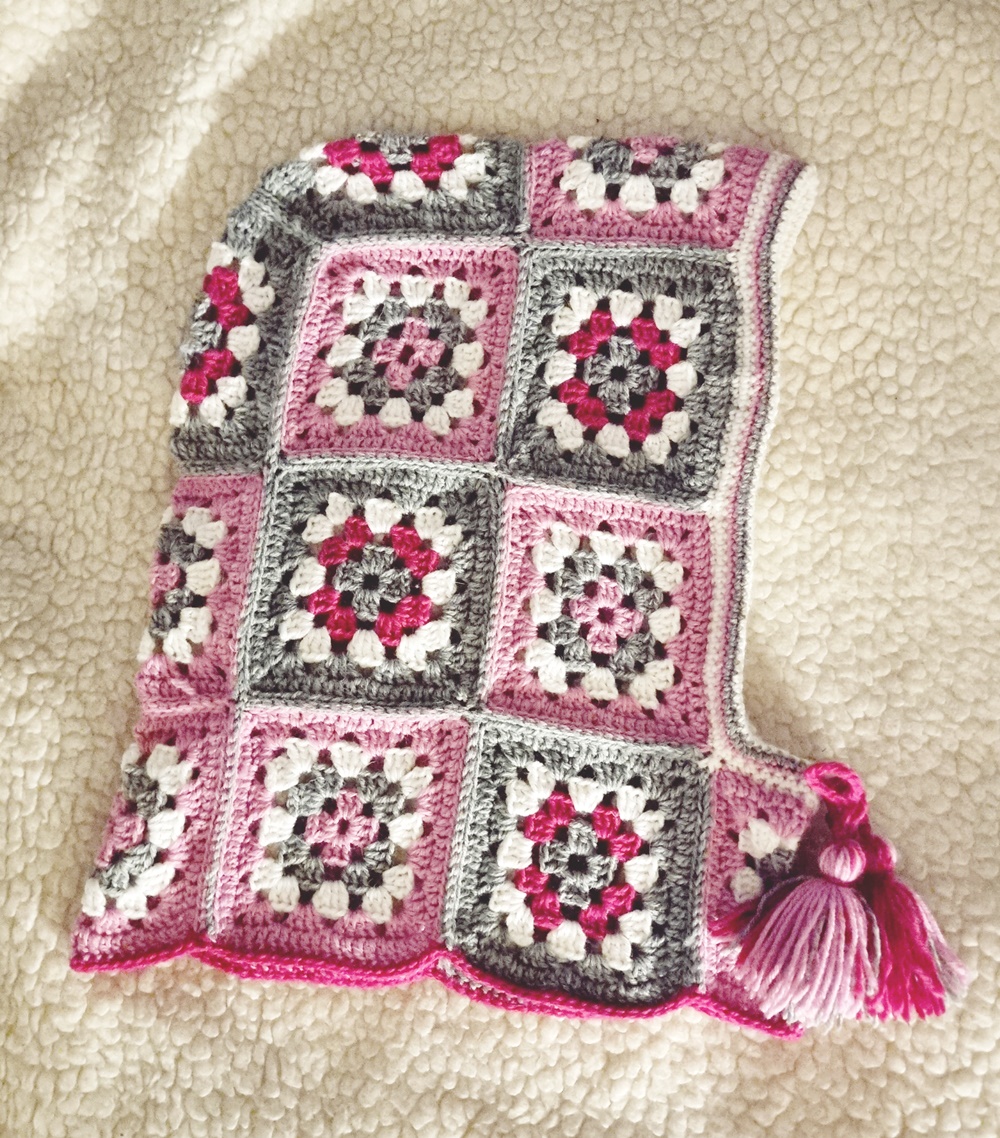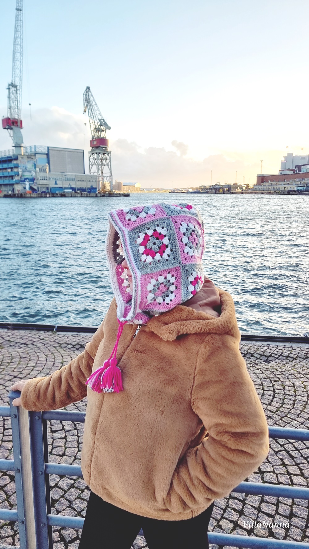 En uskonut miten vaikea on järjestellä eri neliöt järjestykseen. Tässä vaiheessa menikin aikaa paljon, sillä en toikein tykännyt mistään vaihtoehdosta. Tuskastuin lopulta niin paljon, että päätin, ettei ole niin väliä miten neliöt järjestän. Kun järejstys oli vihdoin valmis, otin kuvan, että muistan miten kaikki on laitettu ja otin koukun käteeni ja virkkasin kaikki yhteen. Tämän jälkeen oli vielä virkattava hupun reunaan nyörikuja ja siihen halusin käyttää roosasta myös yhden kerroksen. Lankaa oli siis vielä pienesti jäljellä, vaikkei sillä voinut enää tehdä isoäidinneliötä.