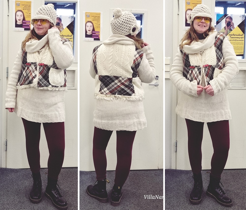 Parasta tässä vaatteiden roudauksessa varastoon ja pois varastosta on se, että tuntuu kuin aina olisi uusia vaatteita kaapissa, vaikka vaatteet olisivatkin vanhoja. Helpompi myös nähdä mitä kaikkea sitä oikein on ja miten monella tapaa sitä yhdistäisi näitä ihanuuksia toisiinsa. Olen löytänyt monet vaatteet takaisin päälleni ja se on ihan mahtavaa. Yksi suurimpia suosikkejani tällä hetkellä on liivi, jonka olen tehnyt vanhasta villahameesta sekä neulepaidasta. Vuorina liivissä on keinoturkispalanen. Tätä liiviä käytän nyt paljon. Toinen kovassa käytössä tällä hetkellä oleva vaate on minun neulomani kukonaskelpaita. Ihanan lämmin ja niin upea.
