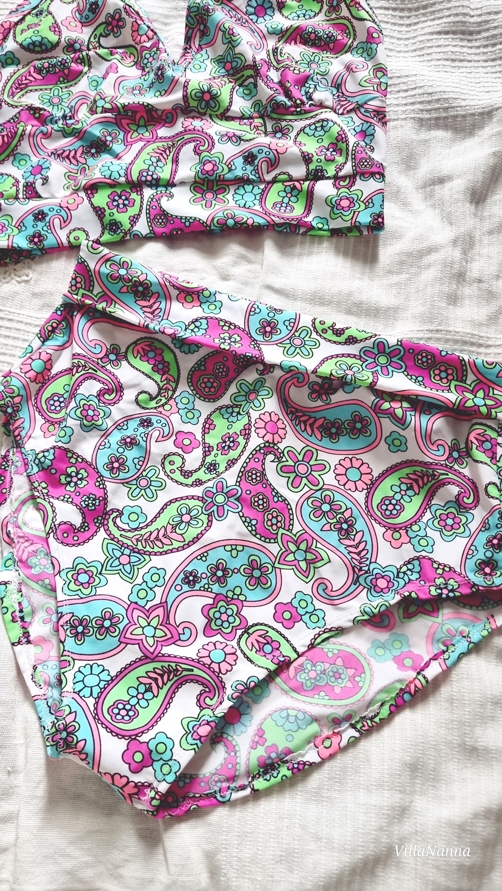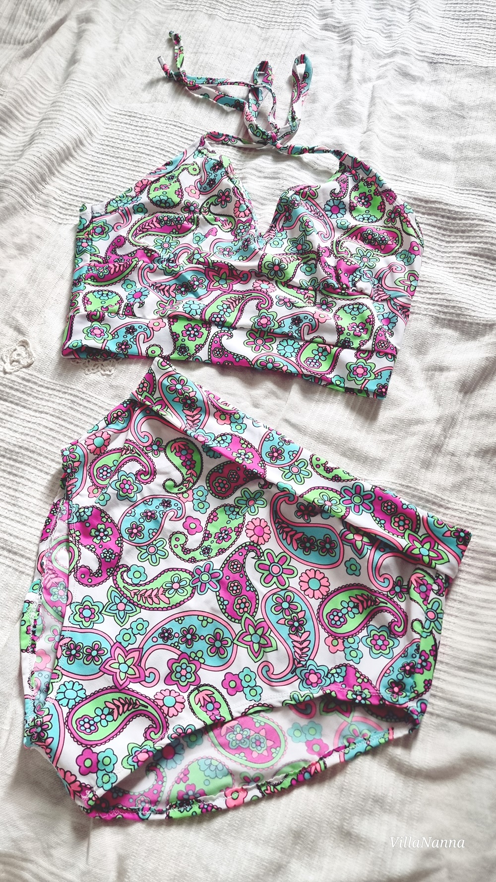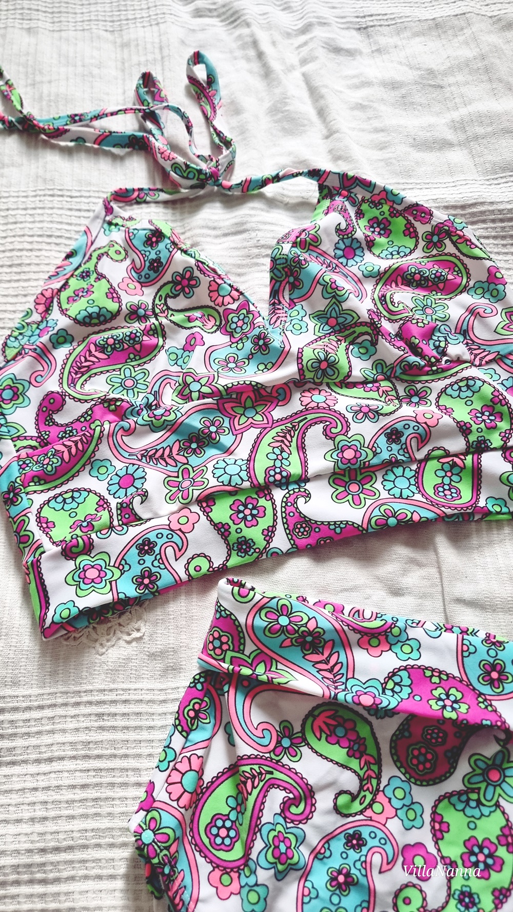 Lisäsin ylä -ja alakappaleille suikaleet ja homma oli siinä. Sain siis bikinitopin sekä korkeavyötäröisen alaosan. Minulla on olemassa tätä kangasta jäljellä ylijäämälaatikossa sen verran, että molempiin osiin ompelen kesäksi ylä -ja alaosan. Vähän erilaiset. Nyt nuo eivät oikein sovi enää yhteen, sillä housut ovat niin korkeat ja toppi tulee aika alas. Eli parempi tehdä erilaiset osat molempiin. Työ oli helppo, ja vei aikaa noin puoli tuntia kokonaisuudessaan.
