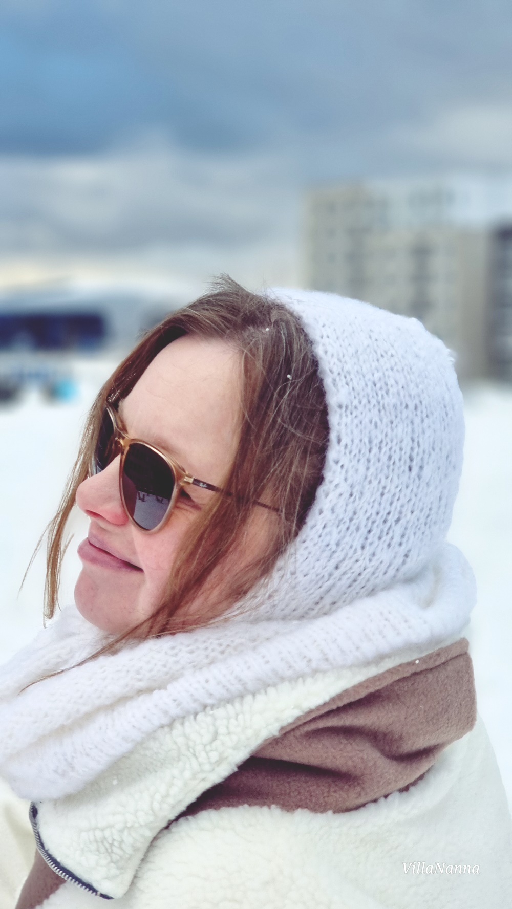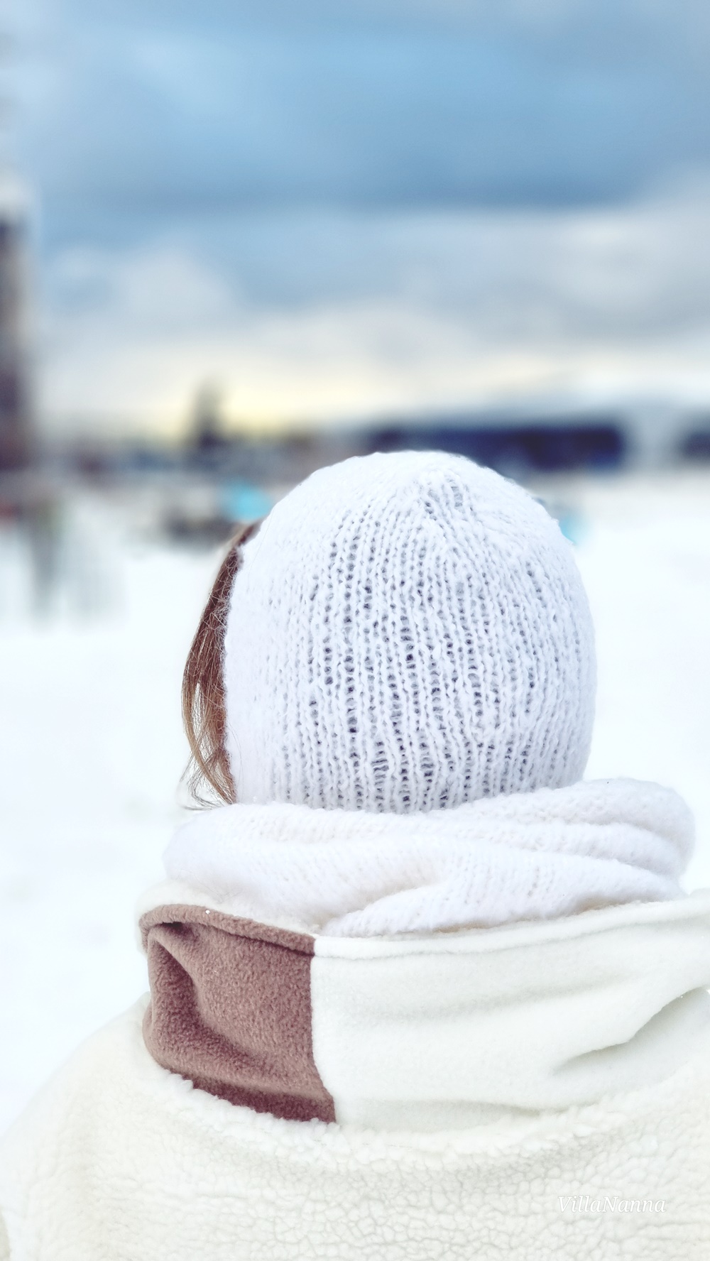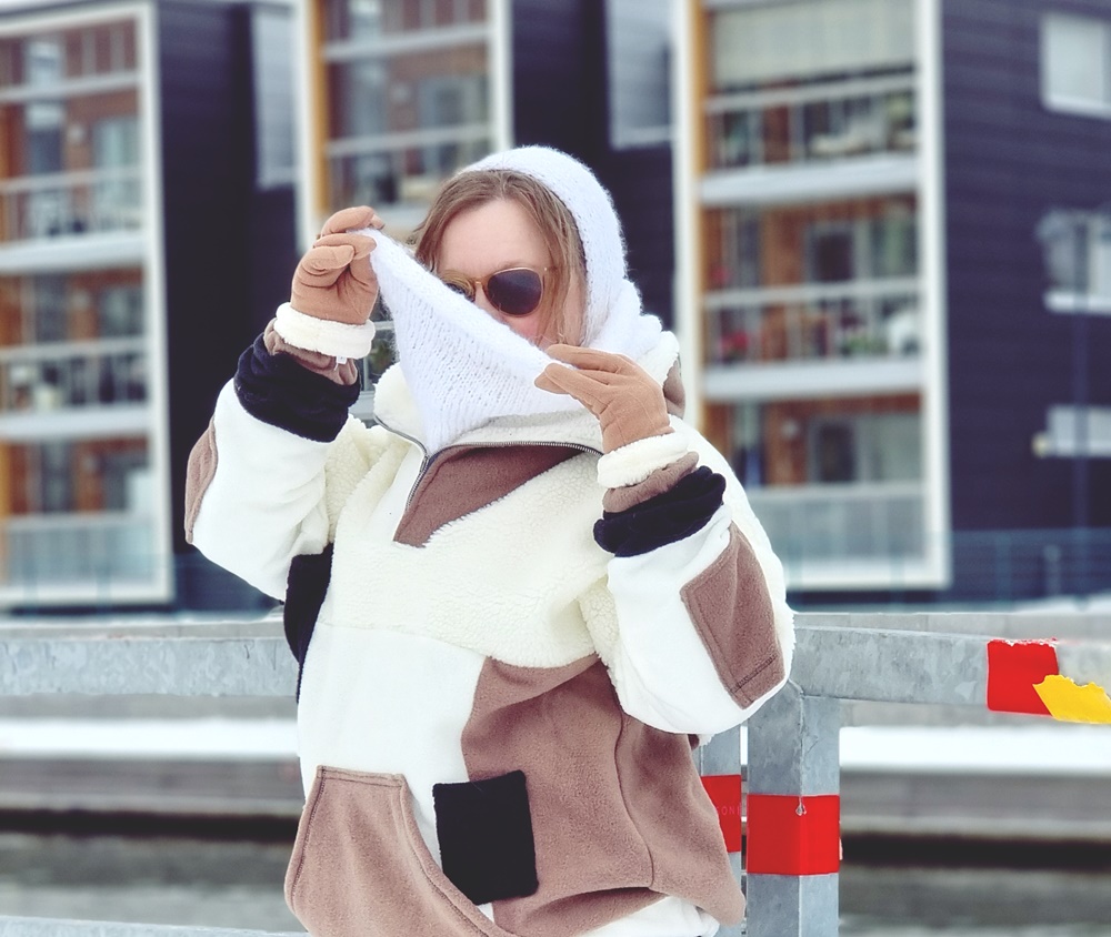 Aloitin siis ensin hilkasta, koska ajattelin, että saan kaikki langat menemään tuohon hilkkaan. Väärässä olin ja kohta oli kädessä edelleen lankaa. Jouduin hetken raapimaan päätäni ja lopulta tulin siihen lopputulokseen, että hilkka tarvitsee kaulurin. Tosin tämä kauluri on niin pitkä, että se riittää myös pään yli hupuksi, joten sitä voi käyttää yksinäänkin hyvin. Ja olenkin käyttänyt molempia erikseenkin. Ovat muuten todella lämpimiä, kun ovat neulottu pienemmillä puikoilla mitä kuuluisi. Tai olen varma siitä, että näin on.