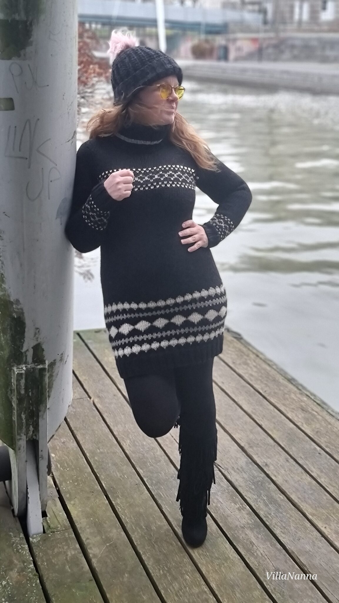 Mekon olen neulonut kauan sitten ja olin laittamassa tätä jo poiskin, mutta halusin testata mekkoa päälleni vielä ennen poistoa. Noh, en taida sitä pois laittaa nyt kuitenkaan. Mahtuu hienosti päälle vielä.