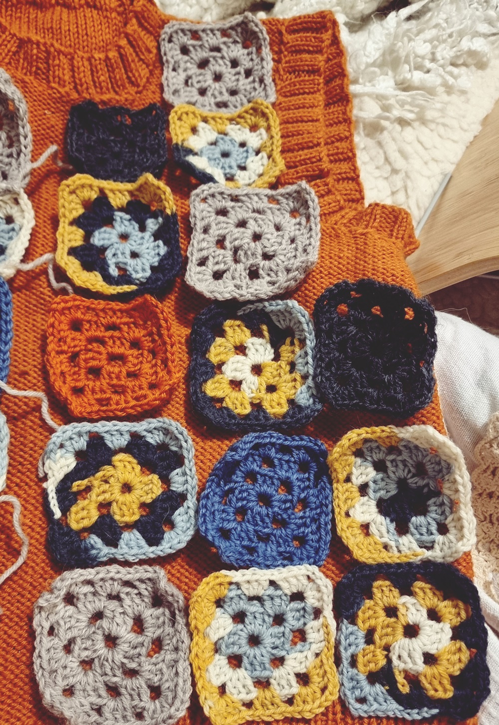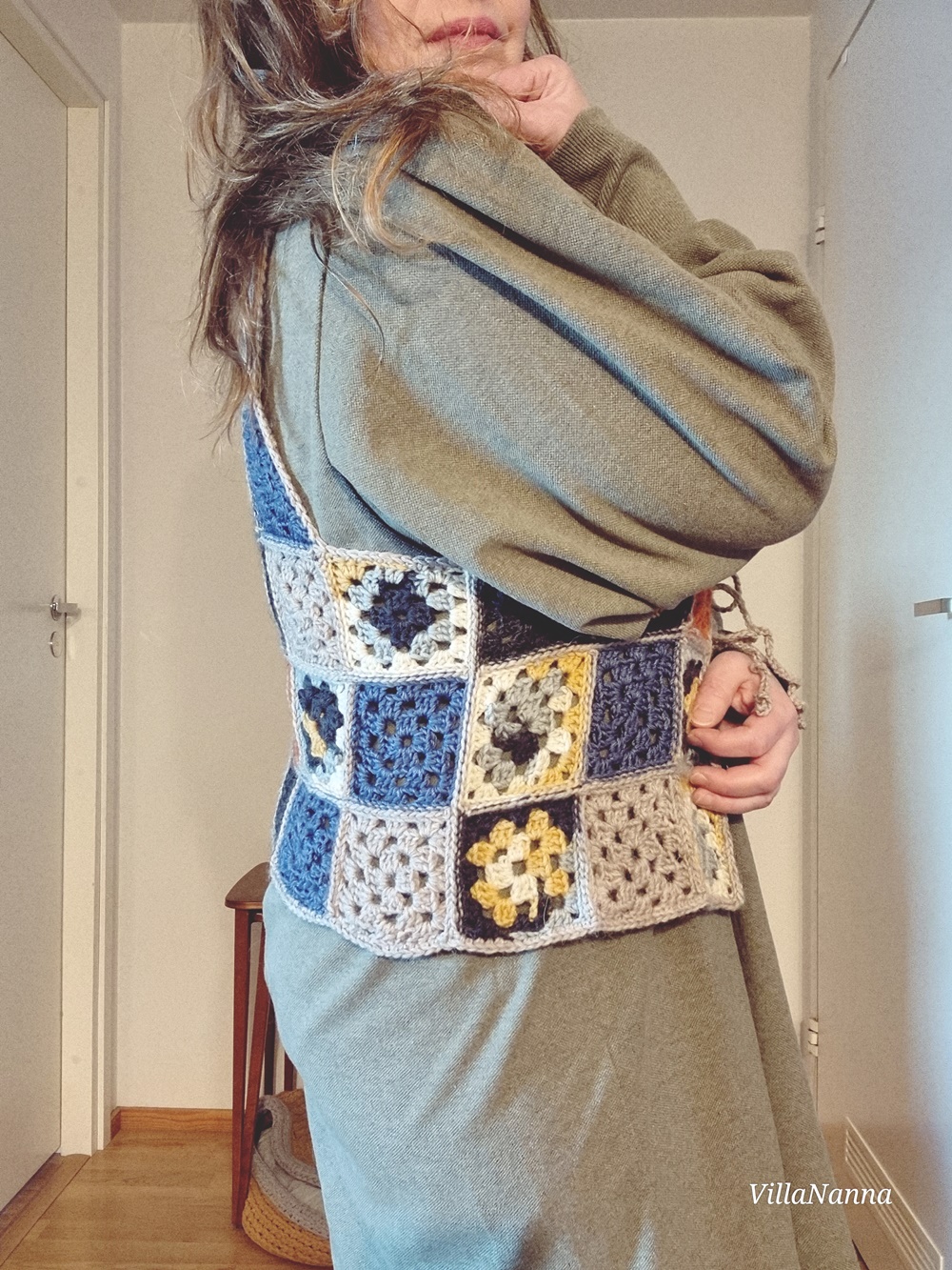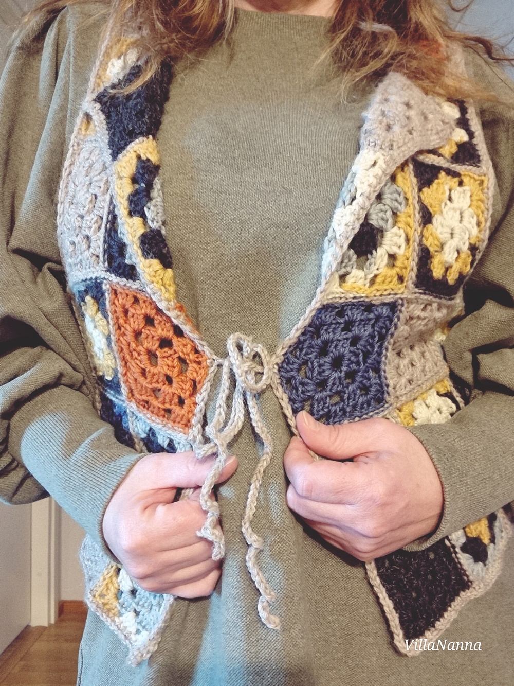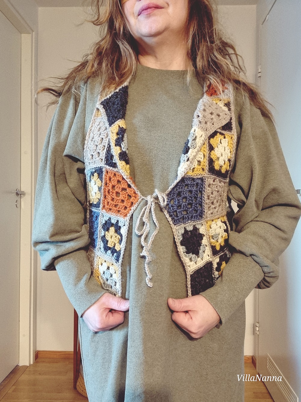 Isoäidinneliöt ovat nyt vallaanneet tilaa, ne ovat ihan paras tapa saada langanjämät pois nurkista, mutta sitten on vaikeuksia keksiä niistä jotakin järkevää. Koska neliöitä ei tullut niin paljon, että niistä olisi tullut neuletakkia tai mekkoa, niin lopulta lähdin tekemään liiviä. Lopputulos voisi olla parempikin, mutta hyvin toimii näinkin ja sopii niin hyvin tuon minun Globe hope -mekon kanssa.
