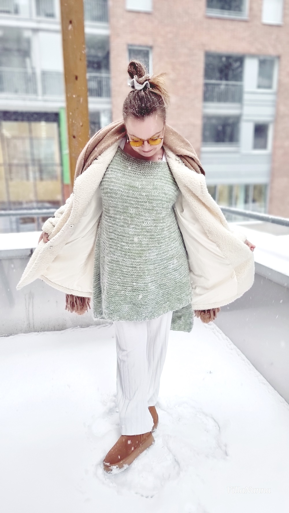 Neuleesta tuli ihan vahingossa noin iso, mutta se ei tosiaan haittaa yhtään mitään. Suunnittelin, että olisin sen purannut ja tehnyt uuden, mutta olen jälkeen päin sitten unohtanut koko asian ja innostunut käyttämään sitä ihan näin, neulehousujen kanssa. On muuten ihanan näyttävä asu ja on lämmin. Sopi todella hyvin eiliselle pakkaspäivälle tai oikeastaan illalle. Oli lämmin tulla kotiin kun pakkanen jo paukkui.