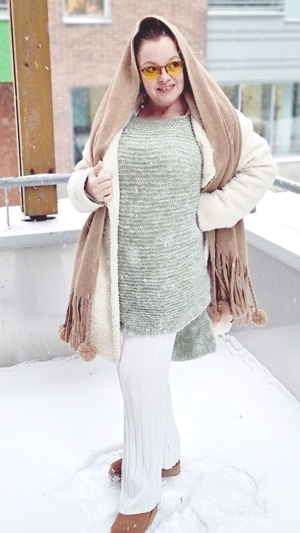 Minulla on ollut aika flunssainen olo siitä lähtien kun flunssa tosiaan kaatoi minut sänkyyn ennen meidän reissua. Eilen oli kaikkein pahin olo ja sen vuoksi halusin kääriytyä johonkin sellaiseen, jossa on miellyttävä olla. Mikään ei kiristä ja on lämmin. Ja tietenkin ajattelin myös sitä, että miten värit vaikuttaa olotilaan. Siksi lopulta päältä löytyi vihreää ja valkoista. Vihreä on uudistumisen väri, joka poistaa stressiä ja rauhoittaa. Sopii siis hyvin tällaiseen flunssaiseen oloonkin. En siis yhtään tiedä onko flunssa vai johtuuko olotila nyt jostakin ihan muusta.