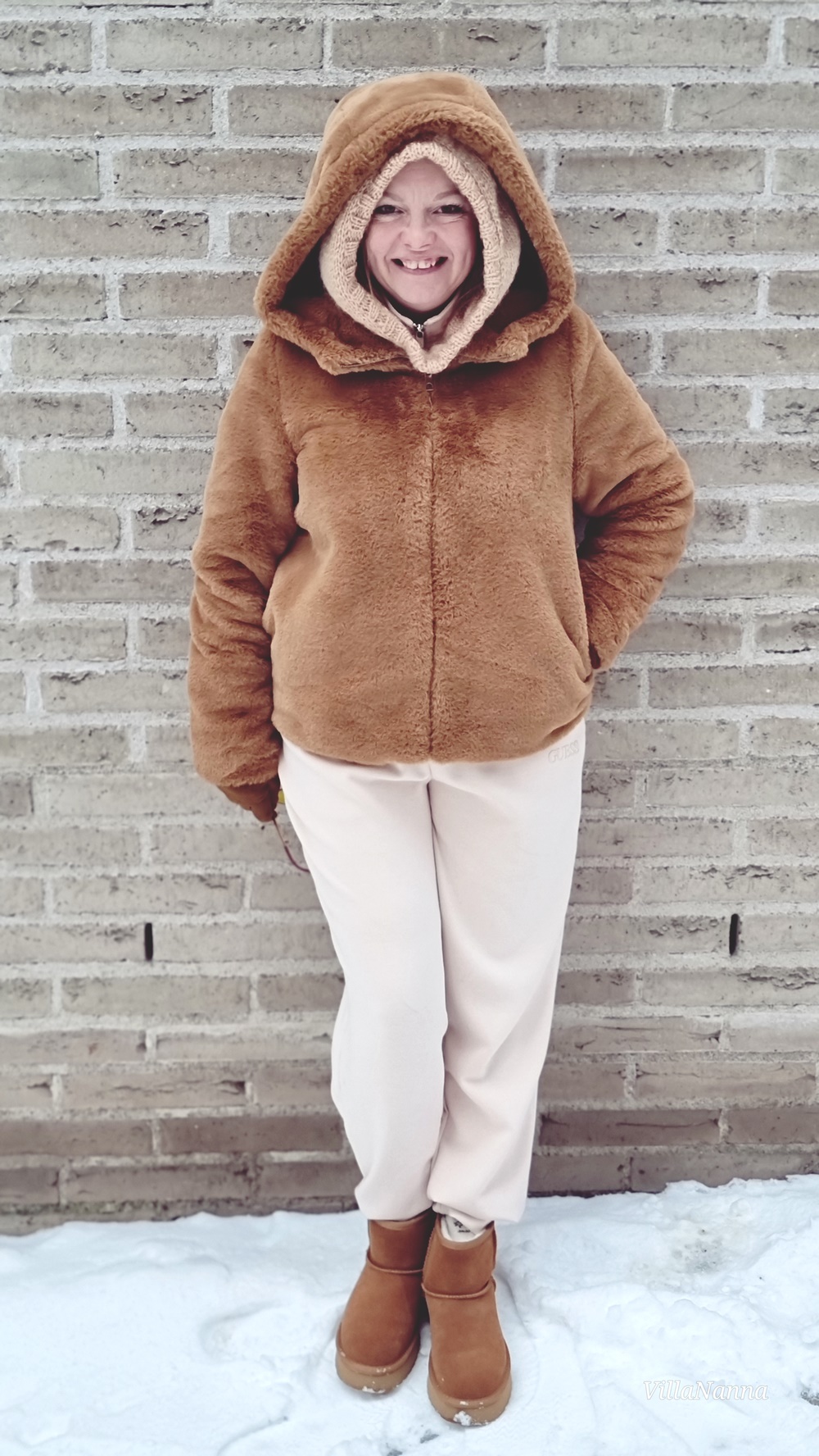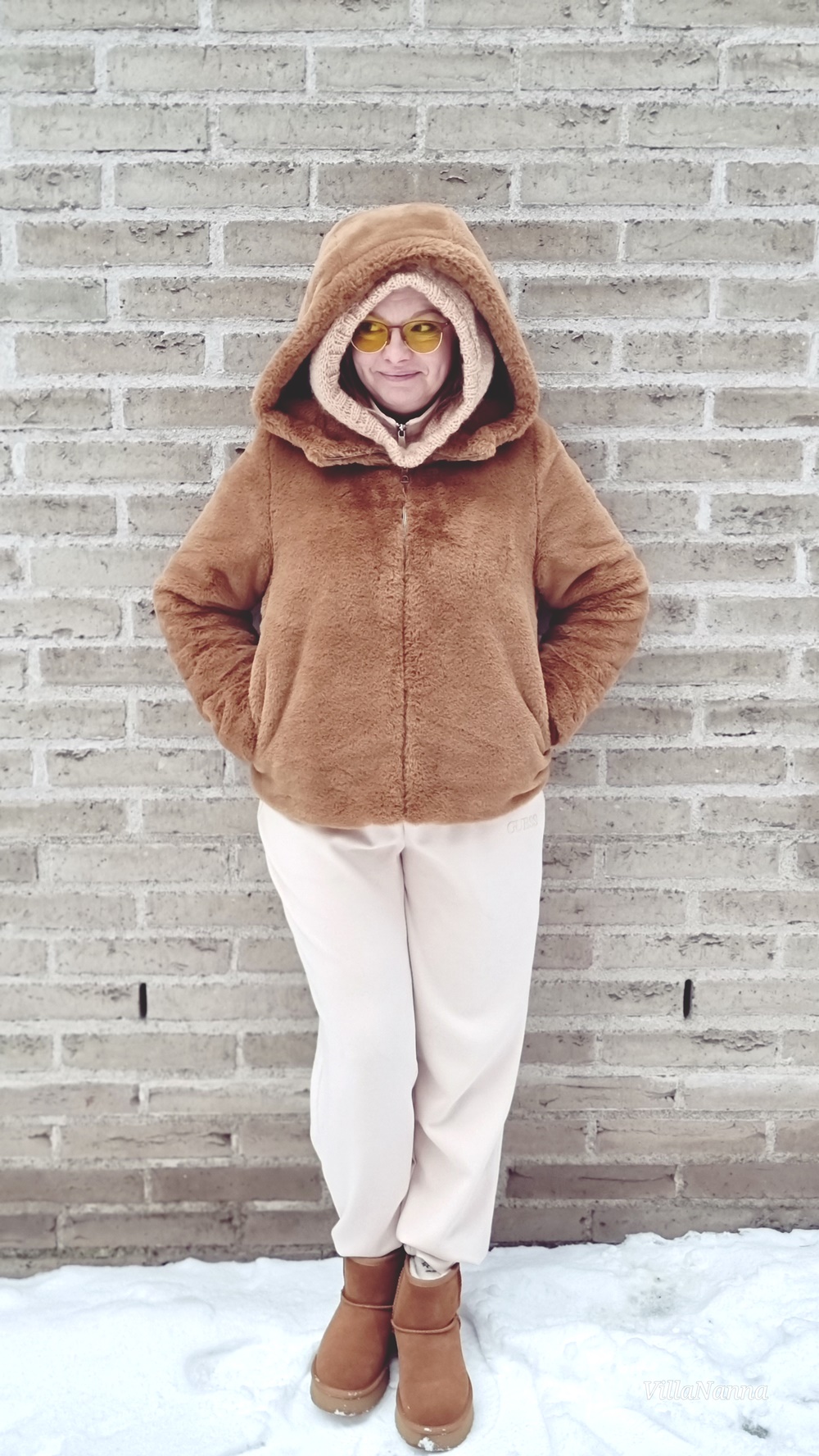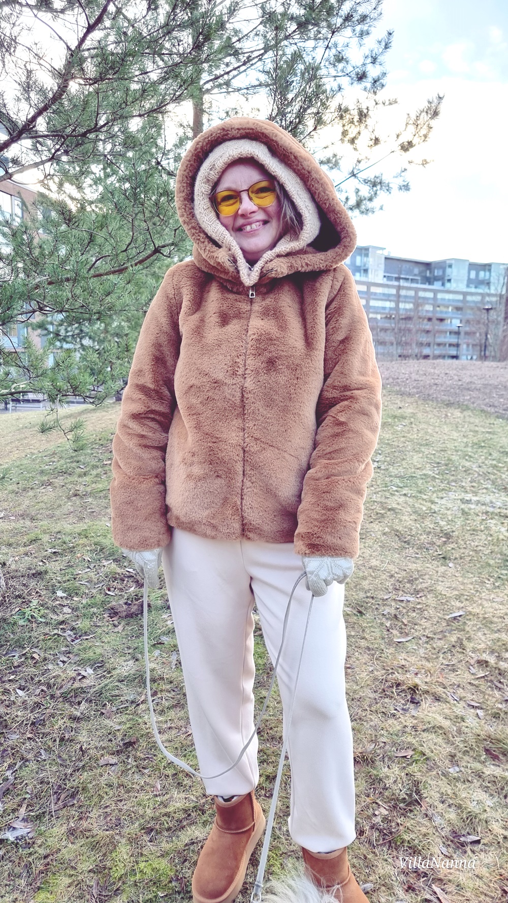 Päätin valita asukseni ihan vain rennon oloasun, joka oli päälläni ensimmäistä kertaa meidän Losin matkalla. Juuri tällaisessa asussa tykkään matkustaa, mutta nykyään asu on ihan vain oloasuna ja oikeastaan aina joka paikassa päälläni. Ihanan pehmeää materiaalia, joten ihonikin tykkää. Mutta sitten ajattelin, että ruskea karvatakki sopisi hyvin tuollaisen rosan värisen puvun kanssa ja balaclava myös päähän. Asu valmis.