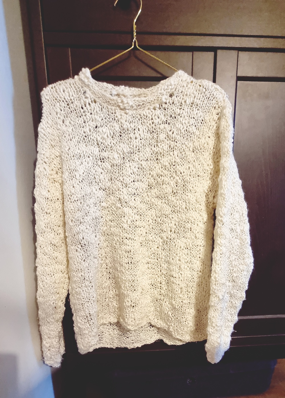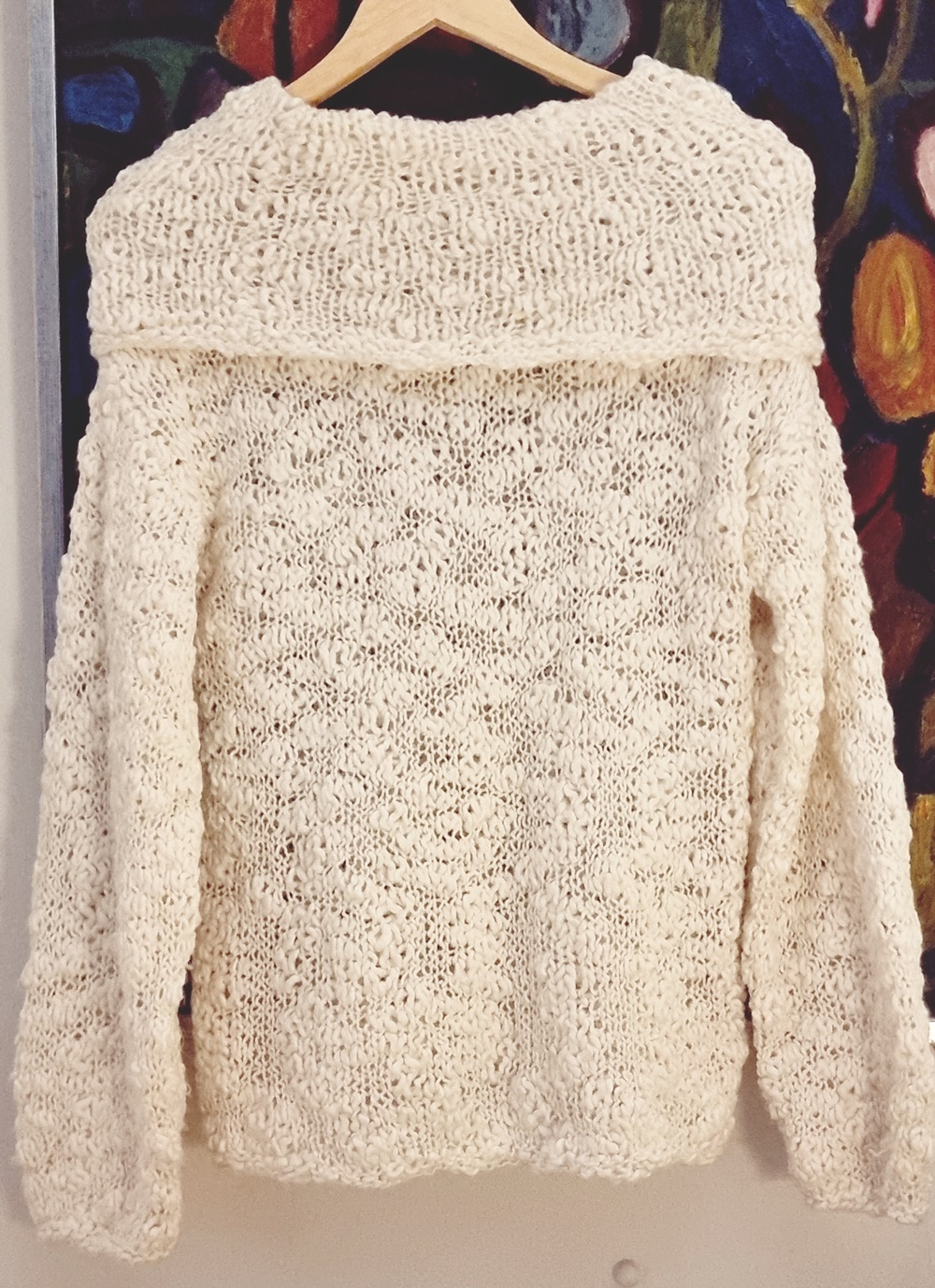 Tammikuussa julkaisin tasarahapäivien löytöni ja joukossa oli aivan ihana jonkun toisen neuloma ihana isokauluksinen neule. Neuleen lanka on juuri sellaista erikoislankaa, josta pidän. Se antaa ihanaa tekstuuria neuleelle. Pakkohan se oli ostaa pois ja toivoa, että kaulus toimisi niin kuin kuvittelin. Noh, eipä se toiminut. Kaulus oli enemmän sellainen ylisuuri roikkuva, vesiputoustyyppinen kaulus. Sellainen ei oikein toimi enää meikäläisellä, joten päätin purkaa kauluksen pois kokonaan.