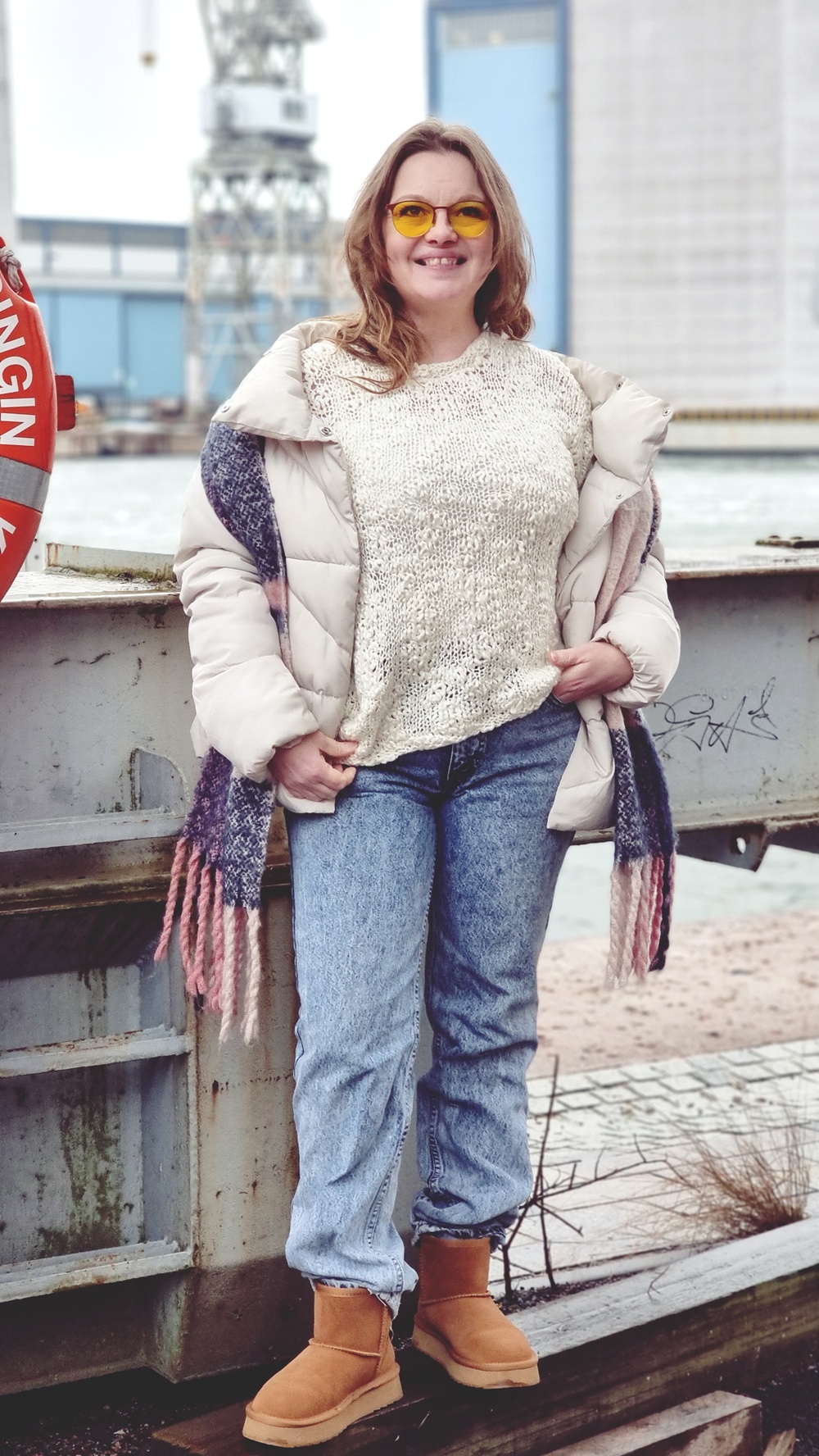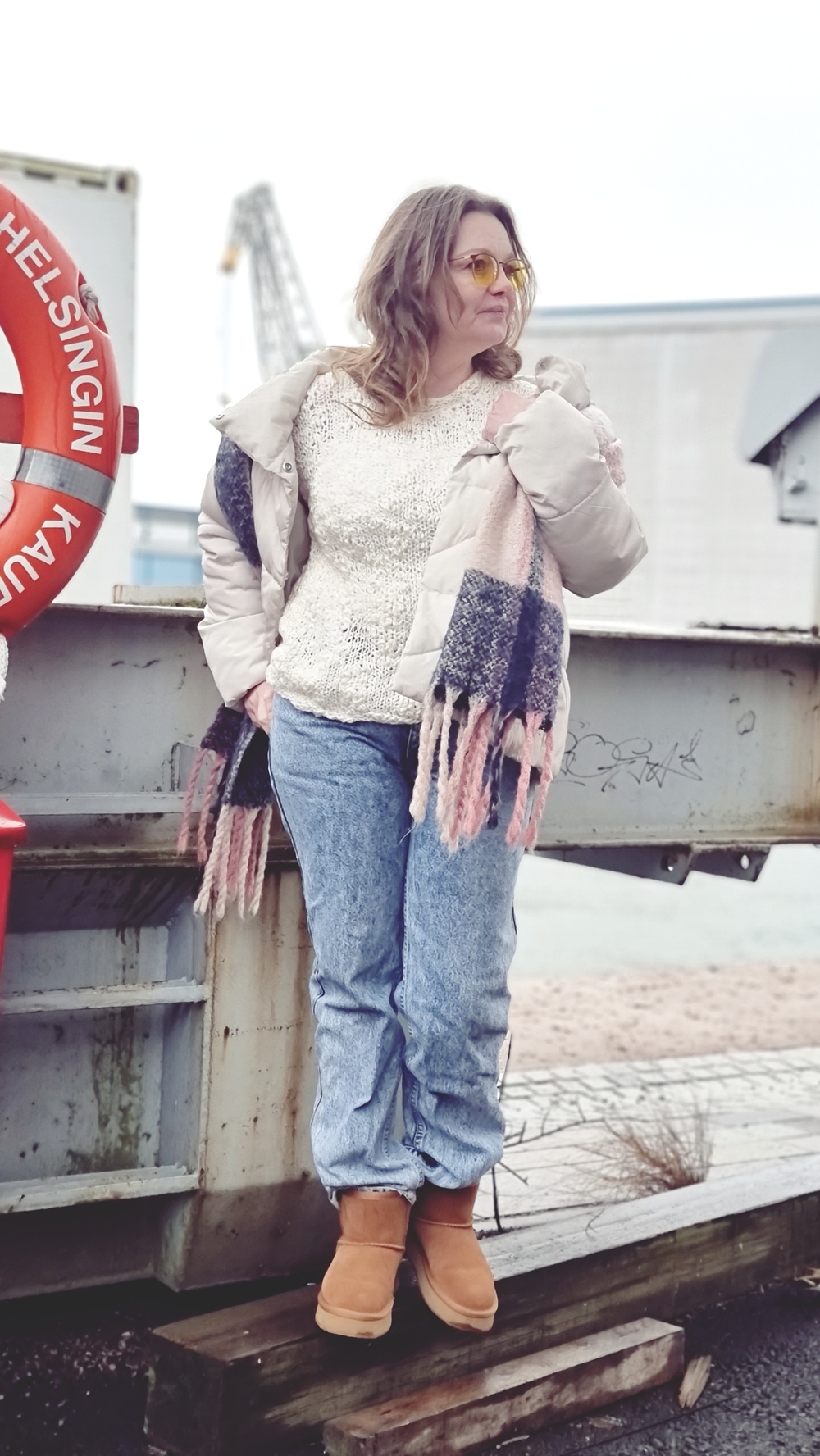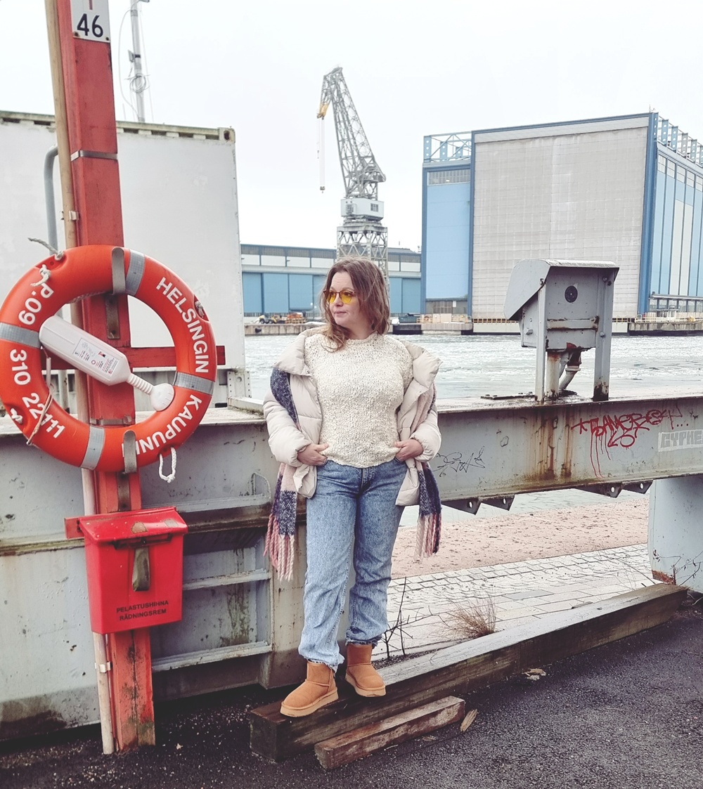 Purkamisen jälkeen neuloin puikoilla 5mm uuden kauluksen. vain kolme kerrosta ensin oikein, sen jälkeen nurin ja viimeinen kerron oikein ja lopuksi päättelin silmukat löyhästi. Nyt kaulus toimii minulla paremmin ja sopii paitaan paremmin. Yhdistin paidan eilen lumipestyihin Leviksiin, jotka olen myös muutama vuosi sitten ostanut UFFista. Kyseiset farkut ovat kakkoslaatua, mutta ihan täydelliset omaan käyttööni.