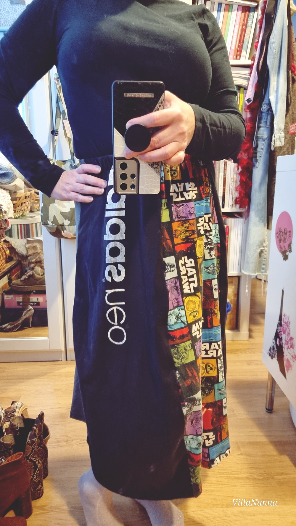 Kaapissa oli läjä leggareita, jotka eivät oikein enää istuneet minulle, siksi ne on heitetty laatikkoon. Päätin sitten yhdistellä niitä toisiinsa ja tehdä pari hametta. Nythän niitä voikin sitten käyttää miten haluaa. Trikoo