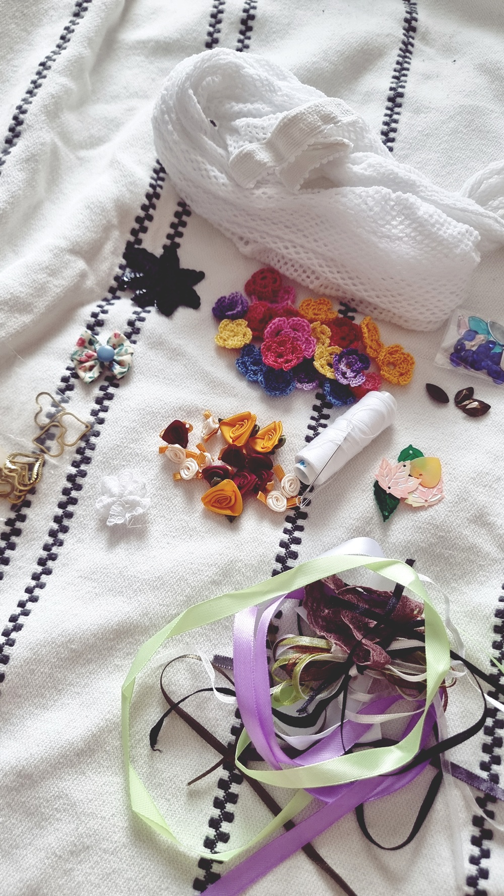 Koska en halua ostaa mitään, niin kaivelin lankalaatikoita ja löysin eri värisiä helmilankoja, siitä lähti ajatus, että virkkaan helmilangasta pikkukukkia, sen lisäksi löysin erilaisia satiinikukkia askartelulaatikon pohjalta. Myös rikkinäisiä koruja ja paitojen olkapäiltä leikattuja silkkinauhoja. Näillä lähdin liikkeelle. Lopulta en kaikkea sitä krääsää ommellun sukkiksiin, koska ei ollut tarvetta. Mutta näistä tuli aivan ihanat.