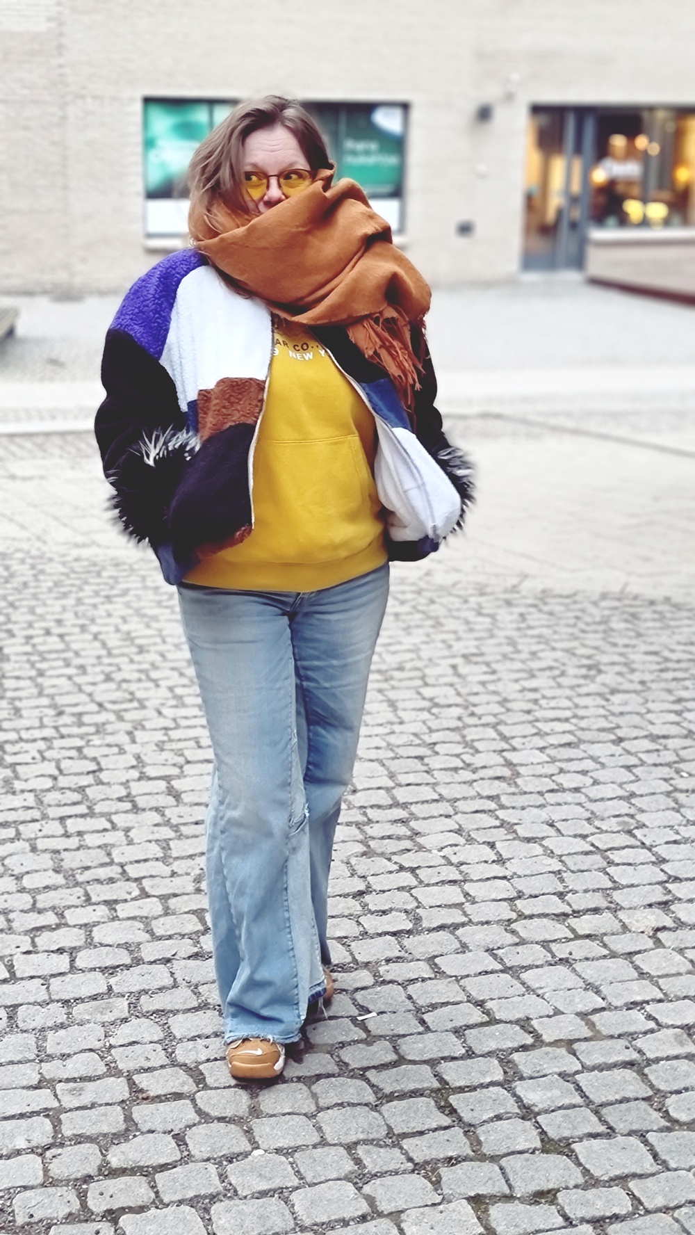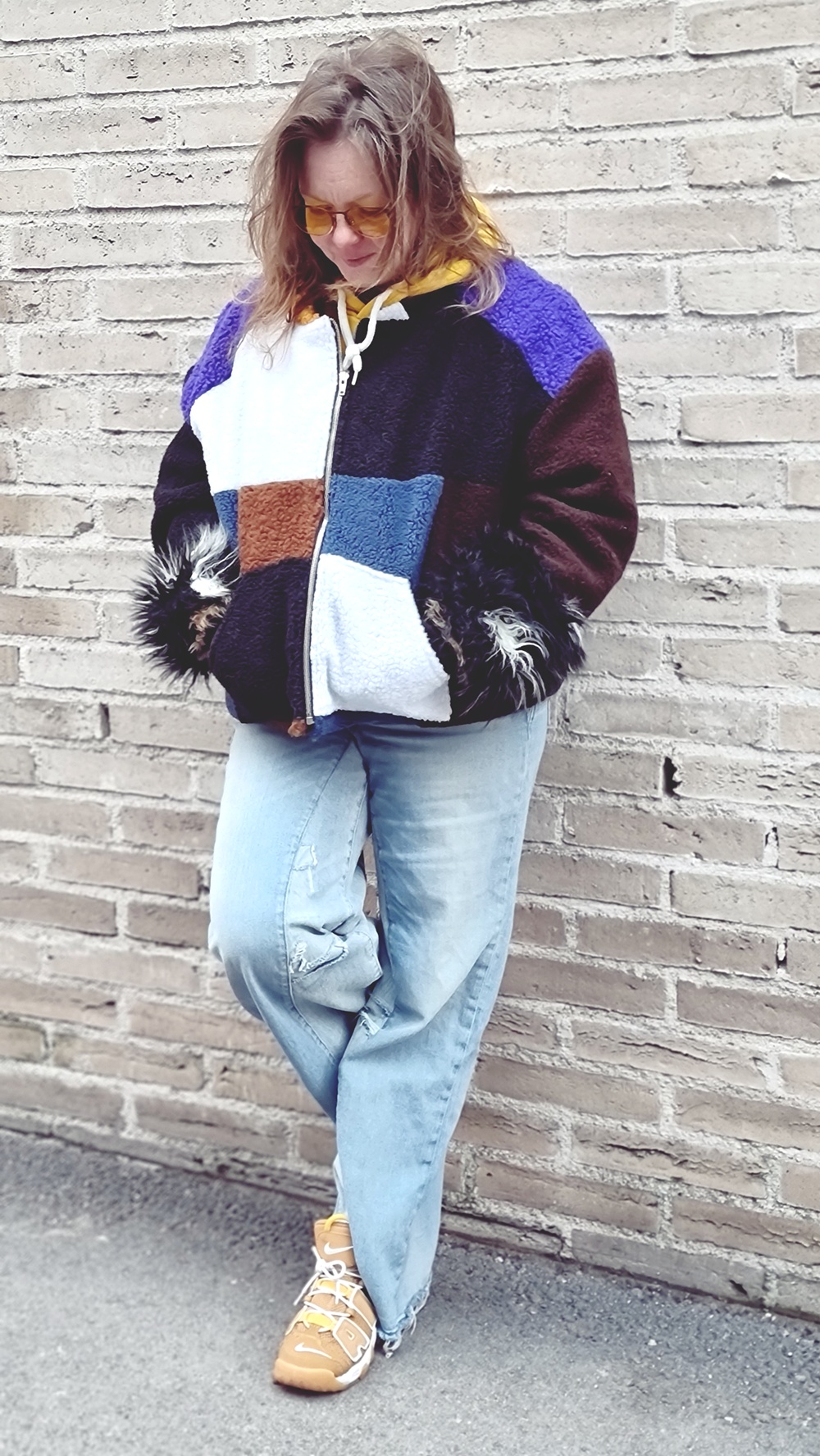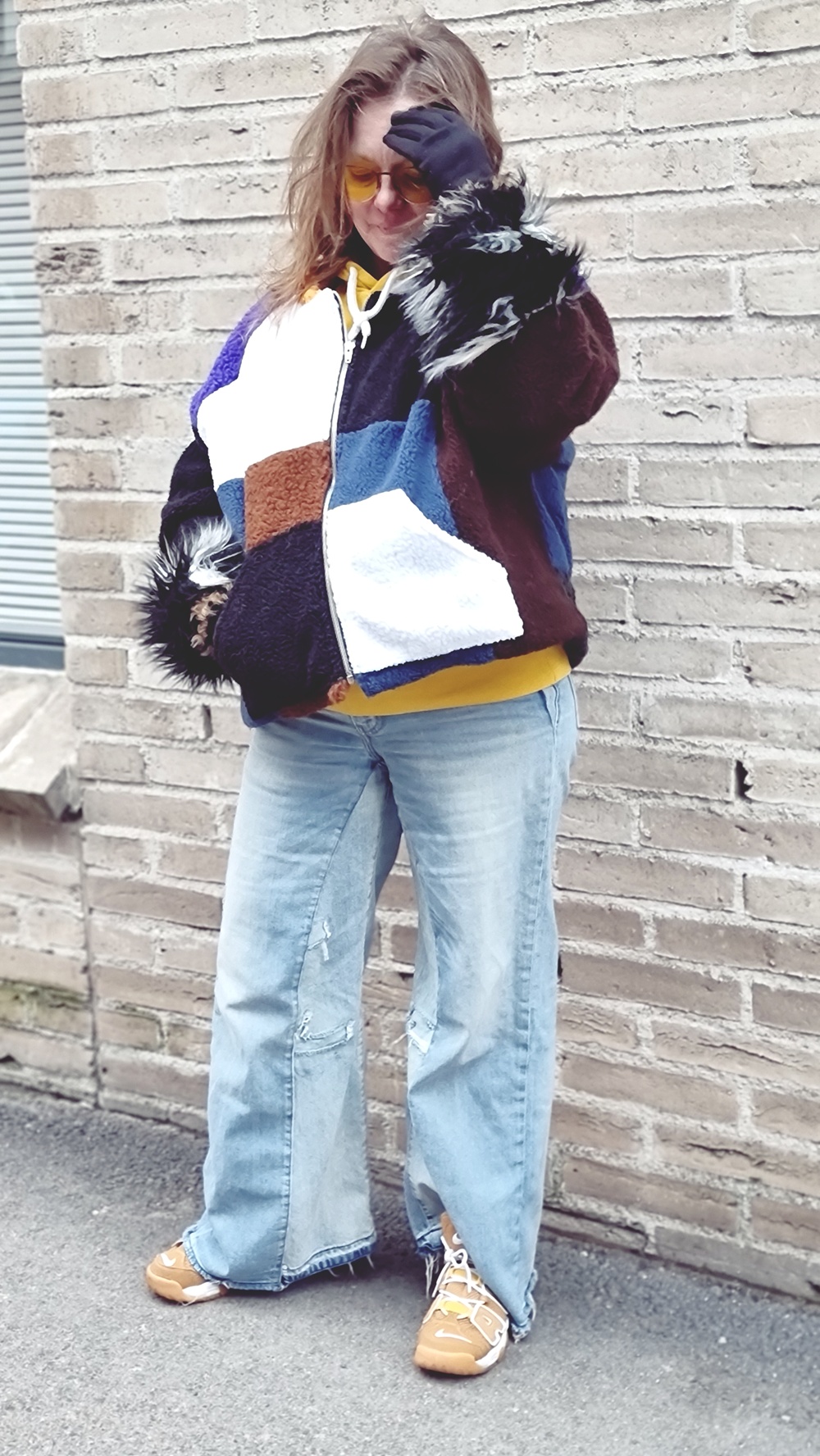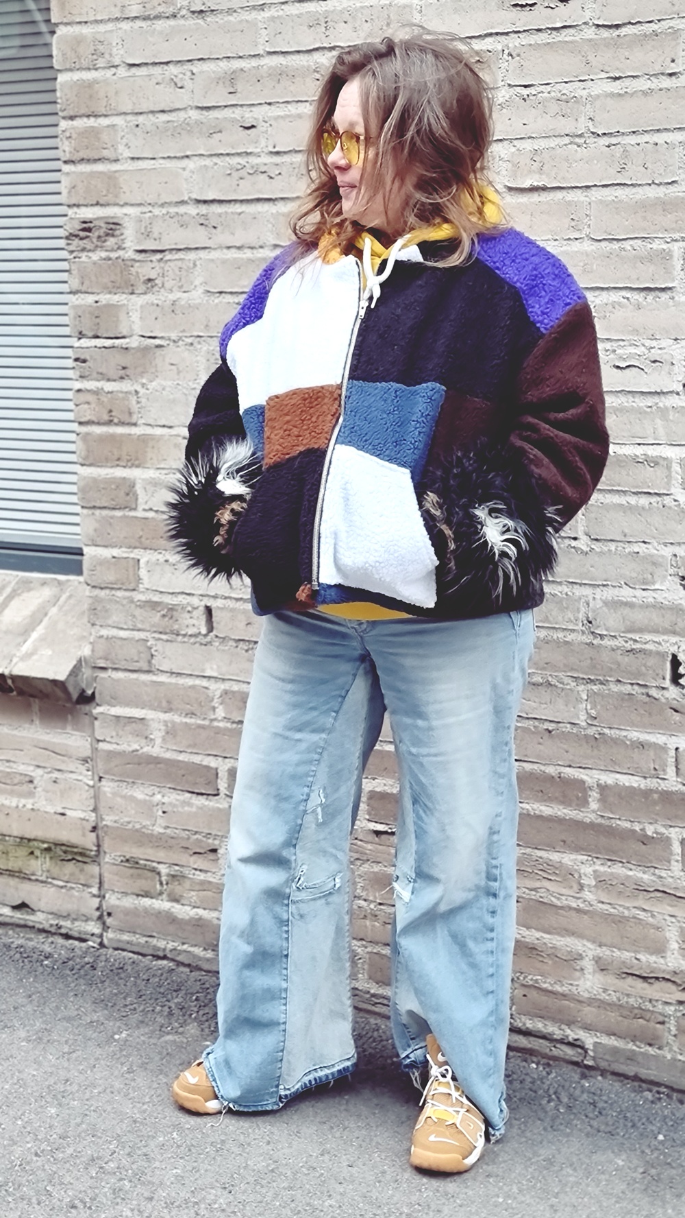 Takkiahan voi käyttää oikeasti minkä tahansa vaatteen kanssa. Mutta näin muuton keskellä on laitettava päälle mitä sattuu enää kaapissa olemaan ja tällä kertaa ne oli minun tuunaamat farkut. Kahdet liian pienet farkut on yhdistetty toisiinsa ja vyötäröä on korotettu. Nämä ovat siis ne minun the farkut ja farkkujen kanssa yhdistin sinapinkeltaisen hupparin. Kaiken kruunaa minun ihana takkini. jalkoihin vetaisin Siisti kirppikseltä löytämäni Niken lenkkarit ja kaulaa lämmittää Kierrätyskeskuksesta löytynyt kaulahuivi. Asu on täydellinen.