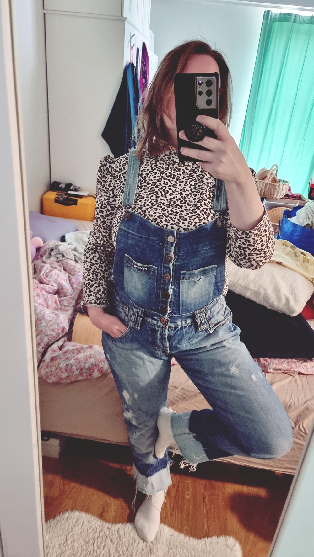 Takin alle puin itse tehtyä. Poolopaita on tehty itse ja farkkuhaalarit on tuunattu vanhoista farkuista. Nämä päällä fiilis nousee korkealle.