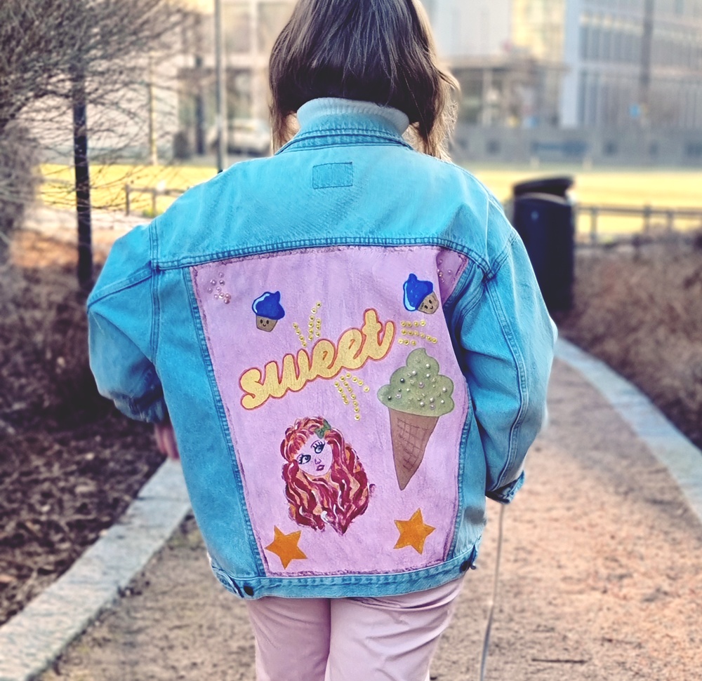 Tämä takki ei ole vain vaate – se on tarina. Ja kaikki alkoi Kierrätyskeskuksen ilmaisosastolta, josta nappasin vanhan farkkutakin ”ihan vaan kokeeksi”. Kulahtanut, muodoton ja kaikin tavoin… noh, ei ihan L.A.-muotia. Mutta sitten astui kuvaan mun mies, pensselit ja visionäärinen hullutus. Tekstiilimaalit, jäätelöt, glitterit, tähtiä ja söpö pastellisankaritar – yhdessä illassa takista tuli taideteos. Ja viime hetkellä valmiiksi ennen meidän lentoa Los Angelesiin! (todellisuudessa teoksen tekoon meni kaksi vuotta).