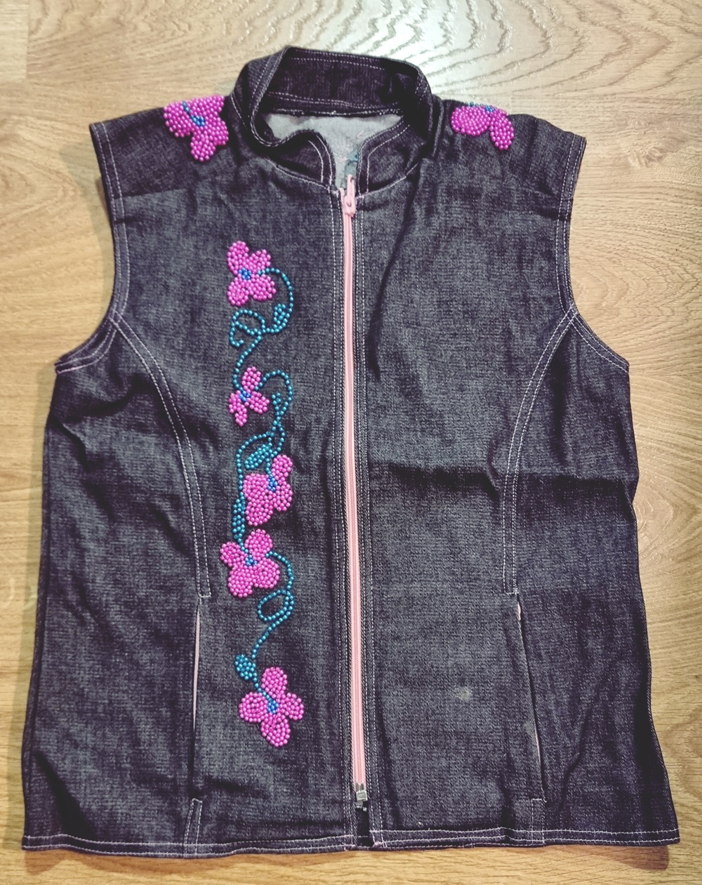 - Tämä liivi kuuluu samaan sarjaan farkkujen kanssa, johon kirjailin omin käsin jokaisen helmen. Olen siis tehnyt tytölle myös farkut tällä tyylillä. Homma kesti pitkään, sillä jokaisen yksittäisen helmen ompelu ei ole ihan hetkessä tehty.