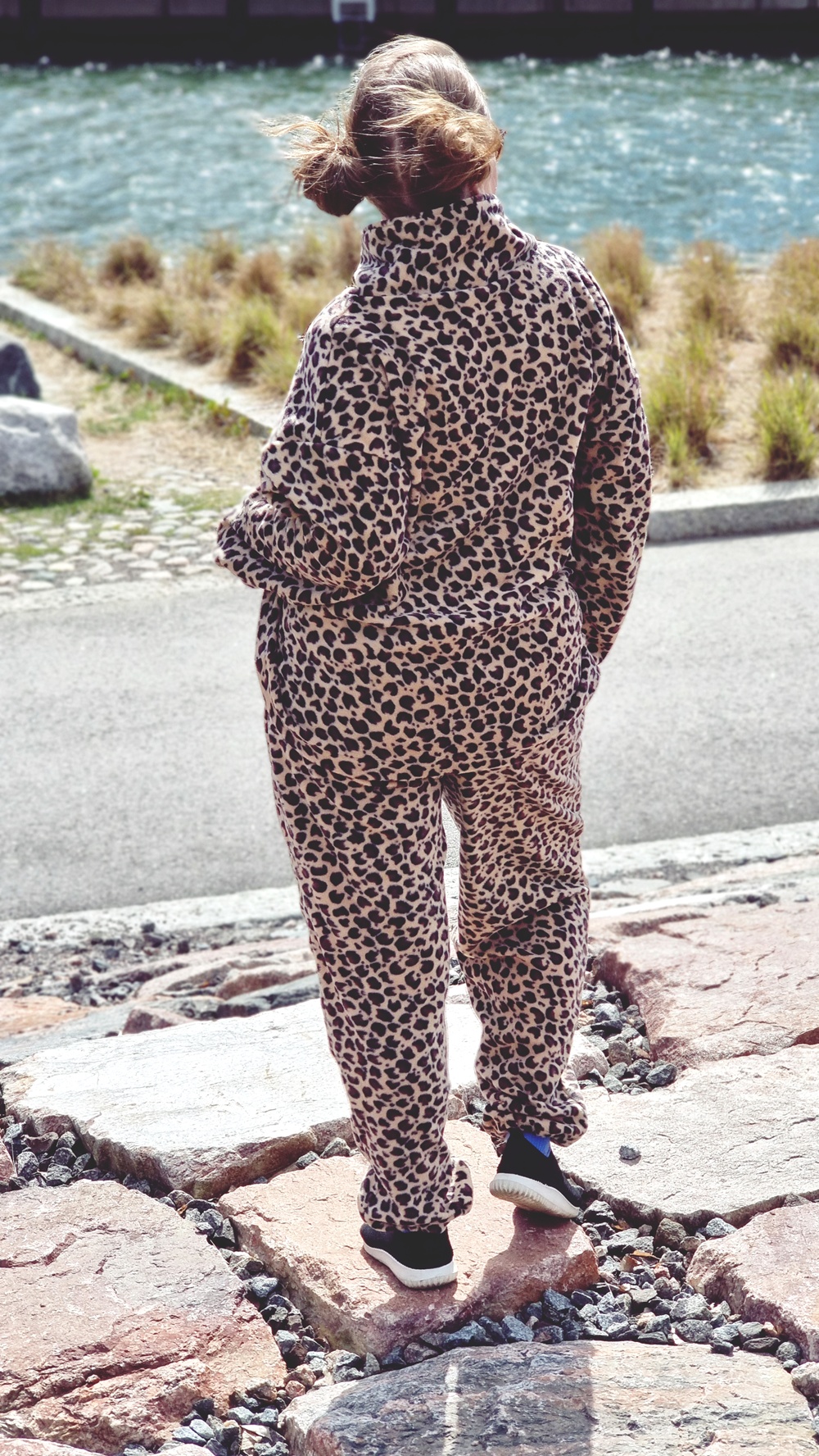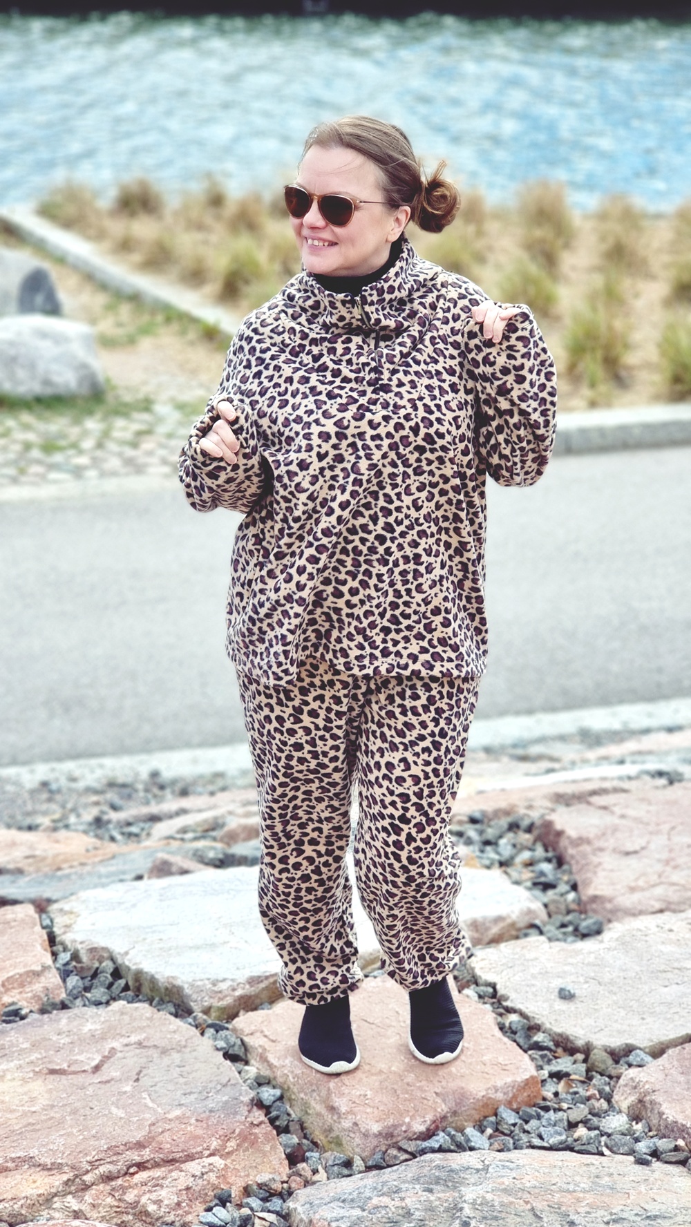 Tämä leopardikuvioinen asu ei ole vain lämmin ja mukava, se kertoo myös tarinaa. Materiaali on kierrätetty kaapin perältä, ommeltu rakkaudella ja käyttöön vuosien tauon jälkeen. Polyesterifleece ei ole pahis, kun sen kanssa eletään vastuullisesti: tiedostetaan sen hyödyt ja haitat ja tehdään fiksuja valintoja.