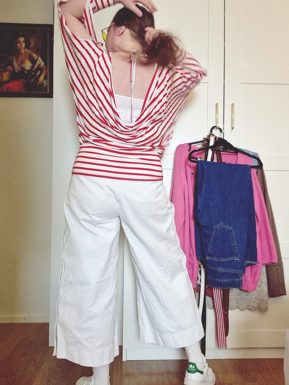 Tämä punavalkoraidallinen paita on yksi niistä ompeluprojekteista, jotka syntyi täysin fiiliksellä. Vuosi oli 2013, kahvi kylmeni koneen vieressä ja kangaspala huusi: ”Tee minusta jotain!”. Ja minähän tein. Ilman kaavaa, ilman stressiä, ja katsokaa nyt tätä! Selkäpuolella on rento laskos, joka paljastaa just sopivasti bikininarun (tai tässä tapauksessa topin), ja fiilis on vähän niin kuin olisit unohtanut kääntää paidan oikein päin, mutta tyylillä. Kymmenen vuotta myöhemmin, tämä paita on edelleen hengissä. Ompelujälki ei ehkä kestäisi muotituomareiden suurennuslasia, mutta kyllä se kestää arjen, peilin ja kameran.