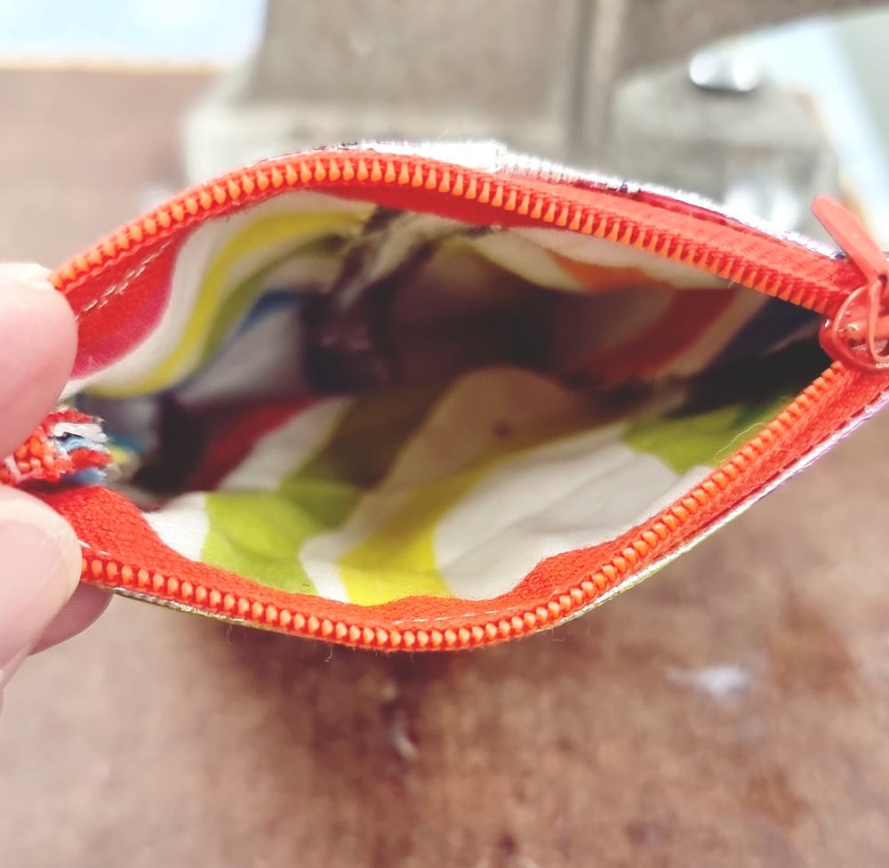 - Aseta vetoketju niin, että se tulee pussin yläreunaan. Ompele ensin vetoketju vuorikankaaseen ja sitten nuudelipussiin, näin saat siistin sisäpuolen ja tukevan kiinnityksen.